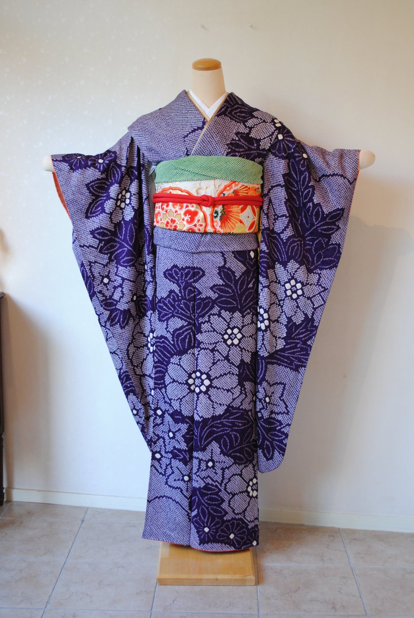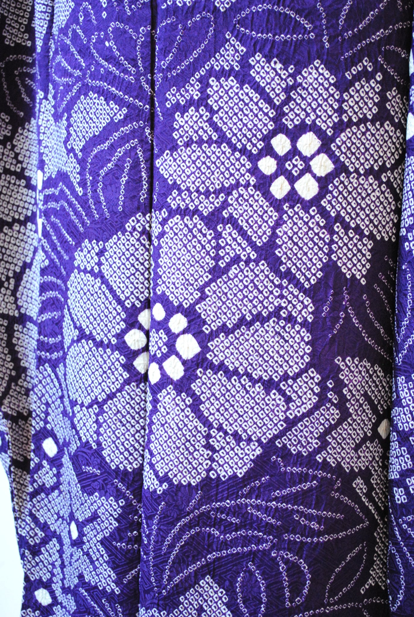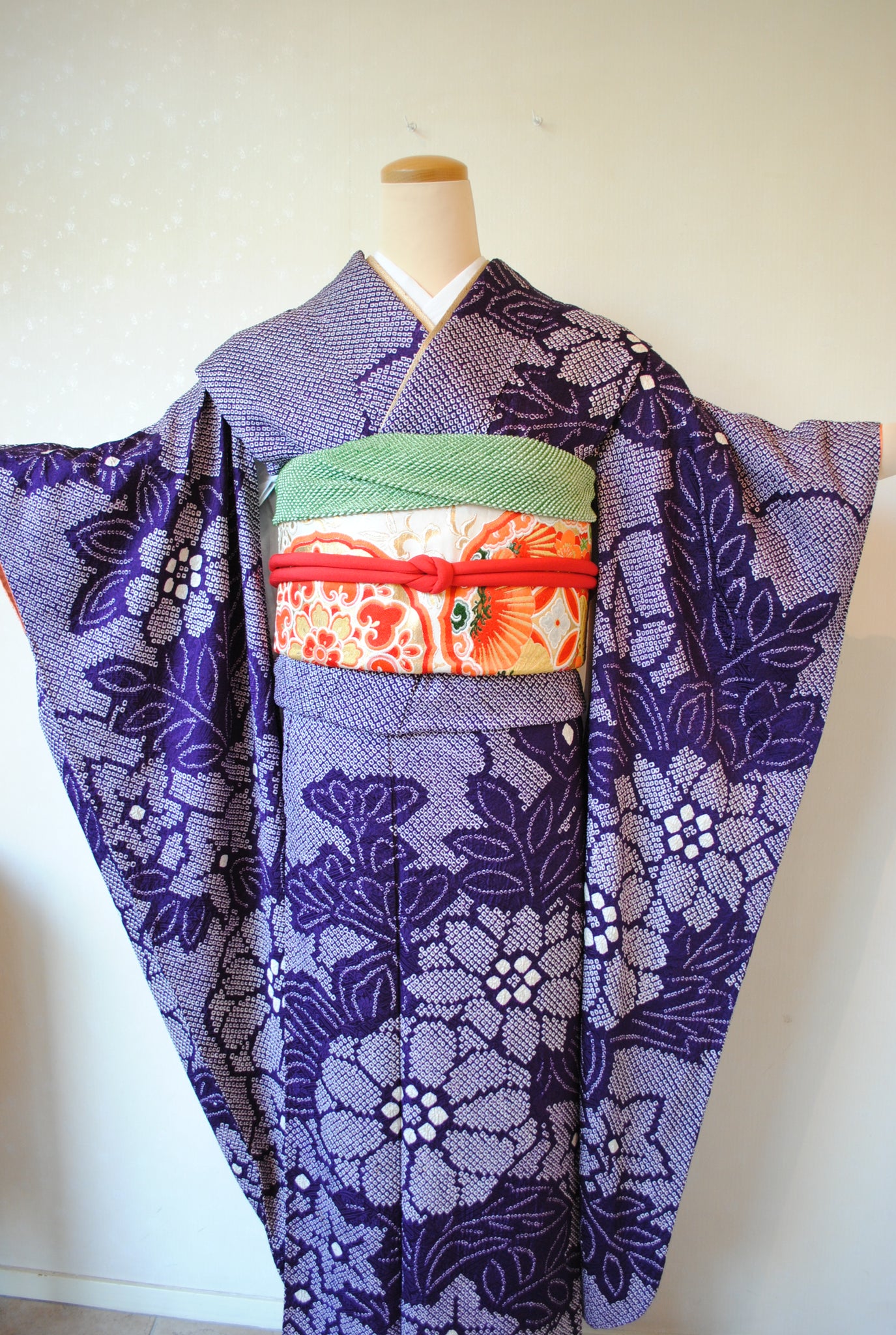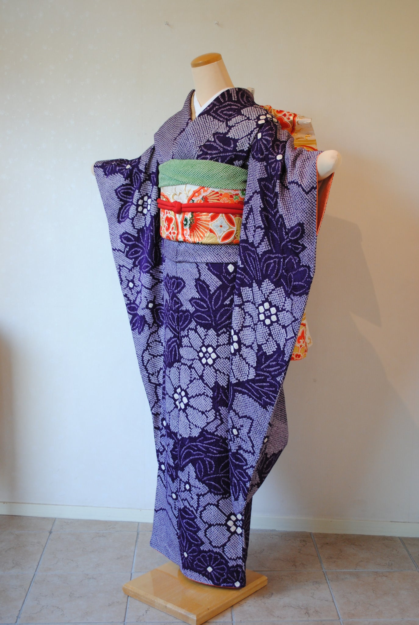 一面を覆う総絞りに、花文様が浮かび上がる深紫の振袖。