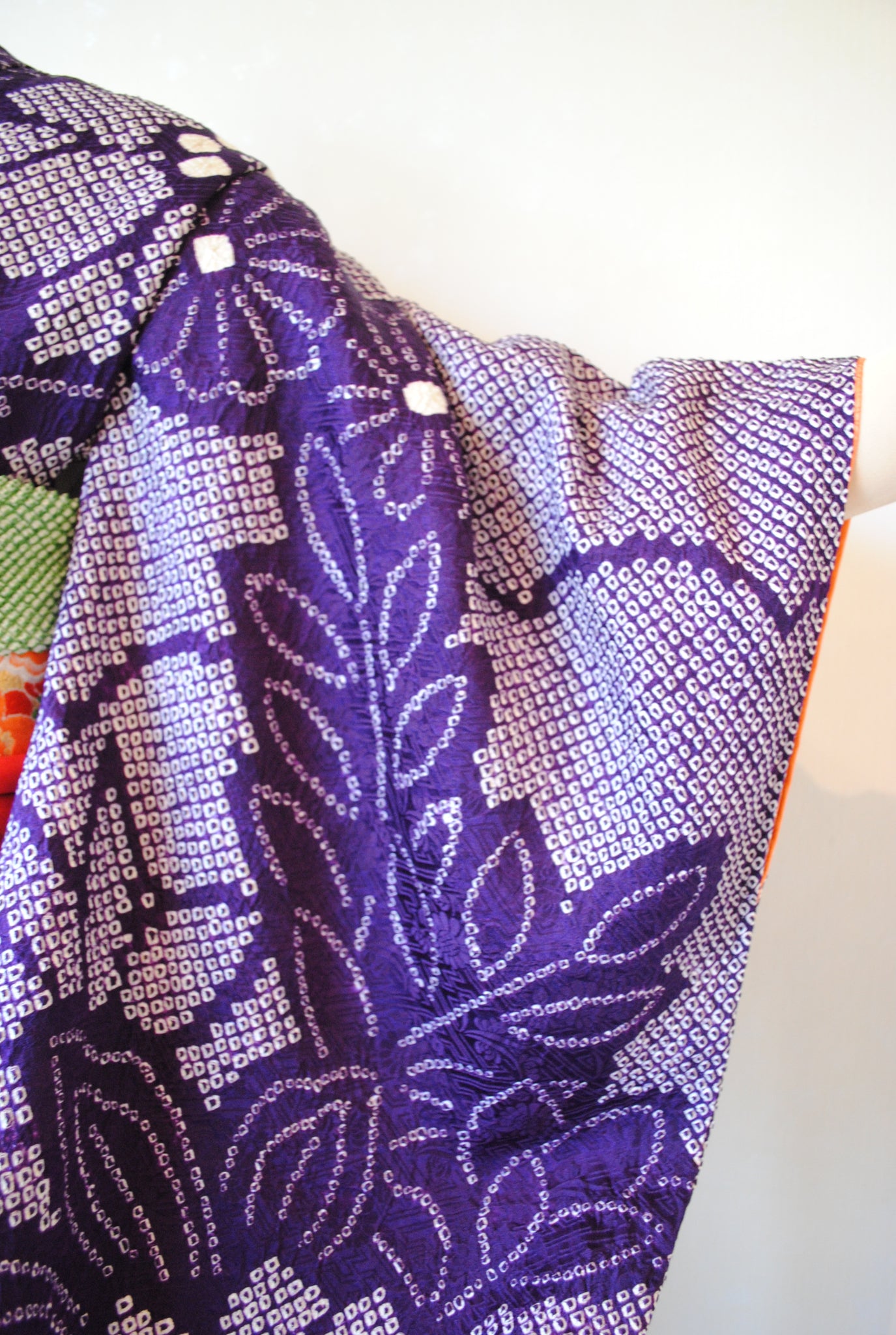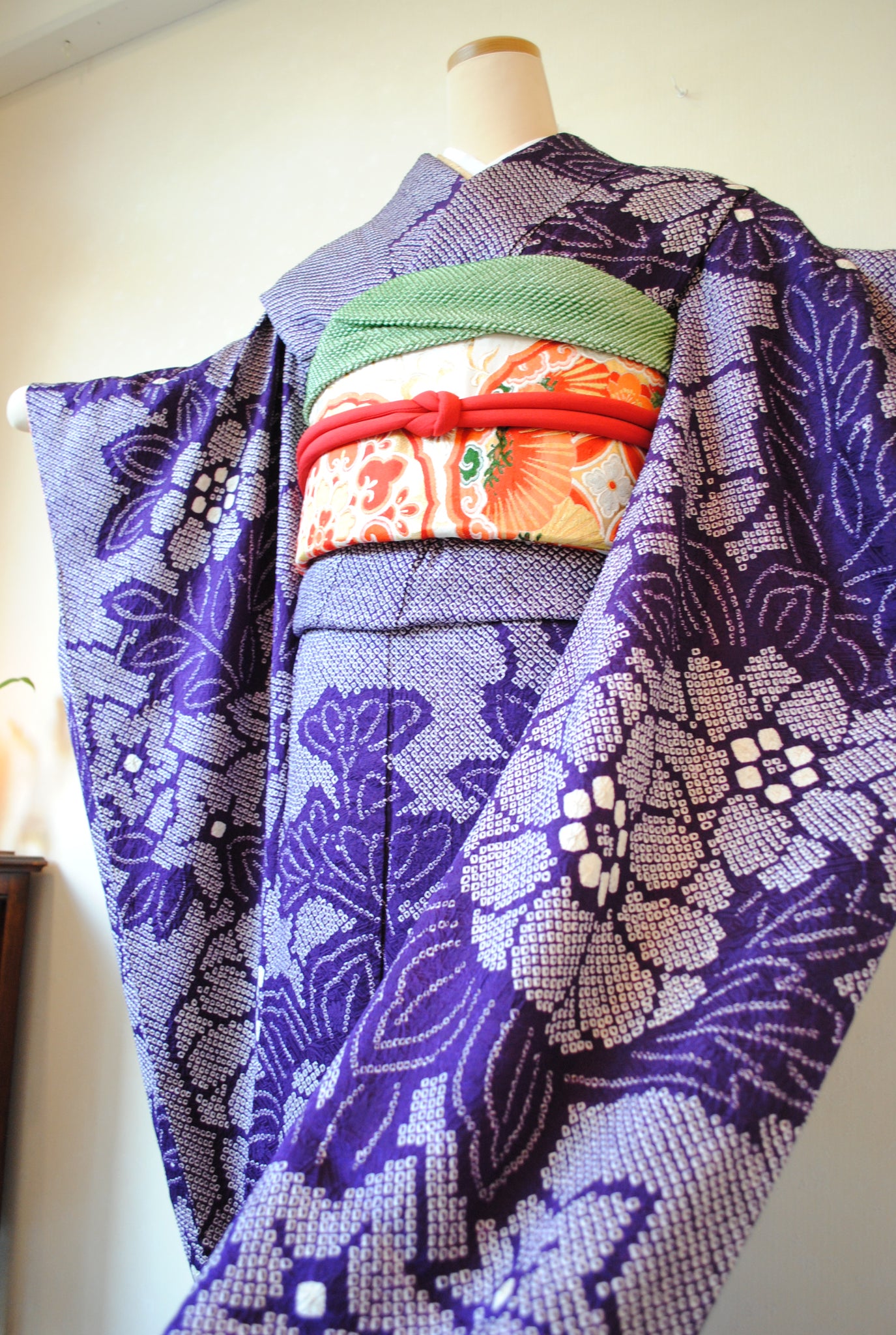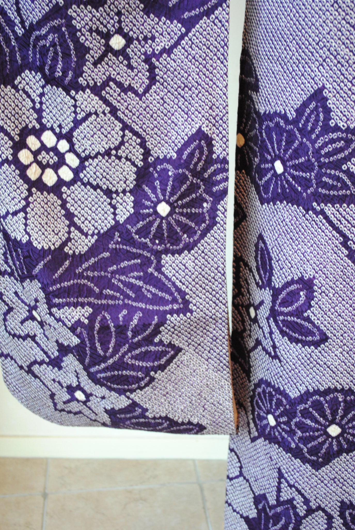 一面を覆う総絞りに、花文様が浮かび上がる深紫の振袖。