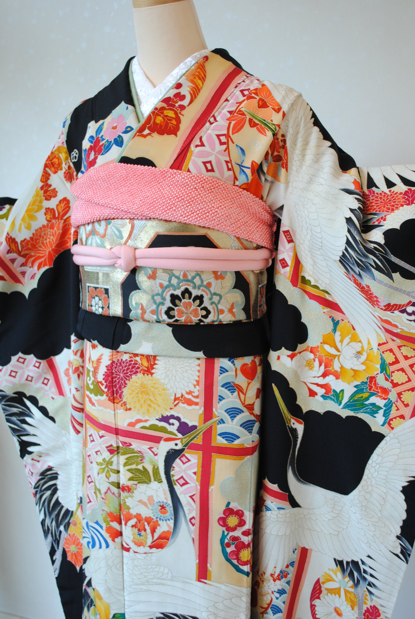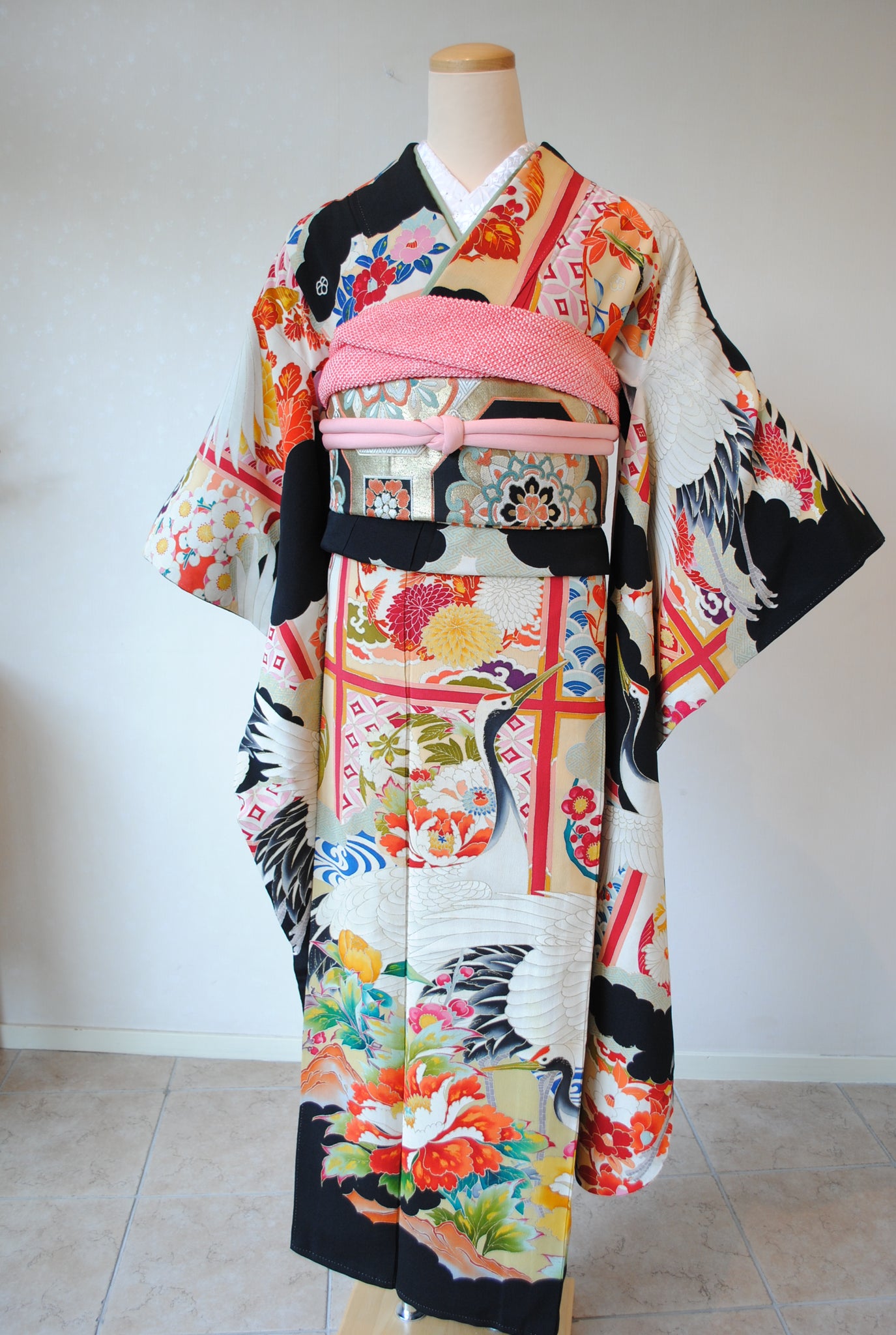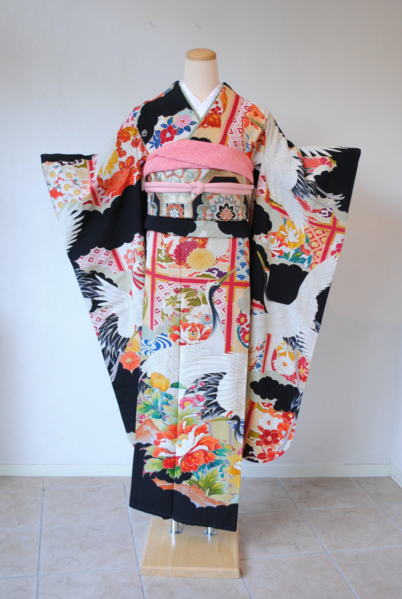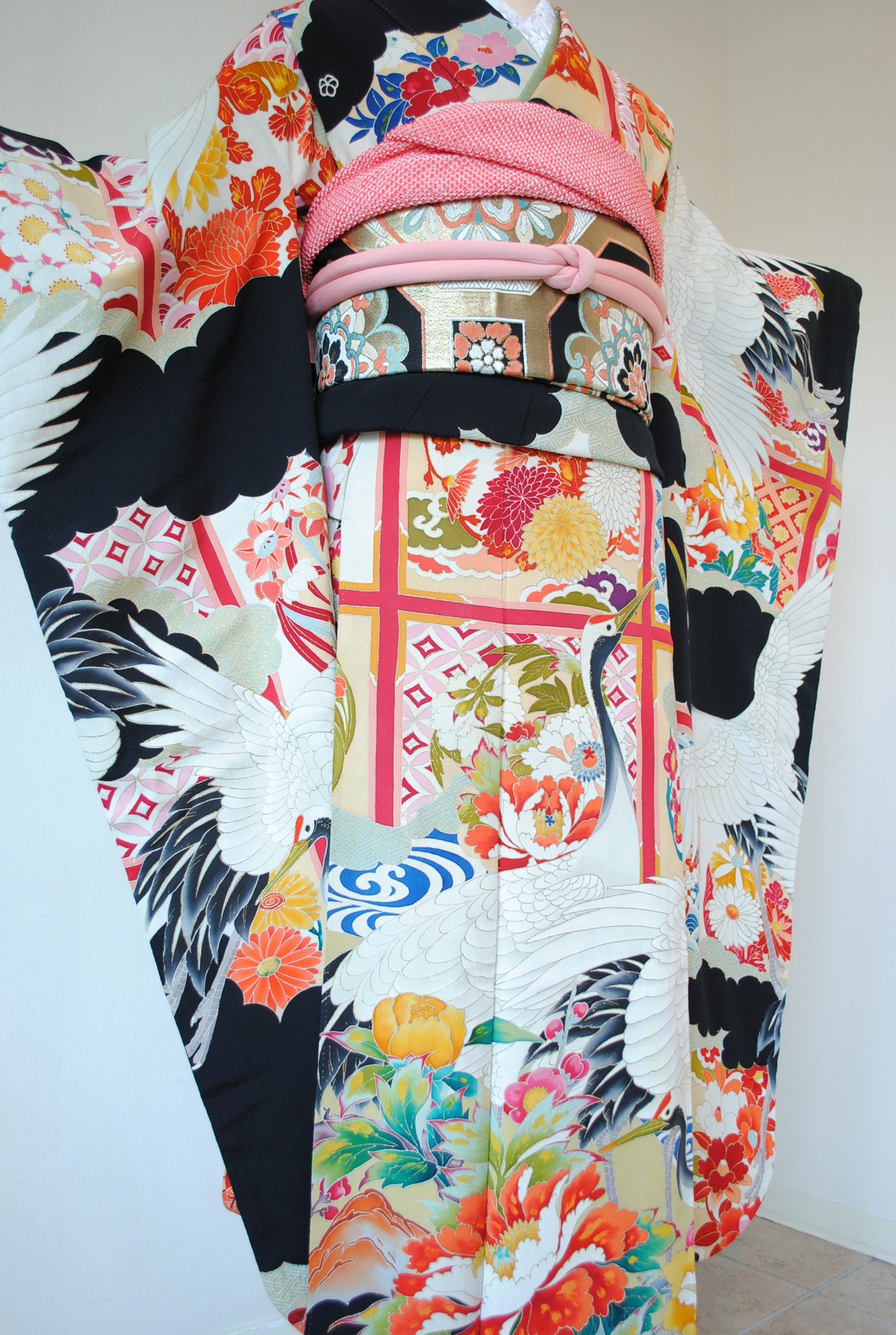 長寿の象徴である鶴や、四季を彩る花々が躍動感たっぷりに描かれ、特別な日をますます輝かせてくれます。