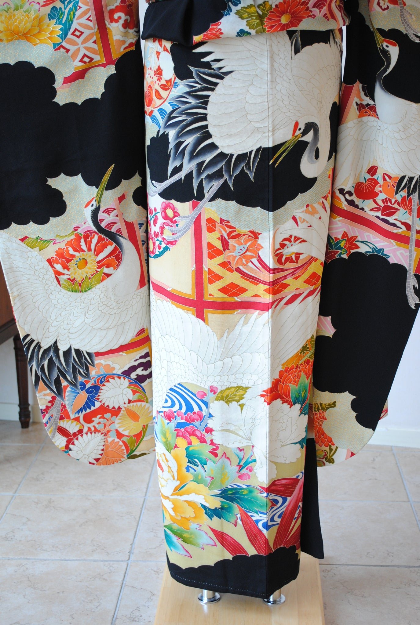 No.67 格子に鶴と花々文様黒振袖
