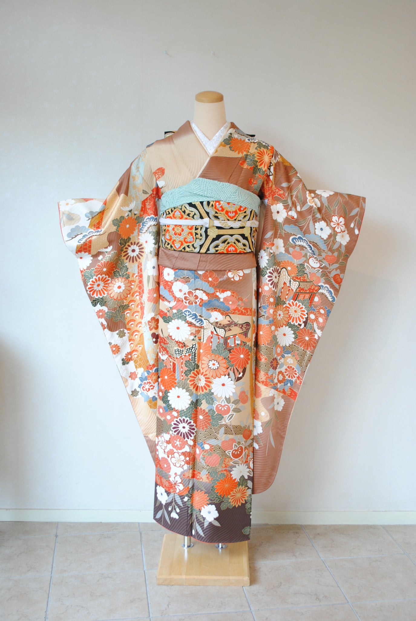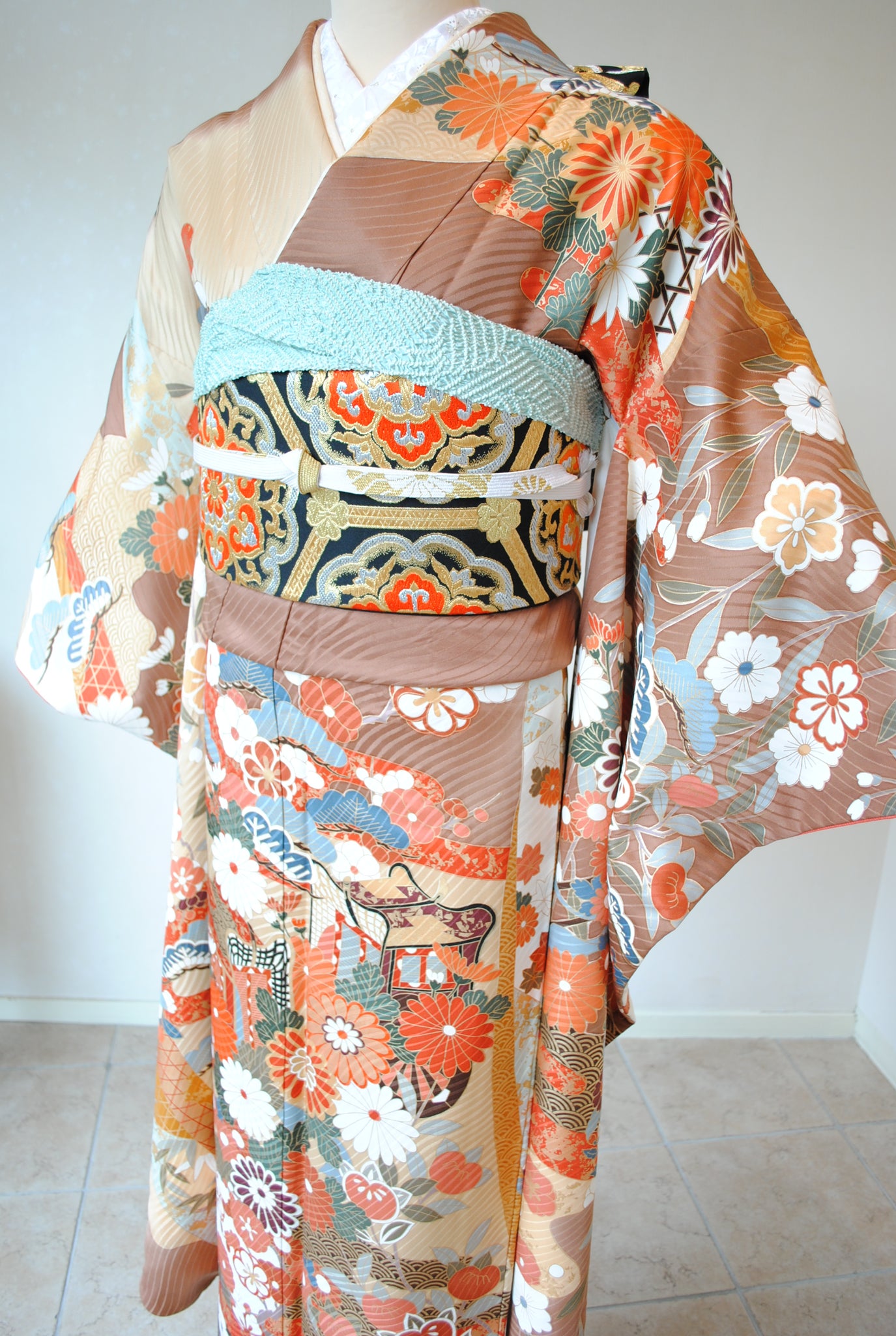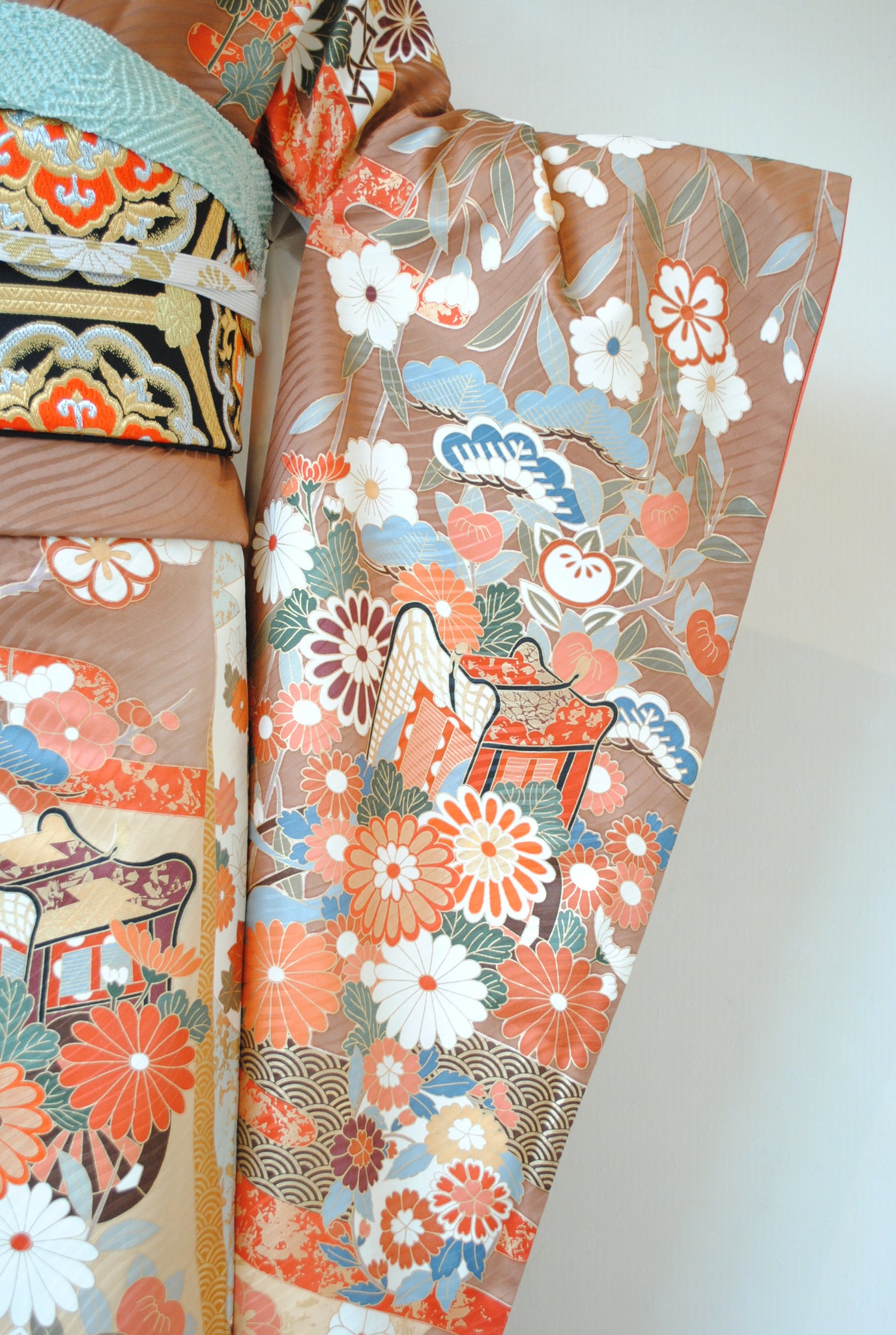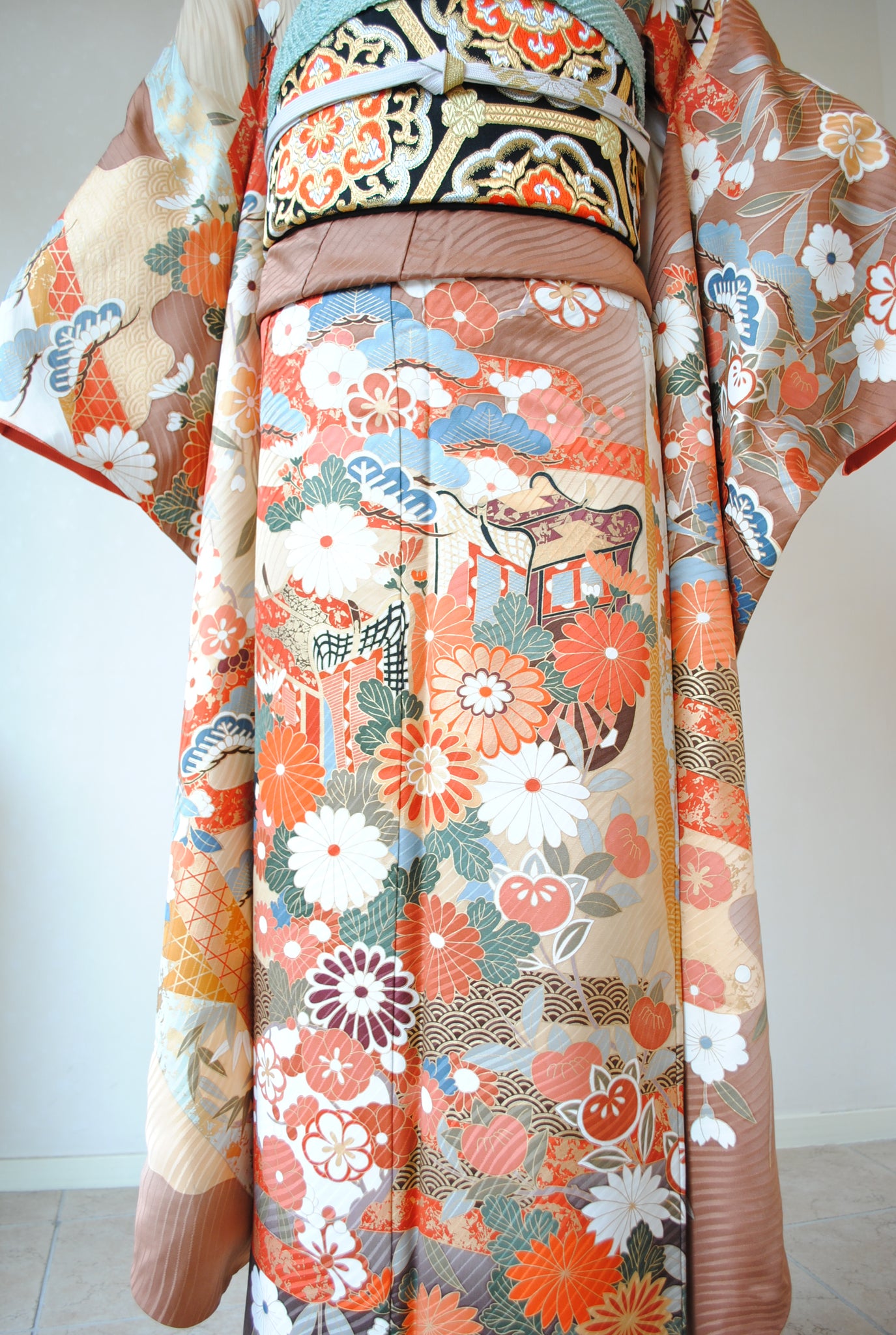落ち着いたトーンの中に朱赤や白が鮮やかに映え、金がアクセントを添えています。御所車と四季の花々は王道の古典柄で、クラシックな華やかさを漂わせています。