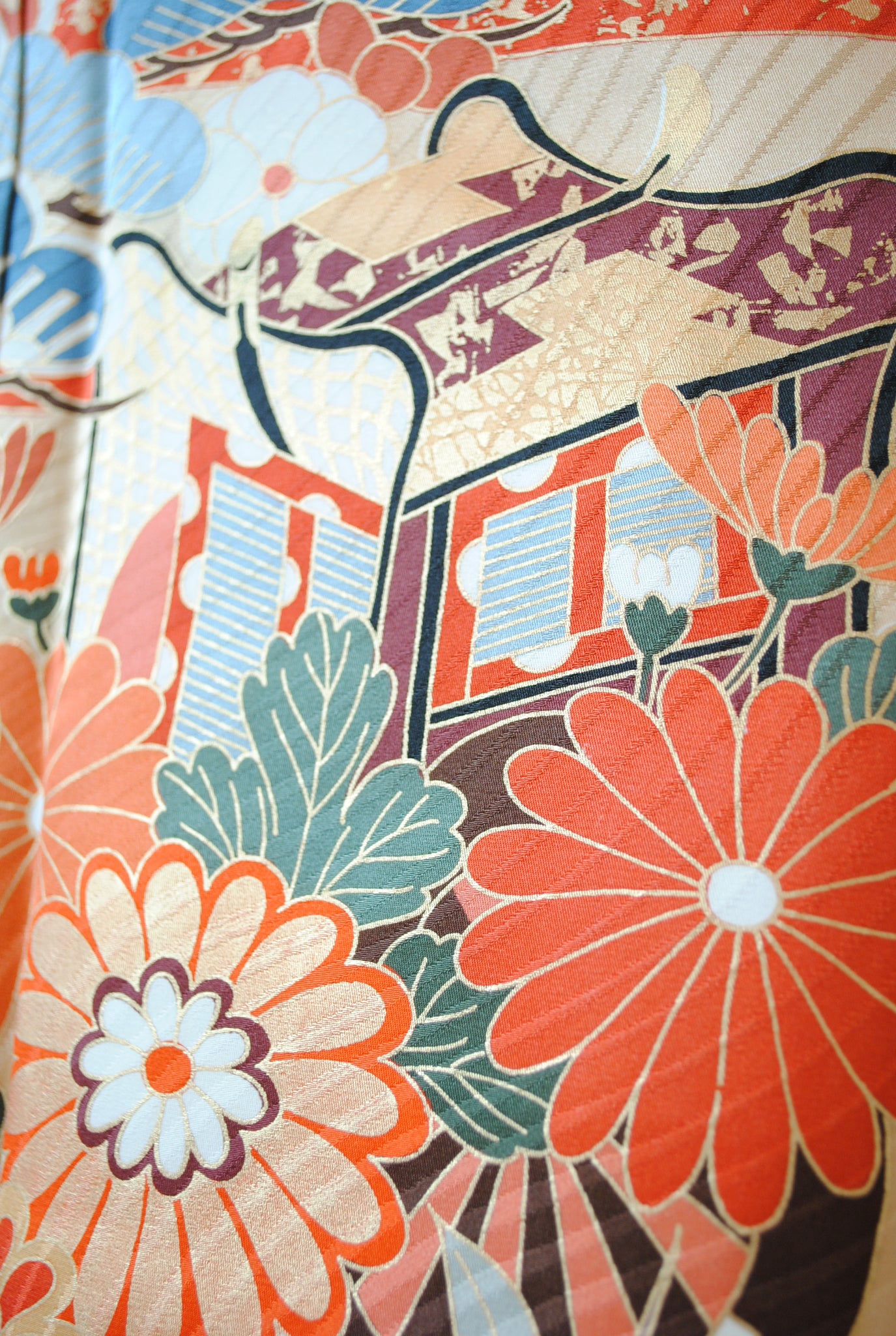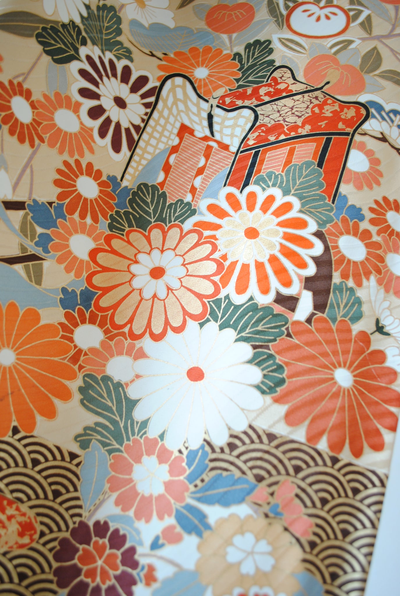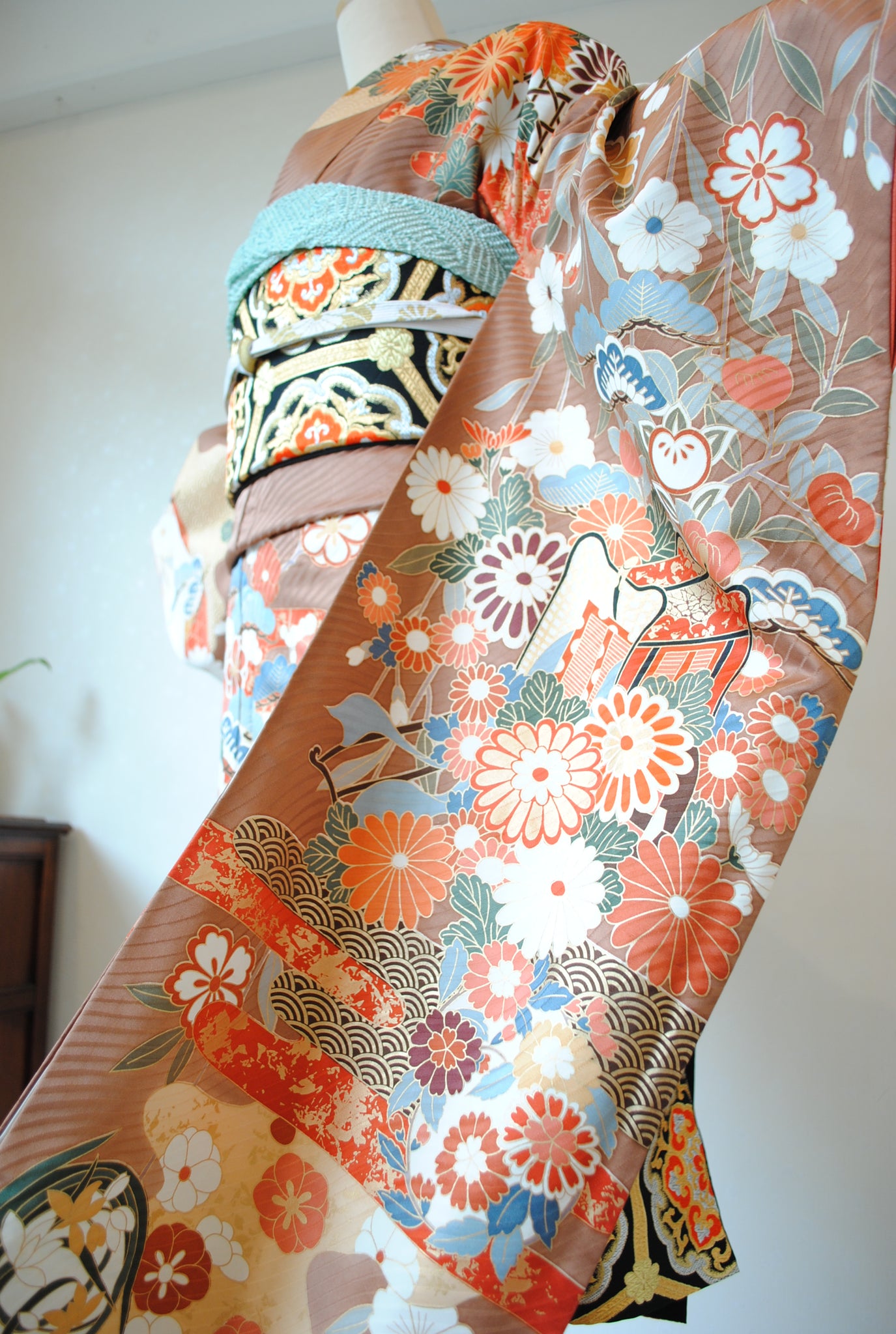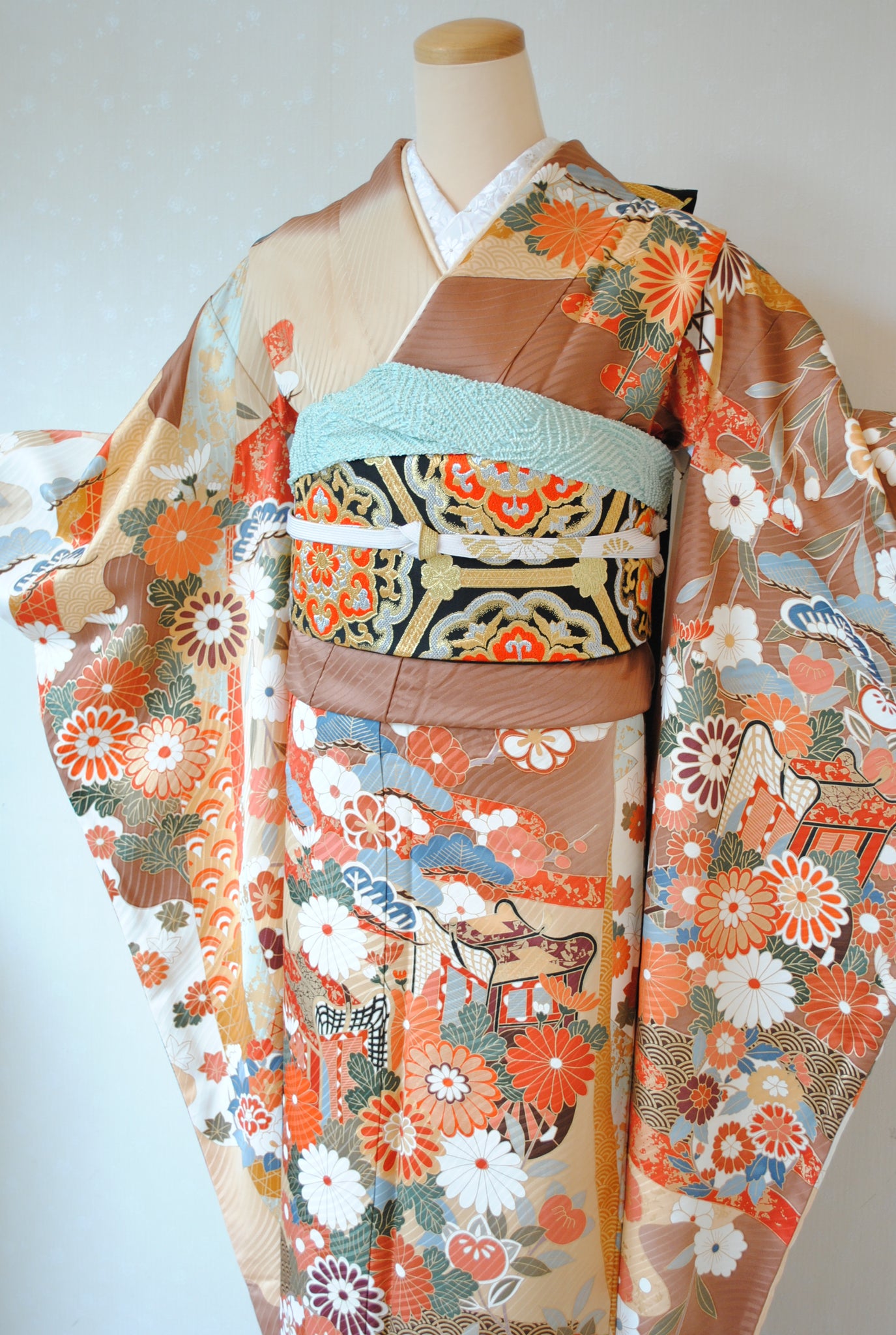 落ち着いたトーンの中に朱赤や白が鮮やかに映え、金がアクセントを添えています。御所車と四季の花々は王道の古典柄で、クラシックな華やかさを漂わせています。