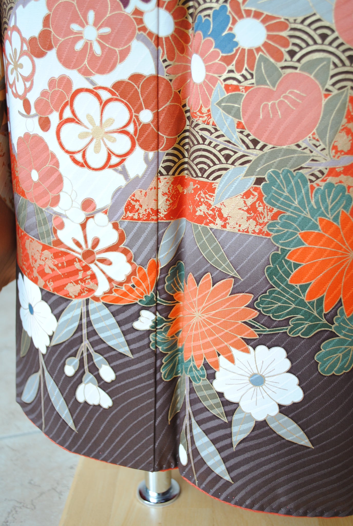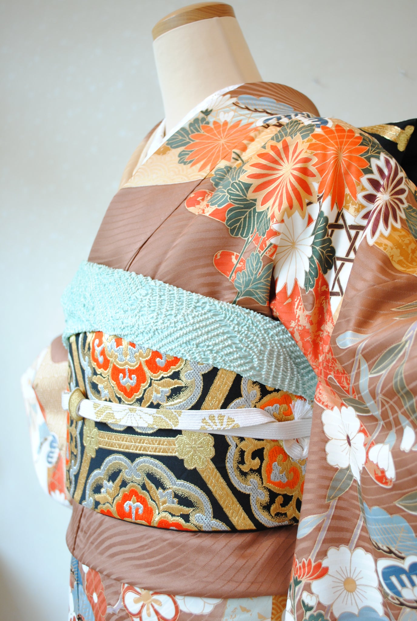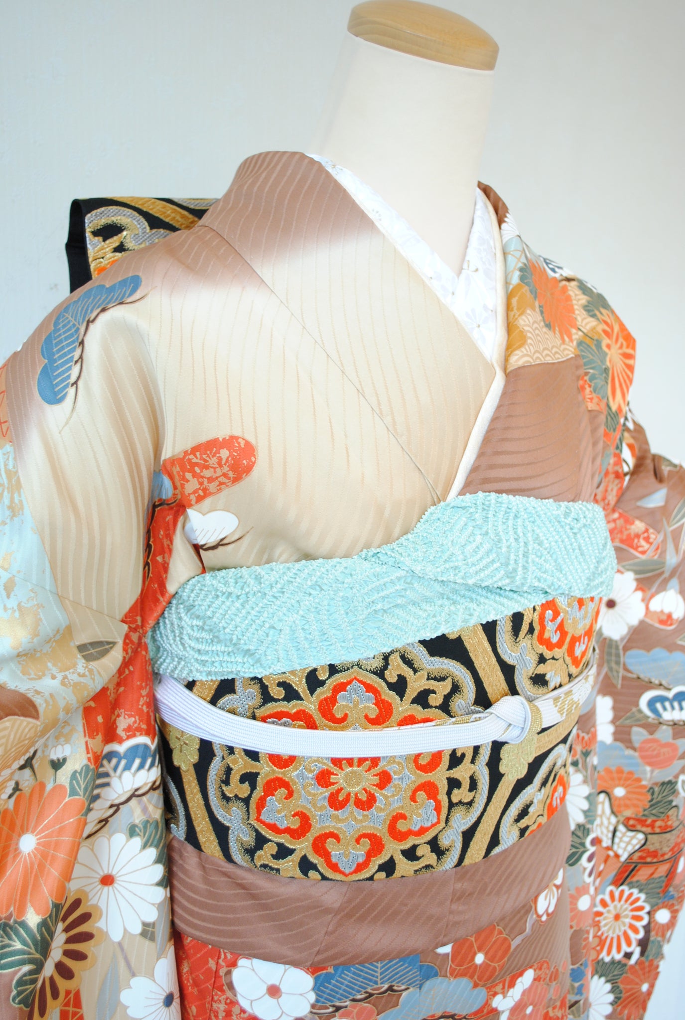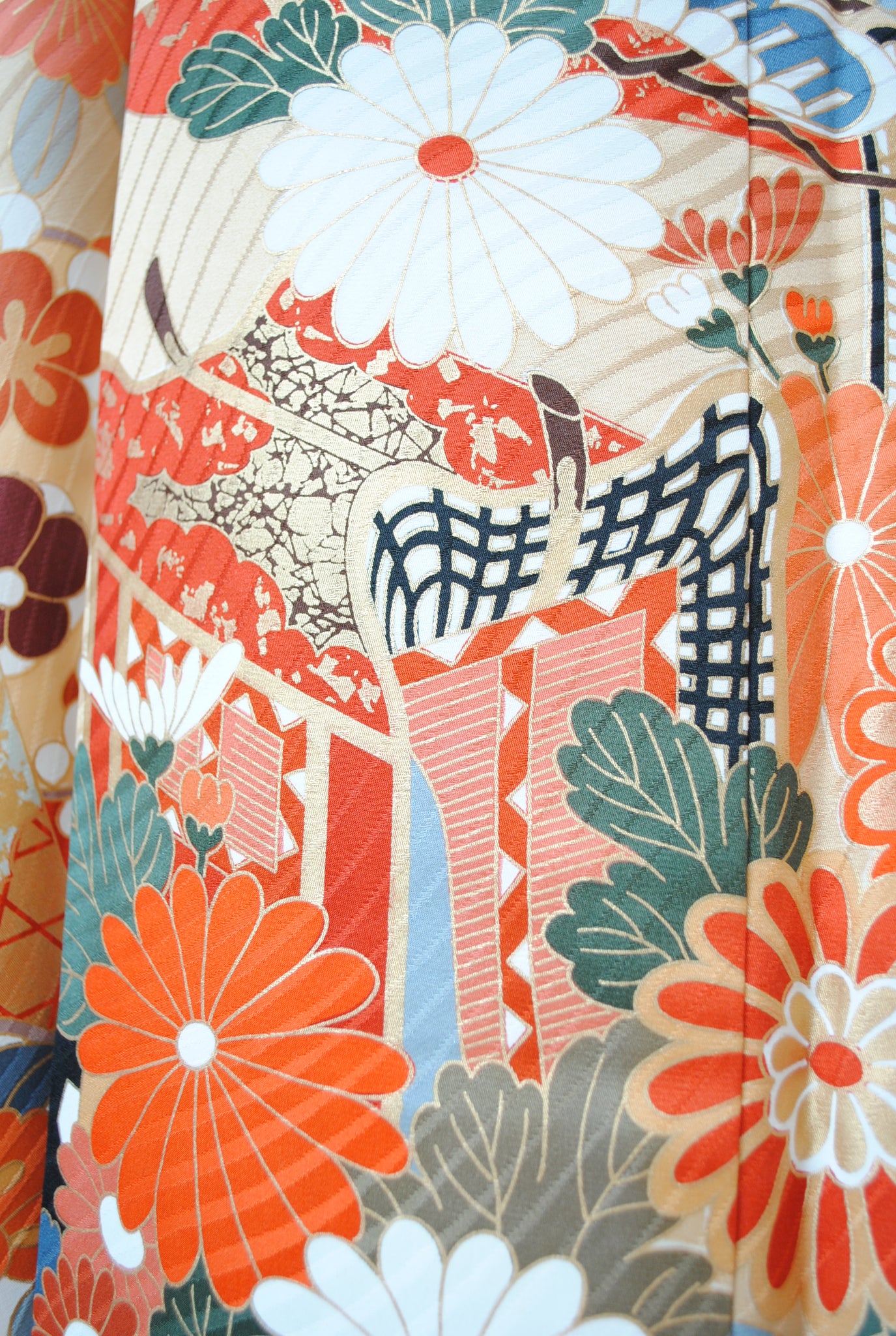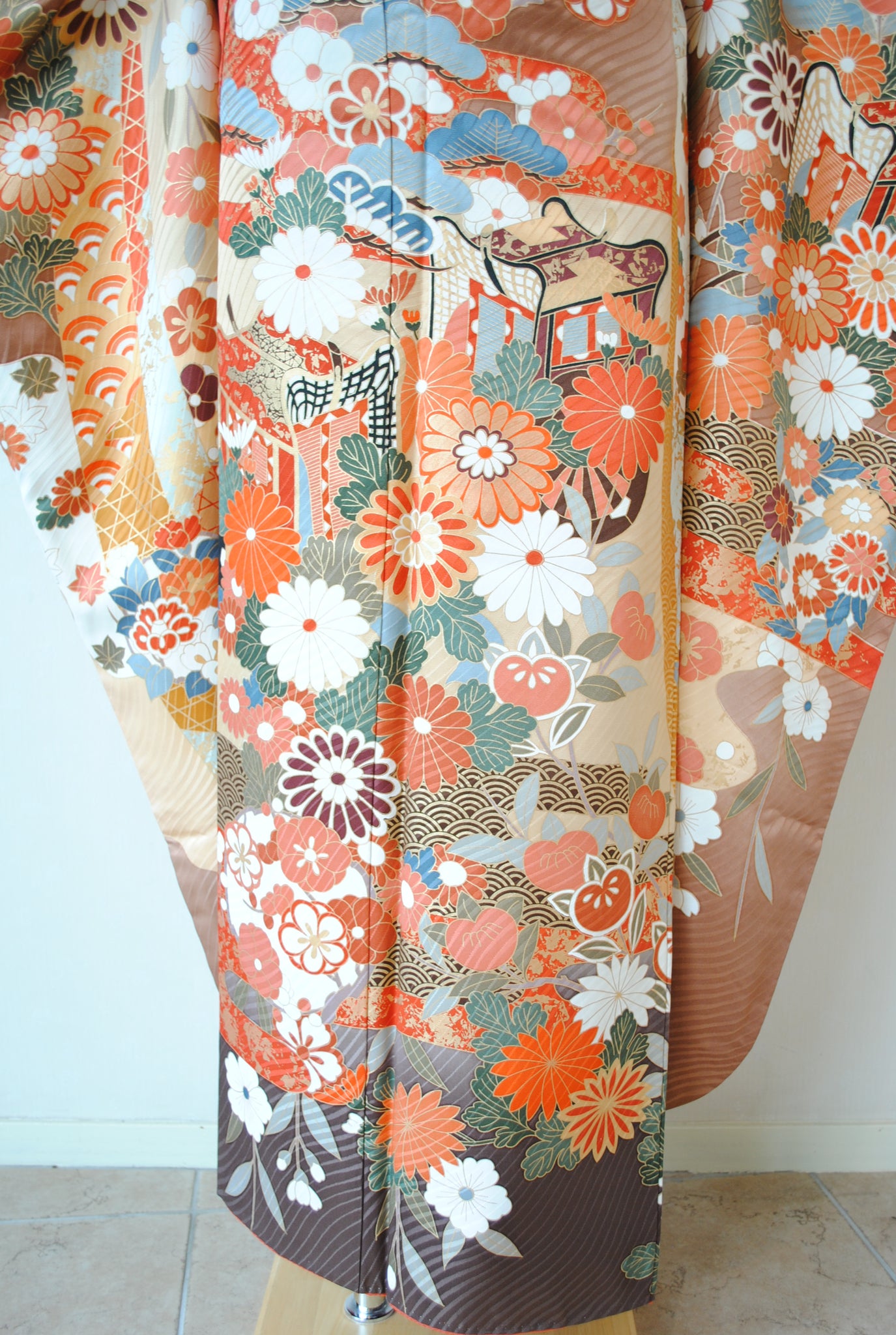 落ち着いたトーンの中に朱赤や白が鮮やかに映え、金がアクセントを添えています。御所車と四季の花々は王道の古典柄で、クラシックな華やかさを漂わせています。