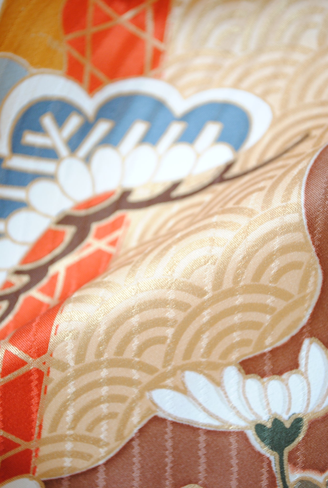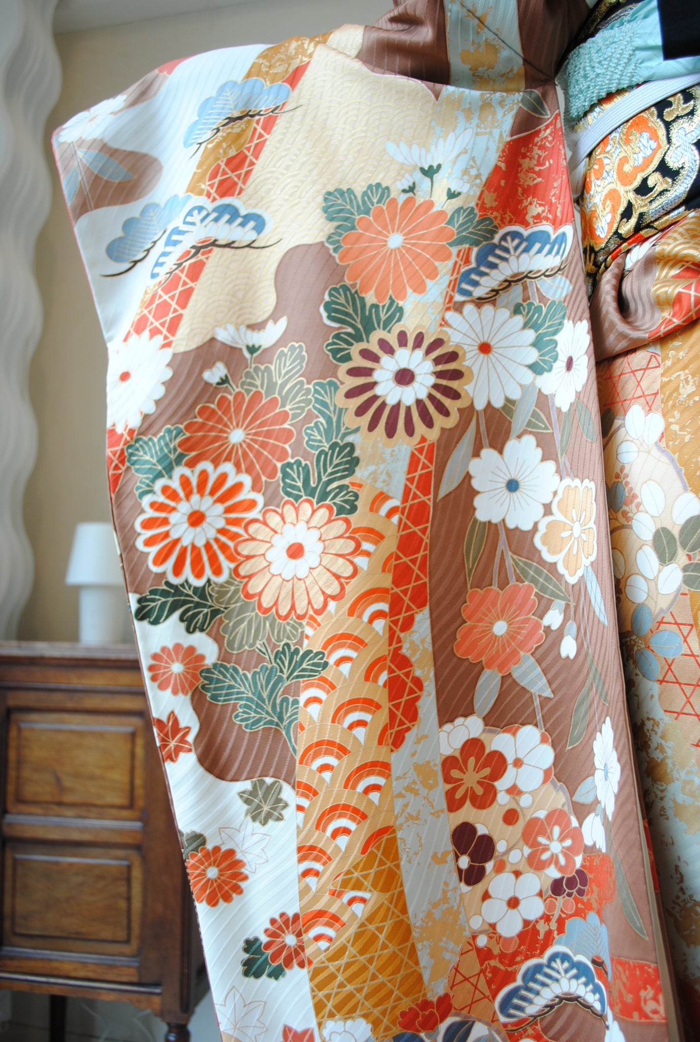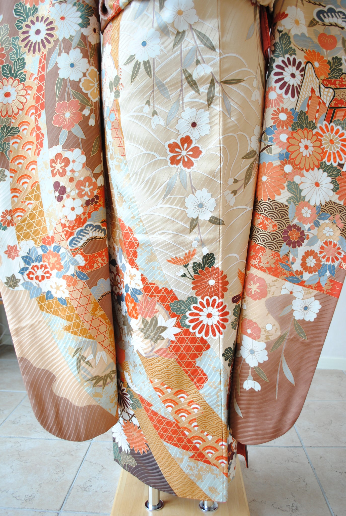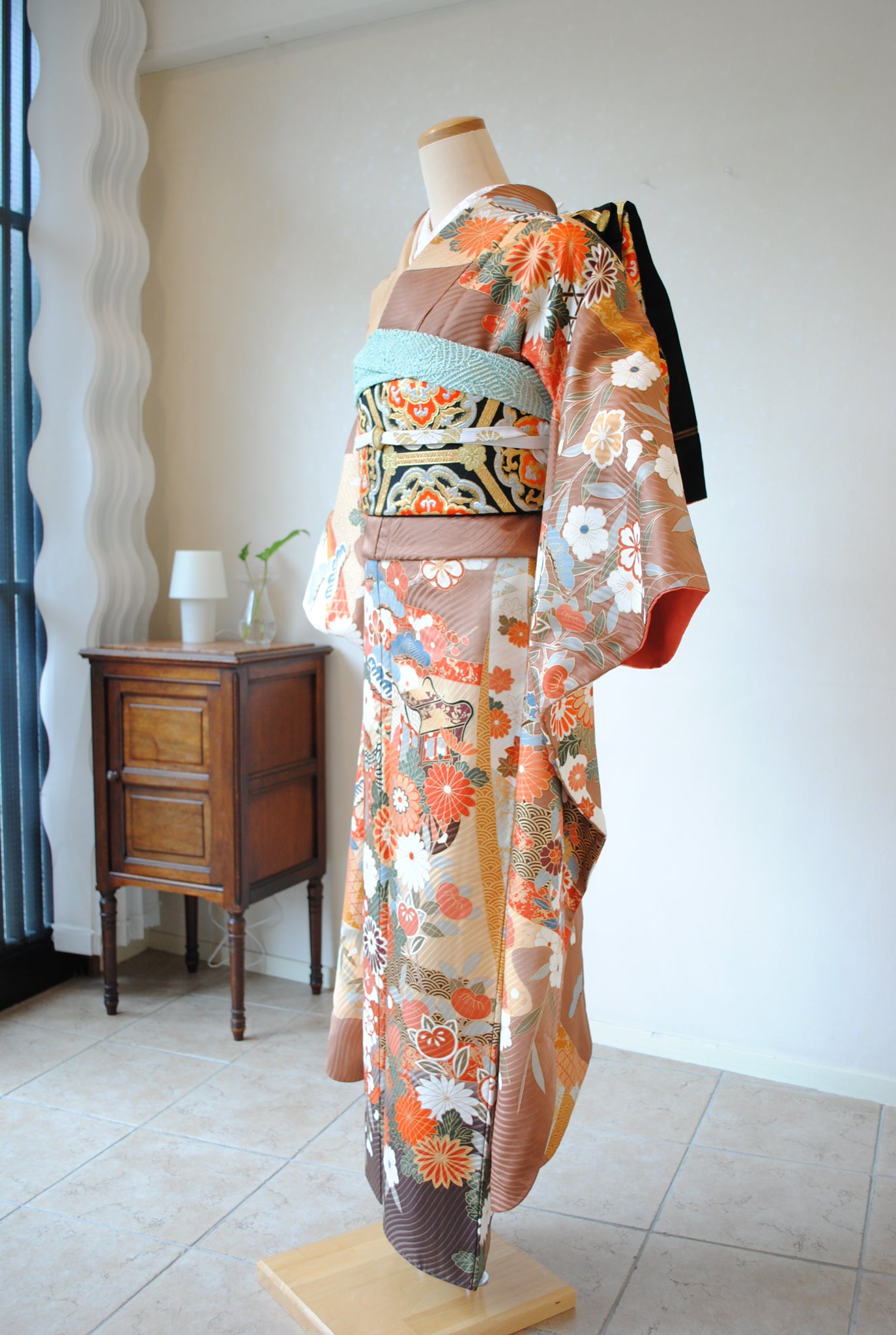 落ち着いたトーンの中に朱赤や白が鮮やかに映え、金がアクセントを添えています。御所車と四季の花々は王道の古典柄で、クラシックな華やかさを漂わせています。