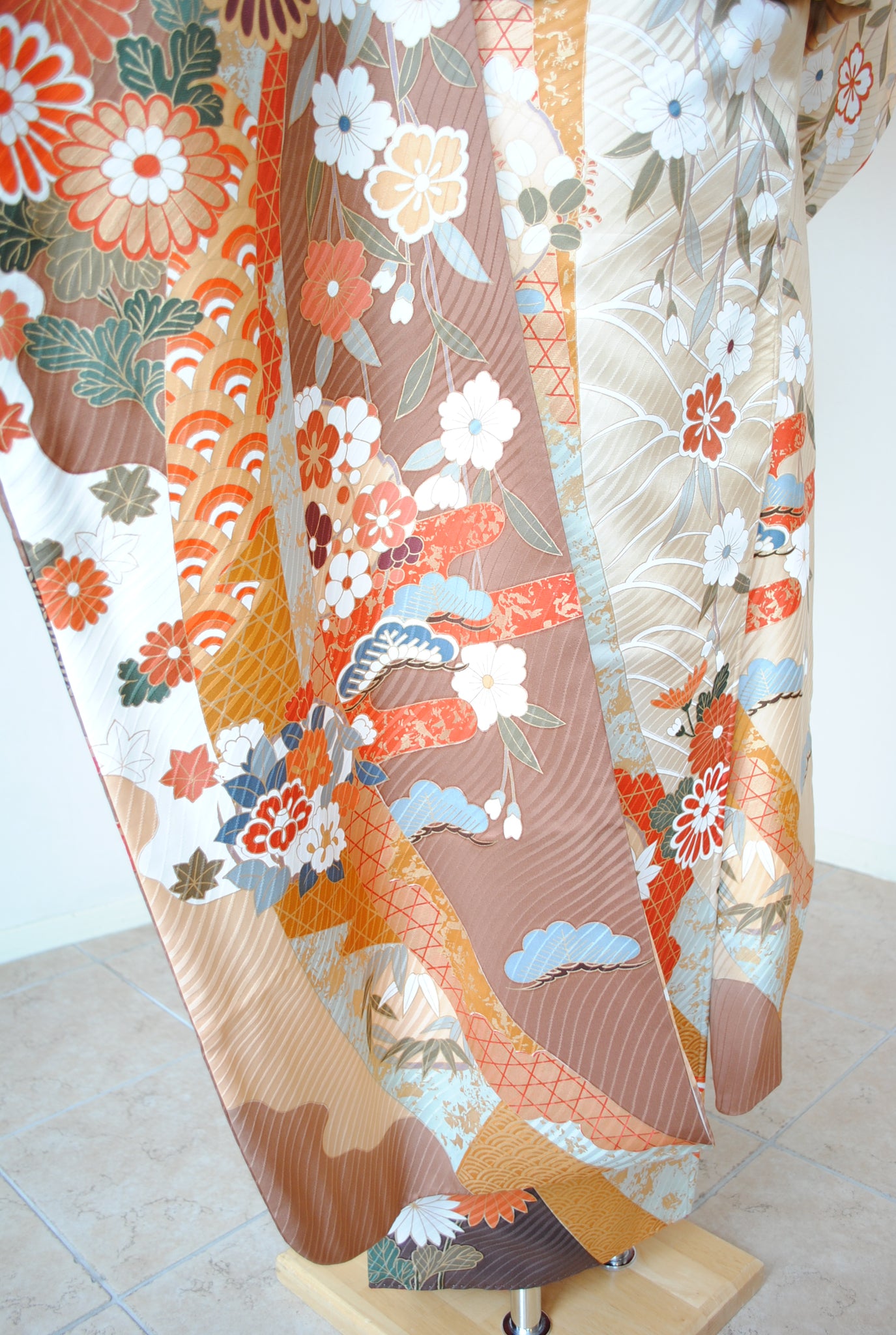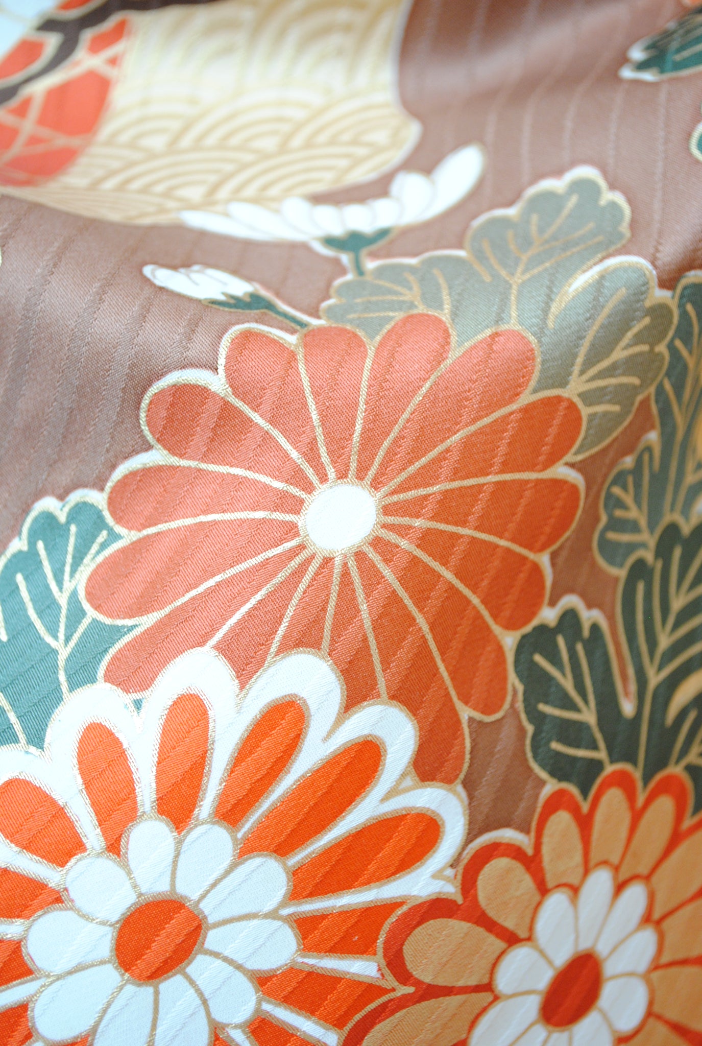 ピンクブラウンを基調とした柔らかな茶に、ベージュのぼかしが入った珍しい色合い。人気のくすみ感を帯びた振袖です。