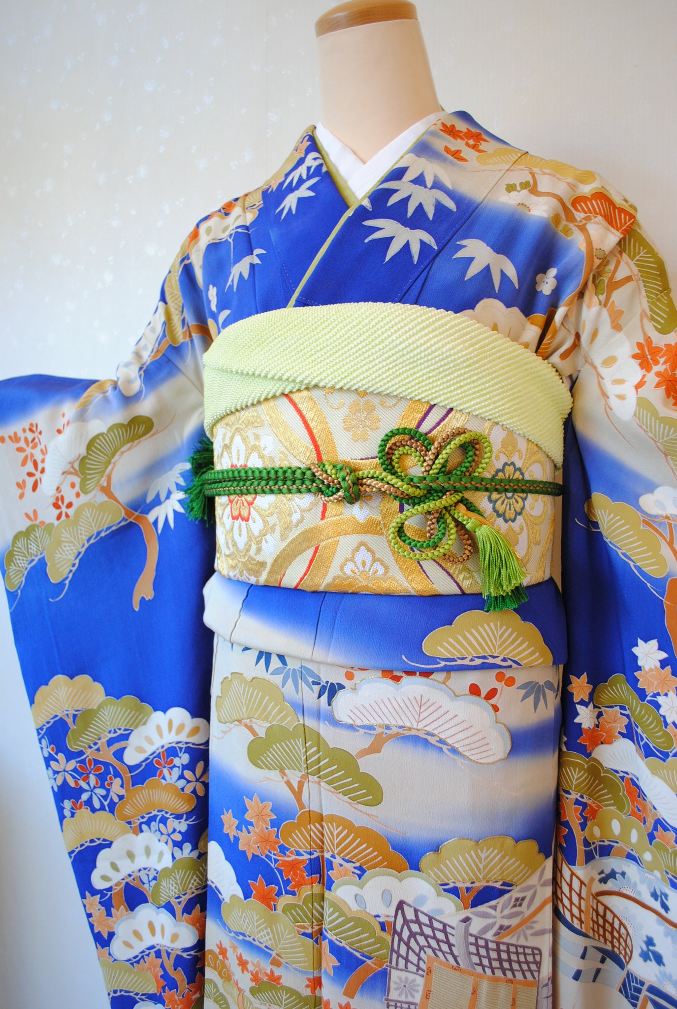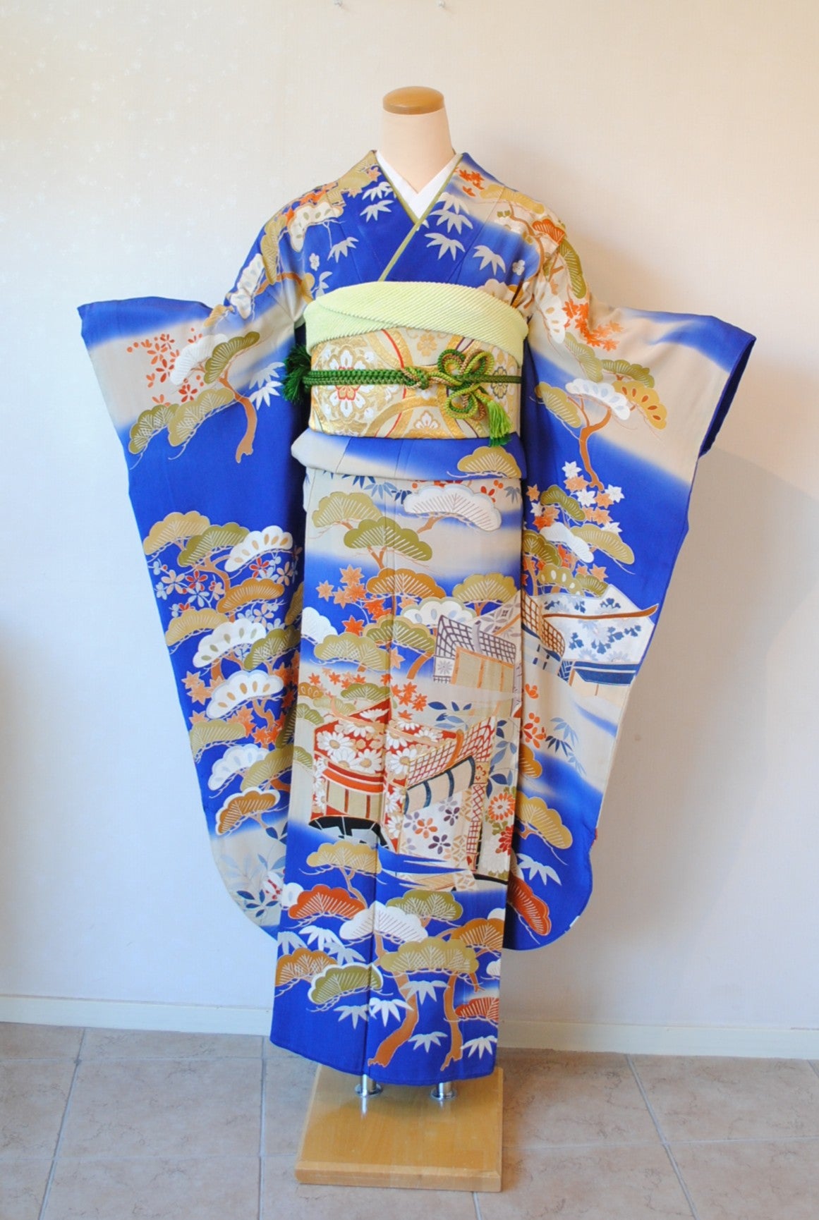 晴れの日をすっきりと上品に演出する青。松に合わせた緑系の小物のほか、クラシックな赤い小物も対比が生まれおすすめです。