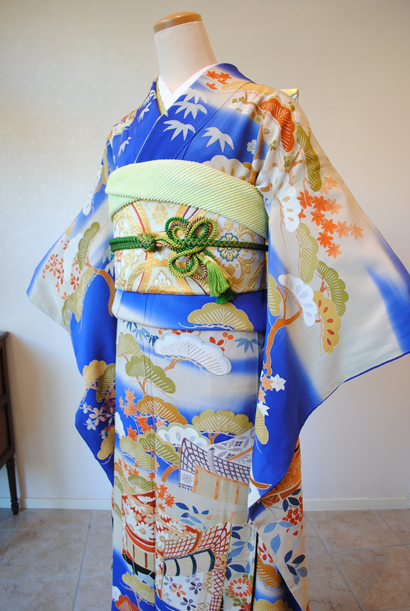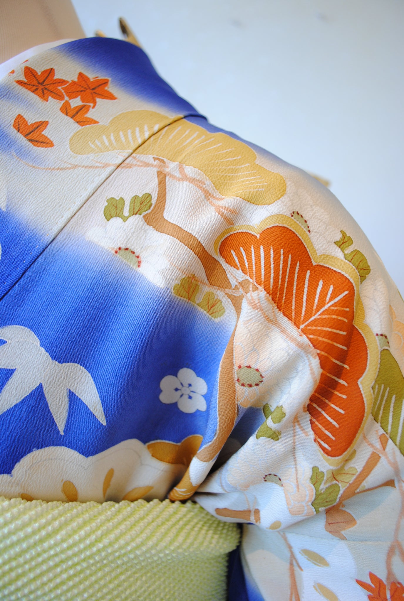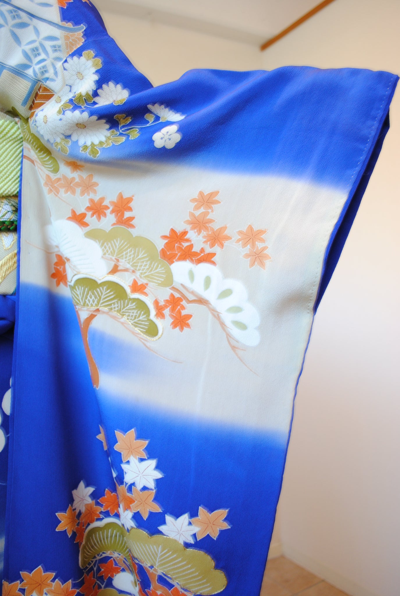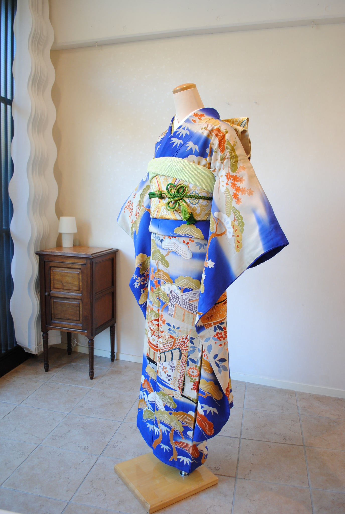 美しい青地に溶け込むぼかしが印象的なアンティーク振袖です。
