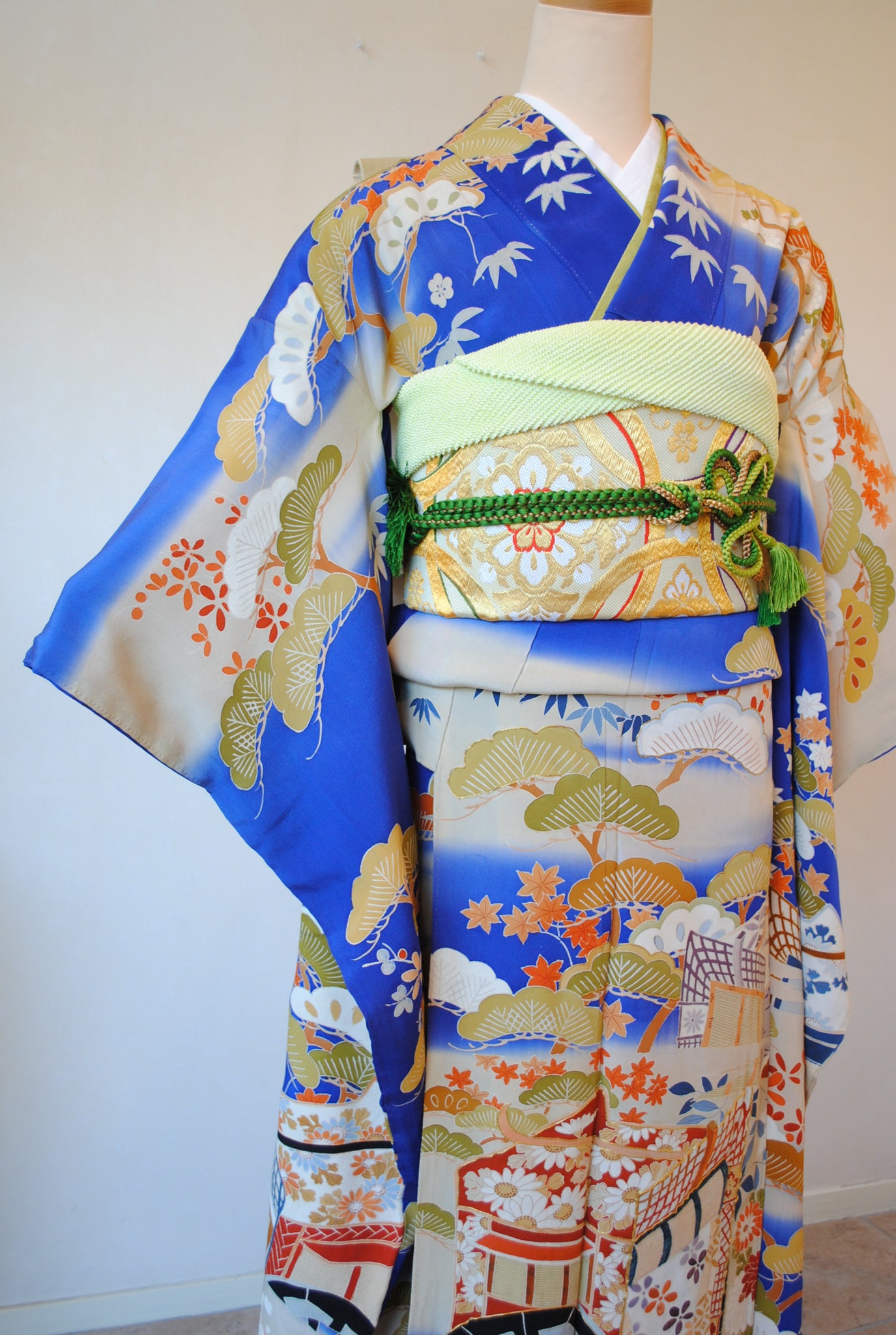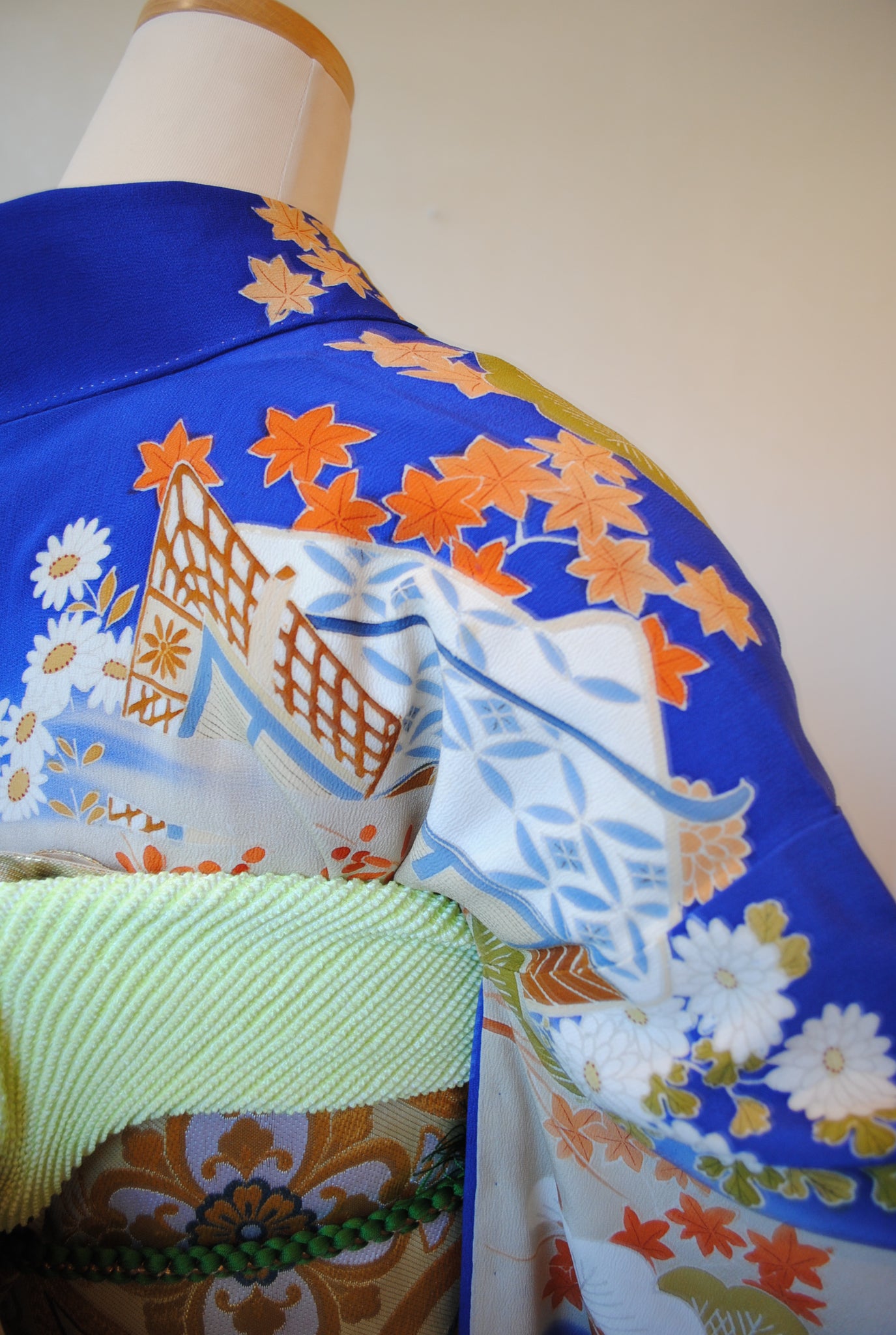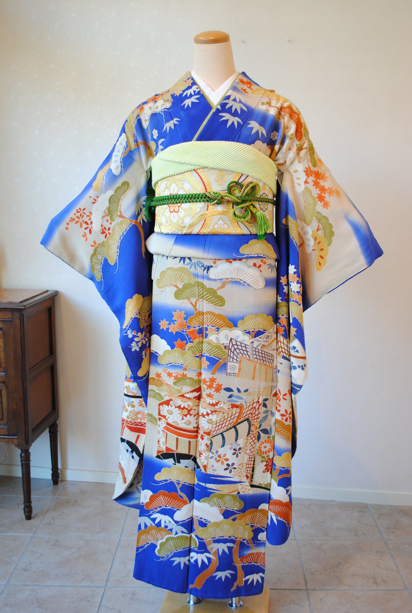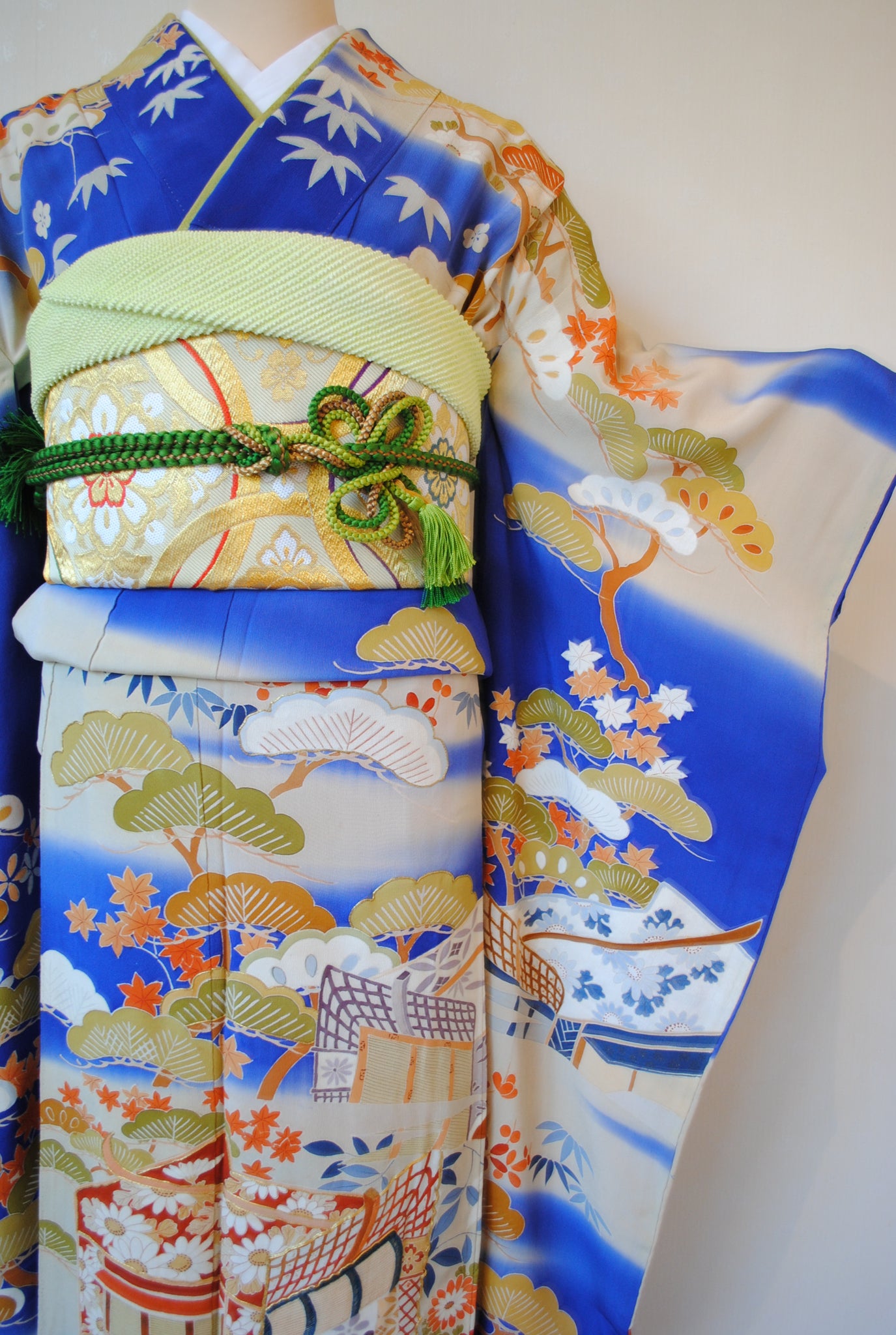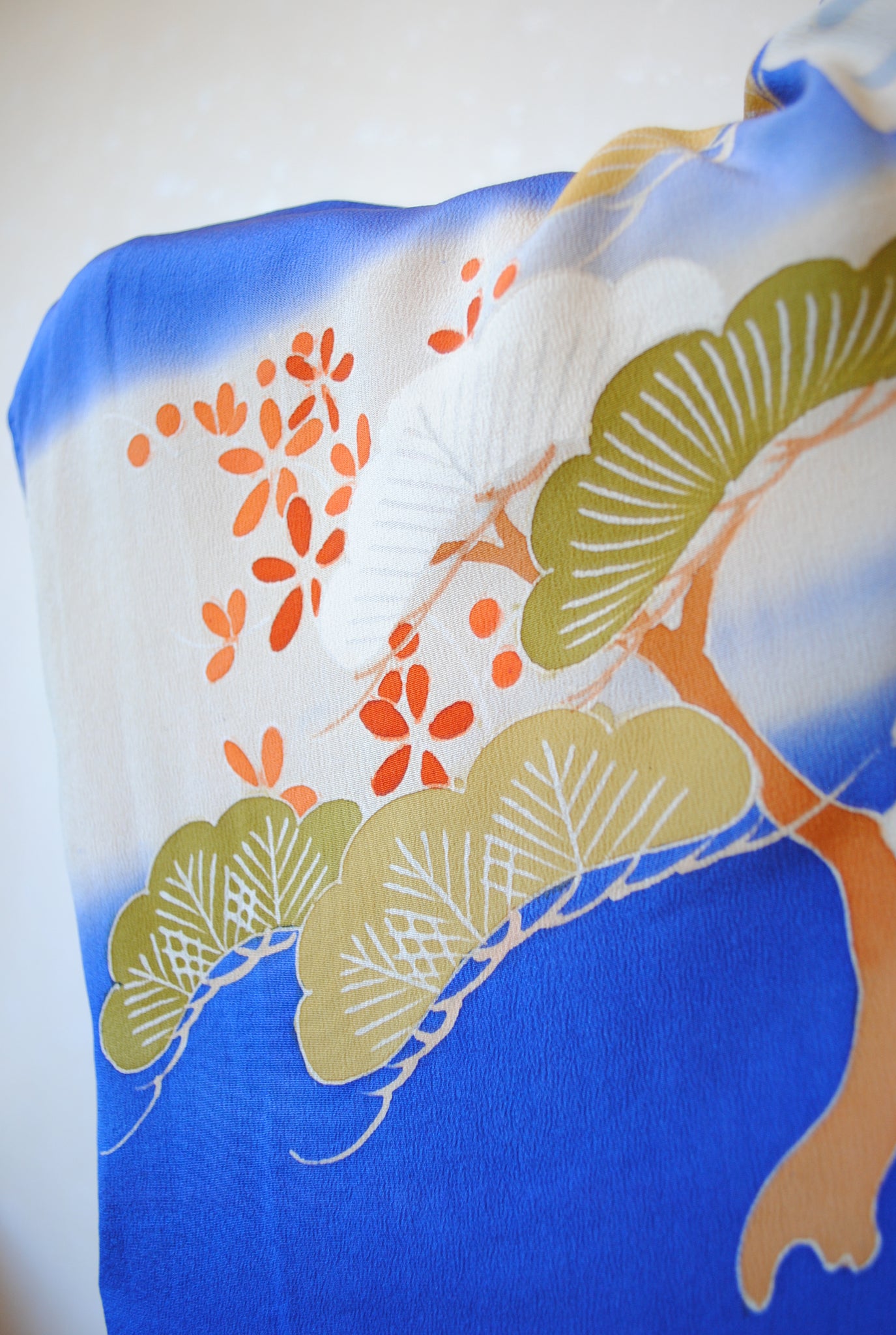 美しい青地に溶け込むぼかしが印象的なアンティーク振袖です。