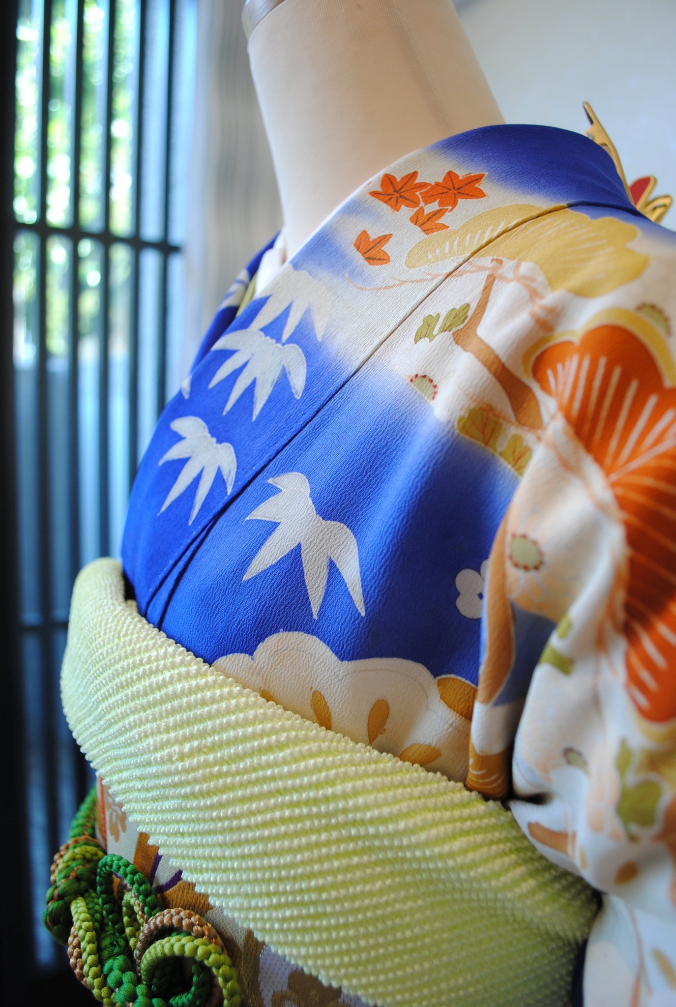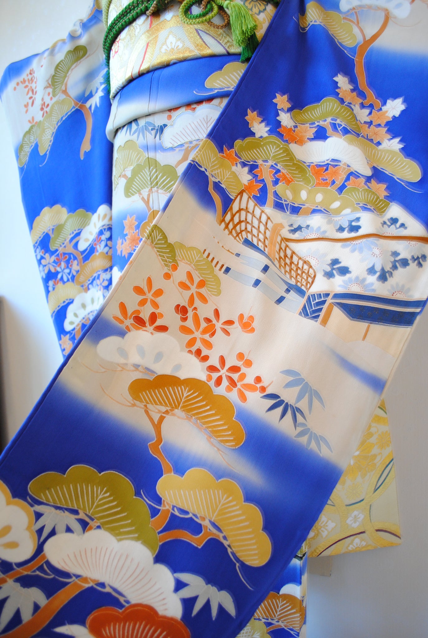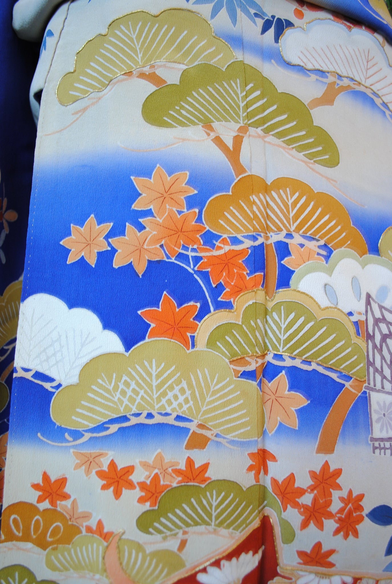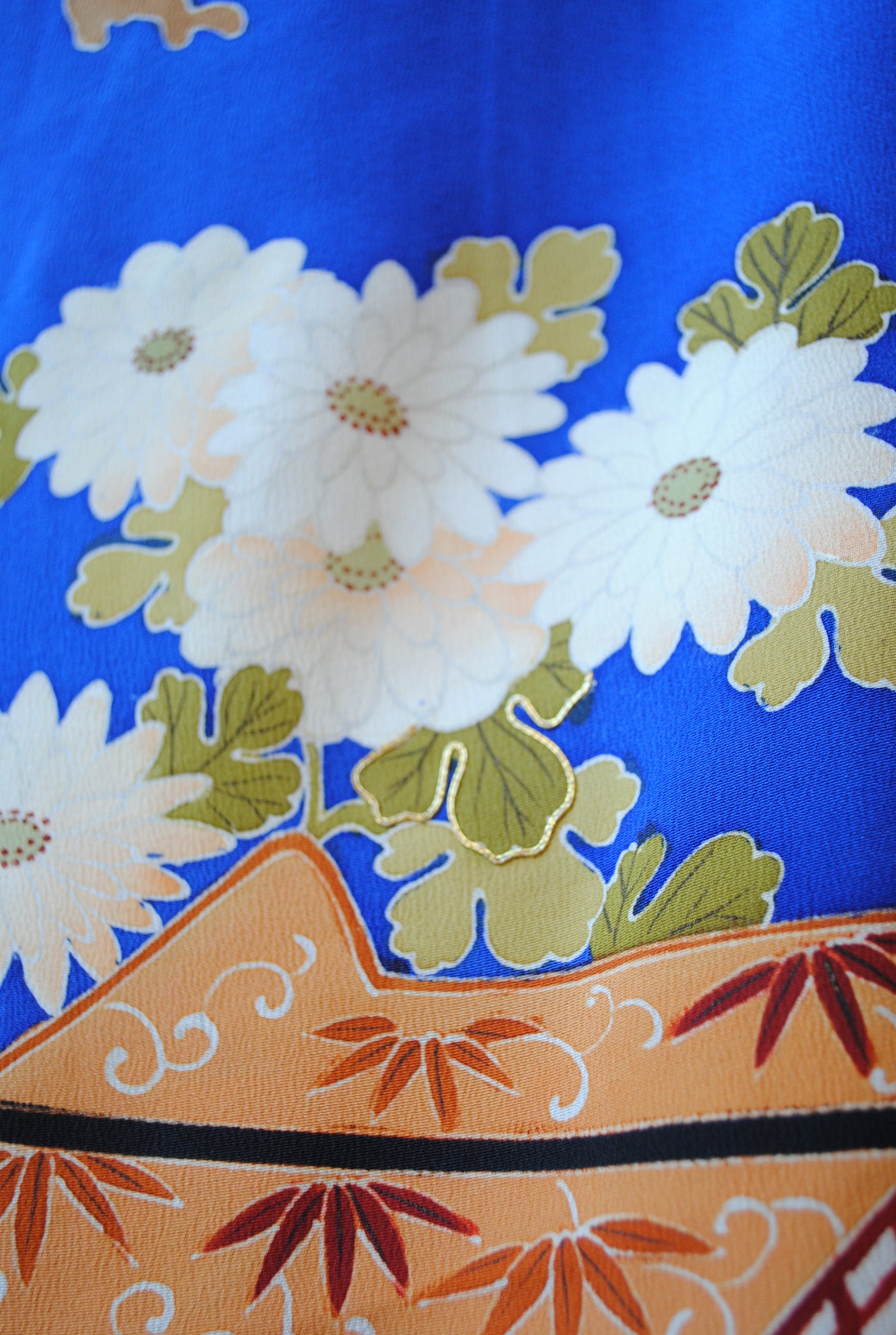 美しい青地に溶け込むぼかしが印象的なアンティーク振袖です。