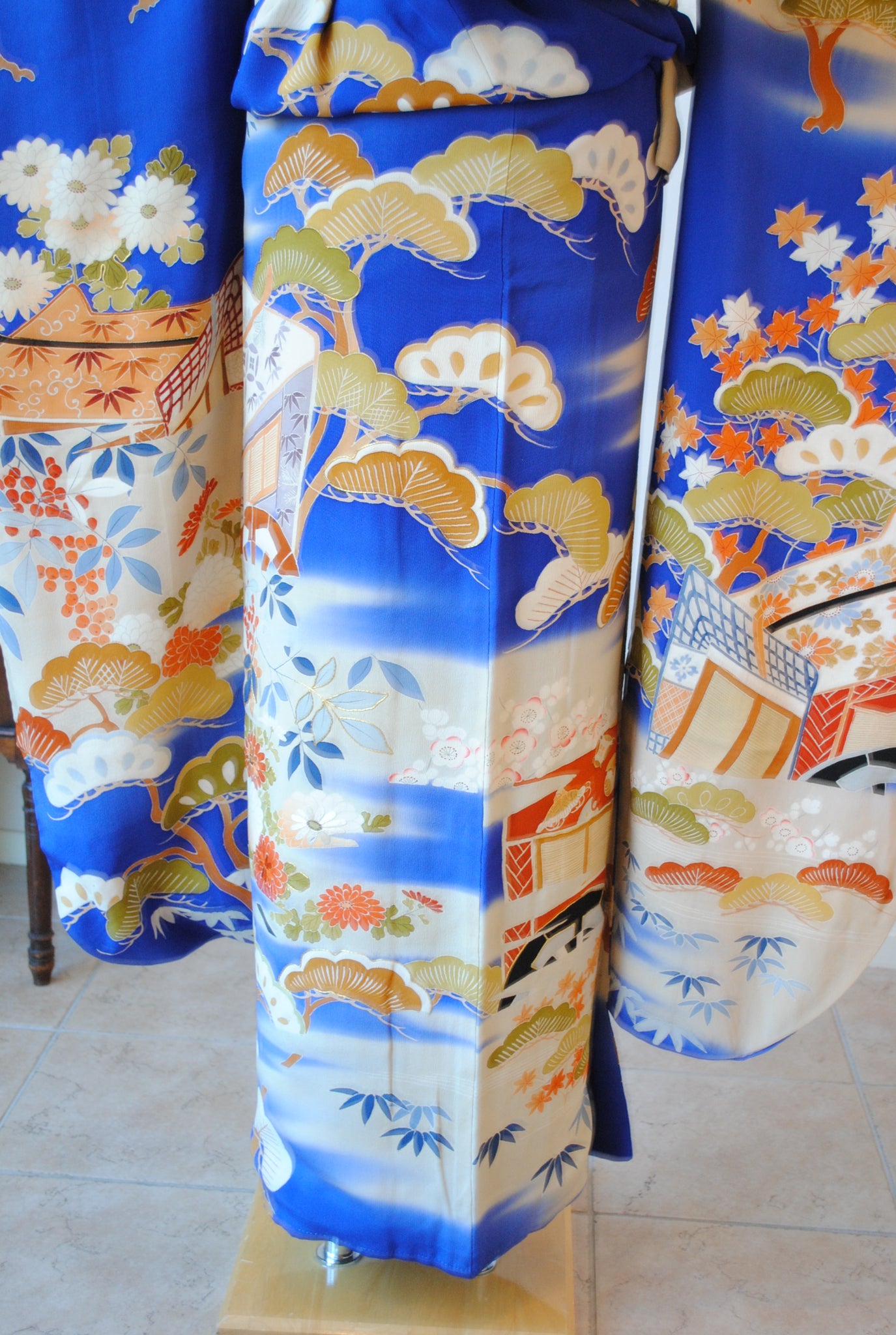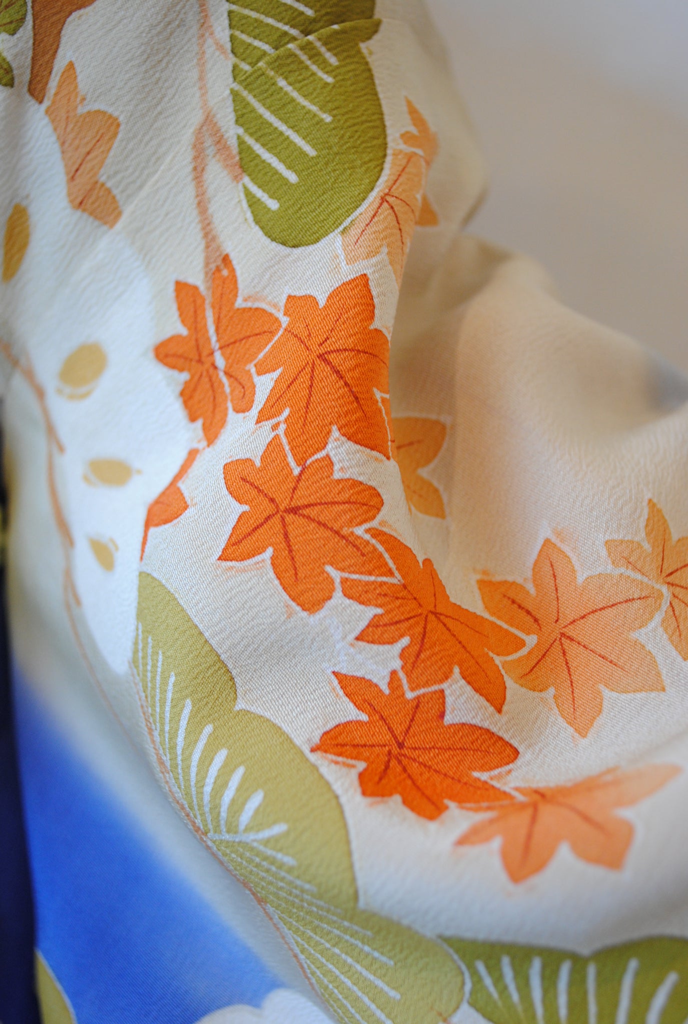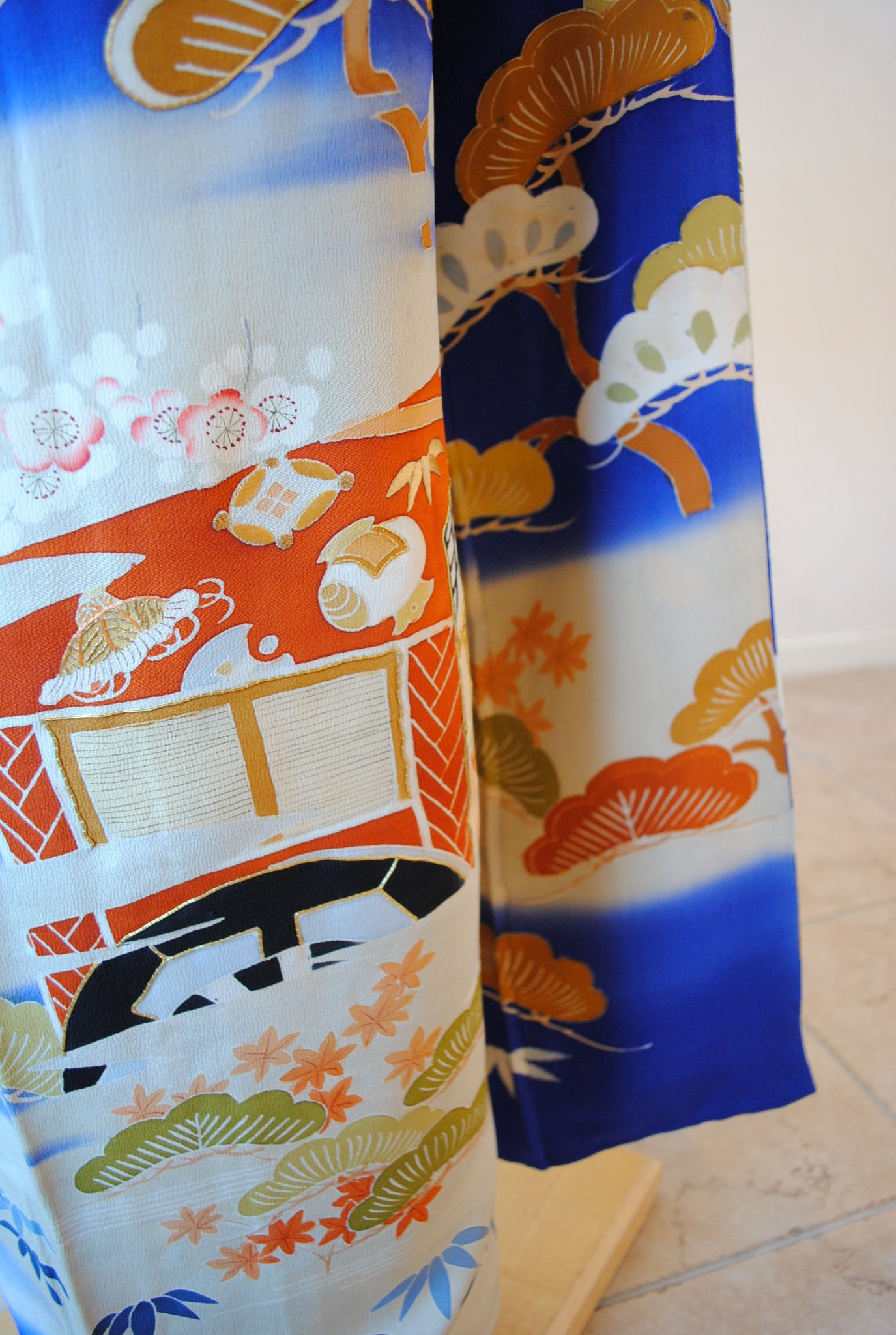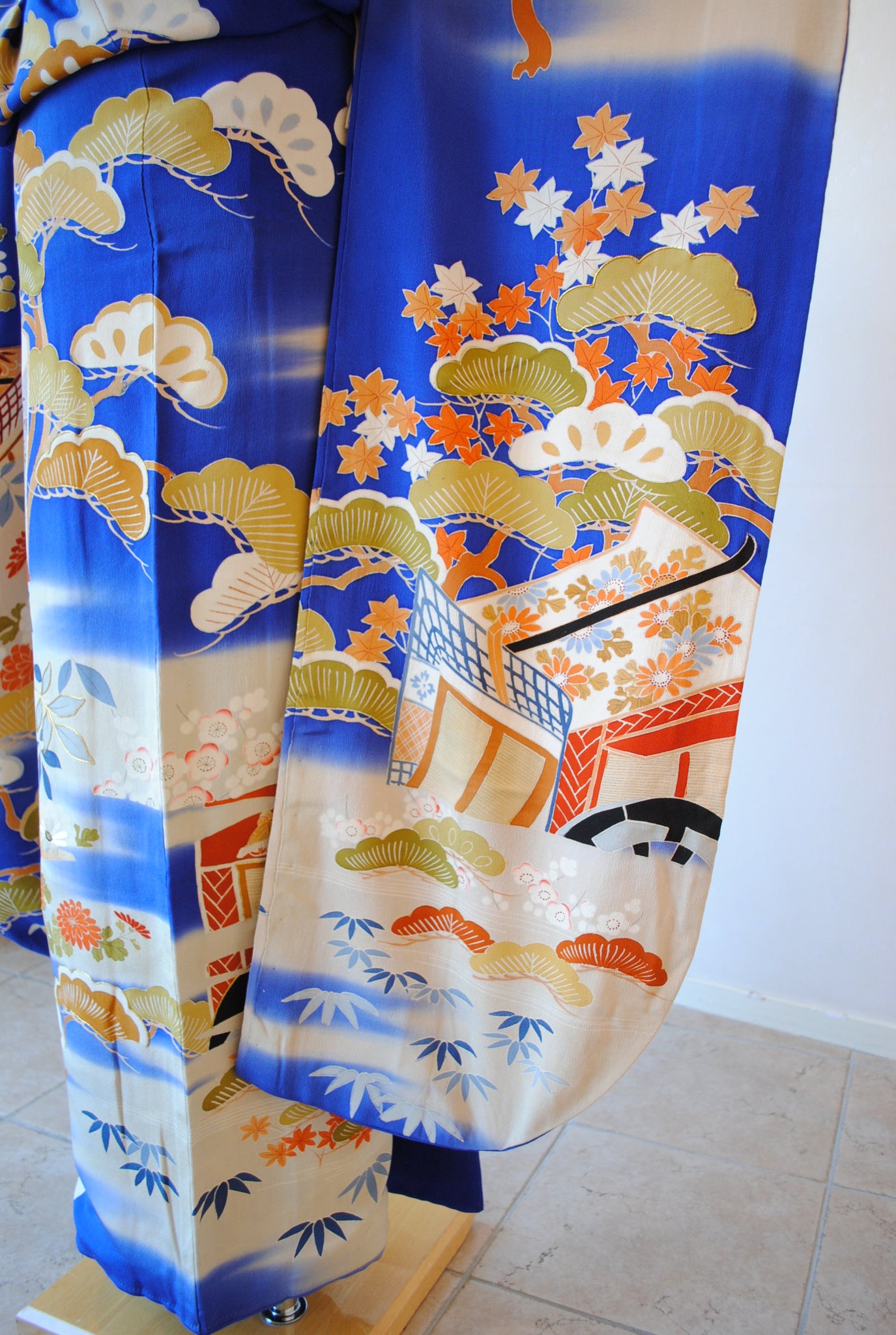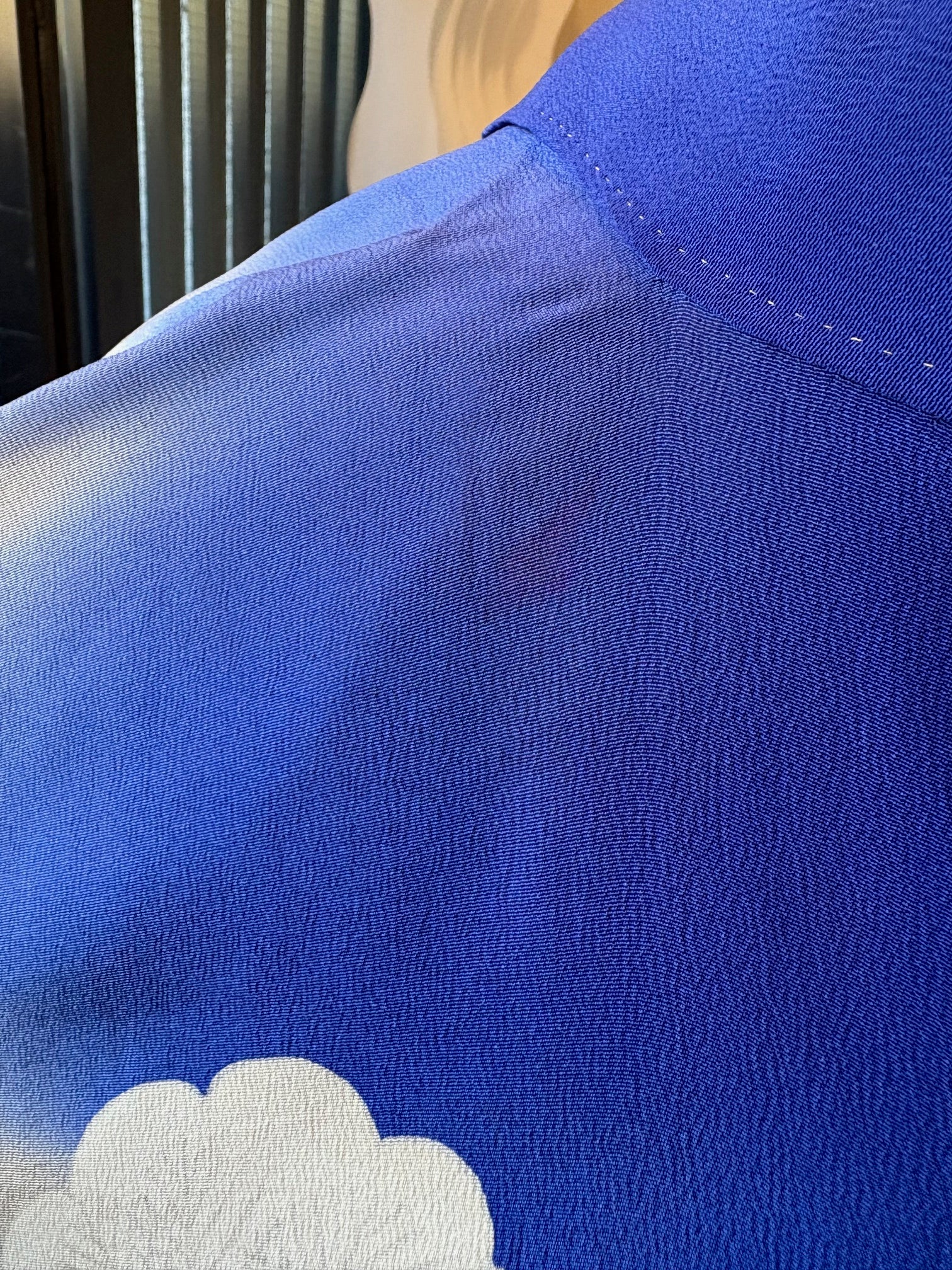 美しい青地に溶け込むぼかしが印象的なアンティーク振袖です。