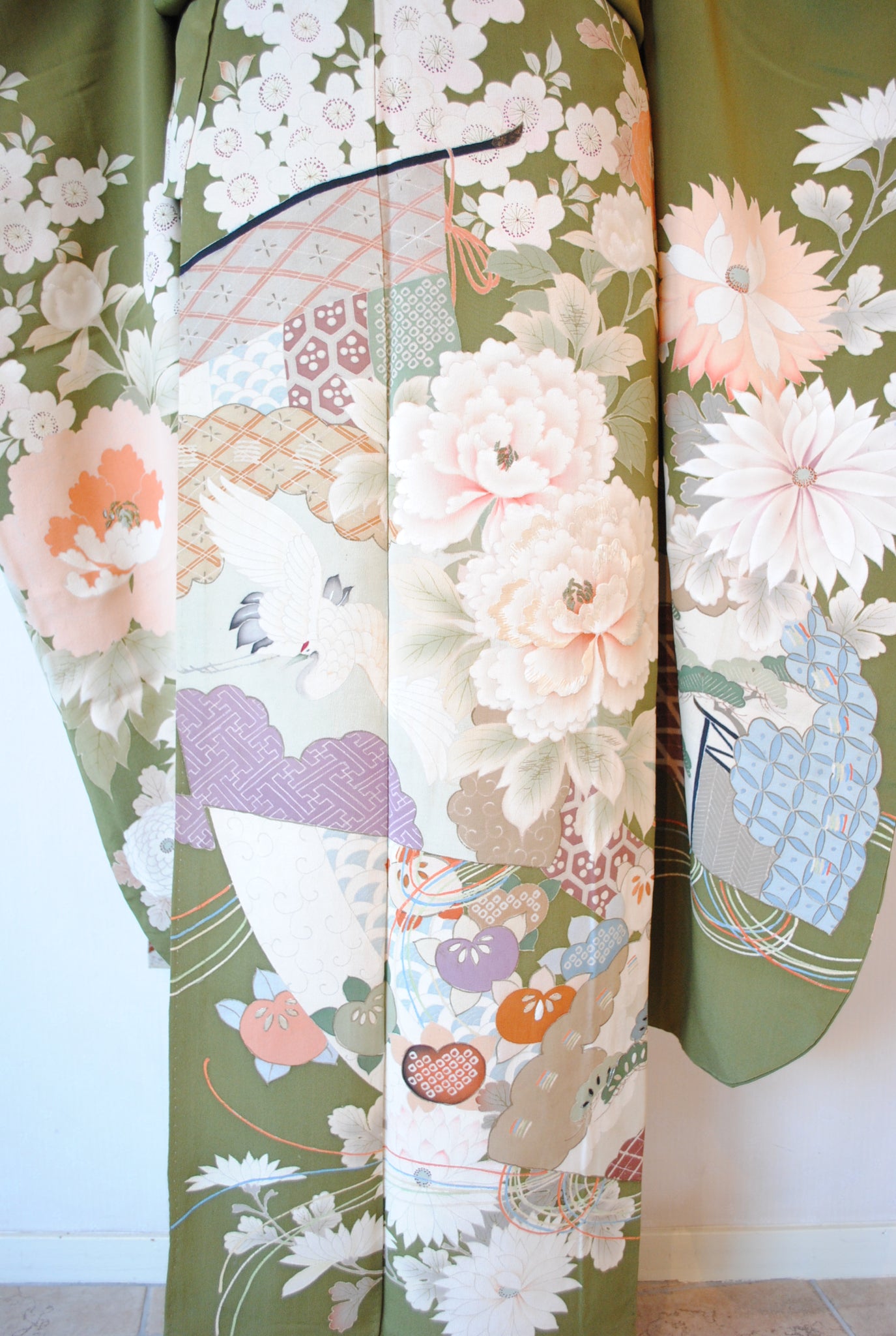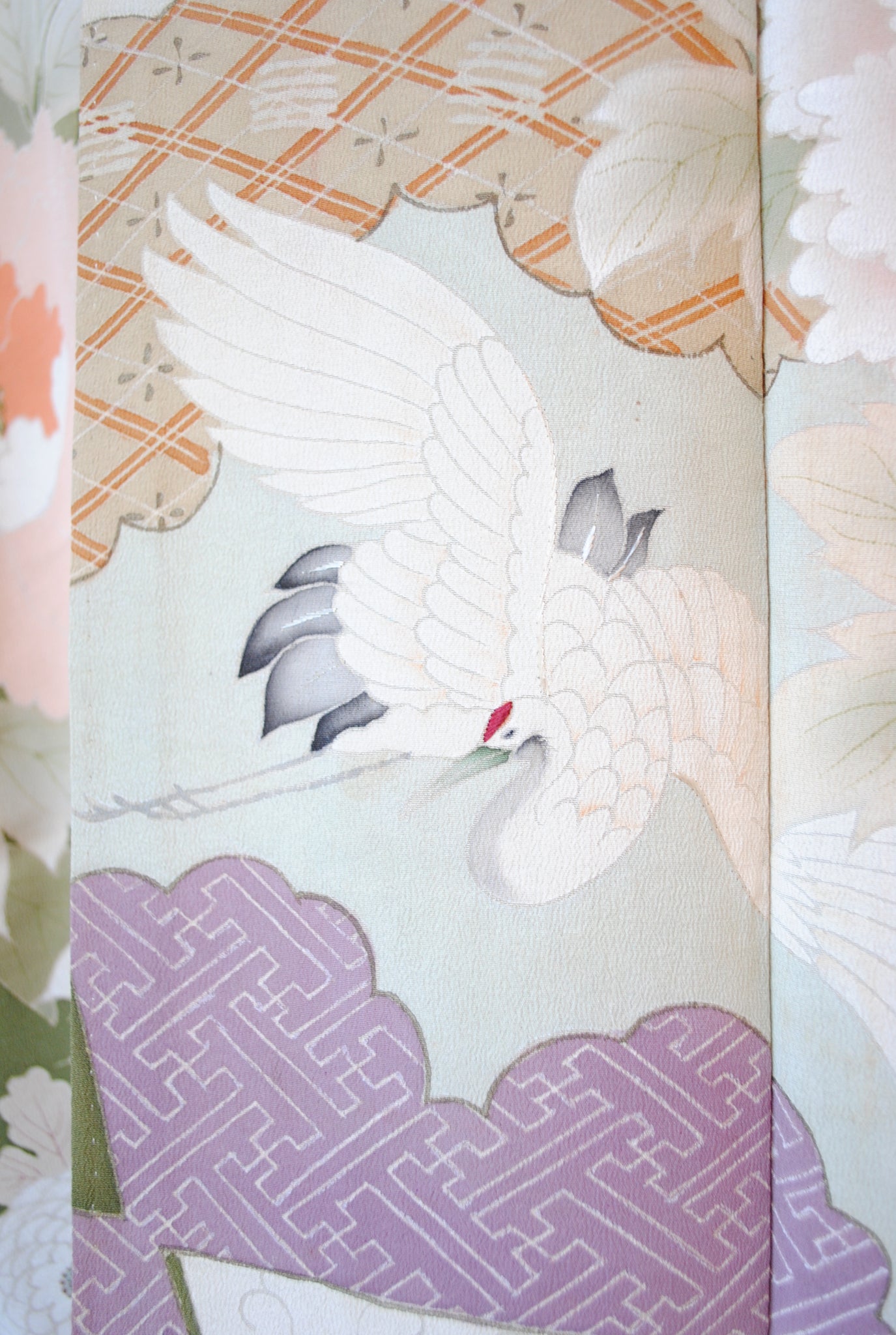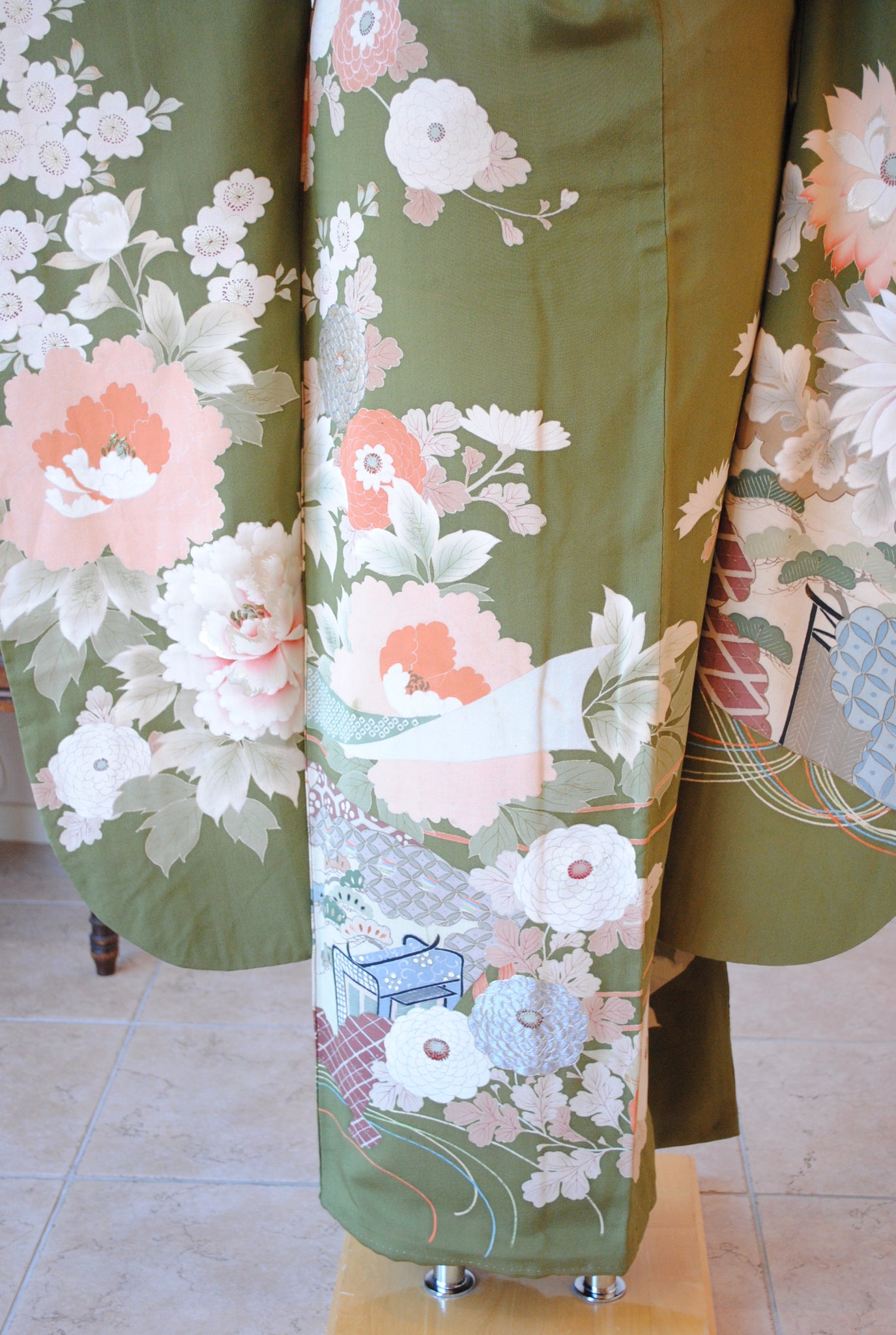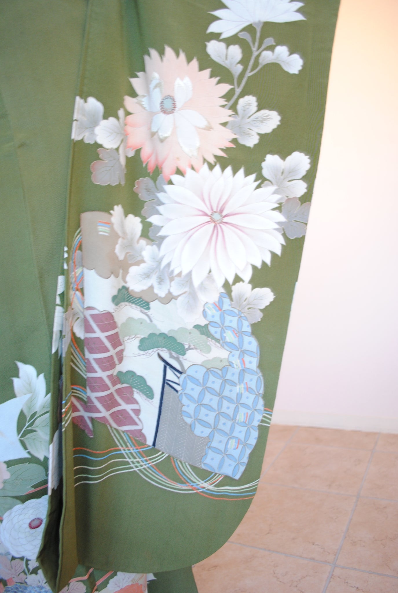 鶯色の地色に浮かび上がるように花々と御簾が描かれ、優美で古典的な雰囲気を漂わせています。