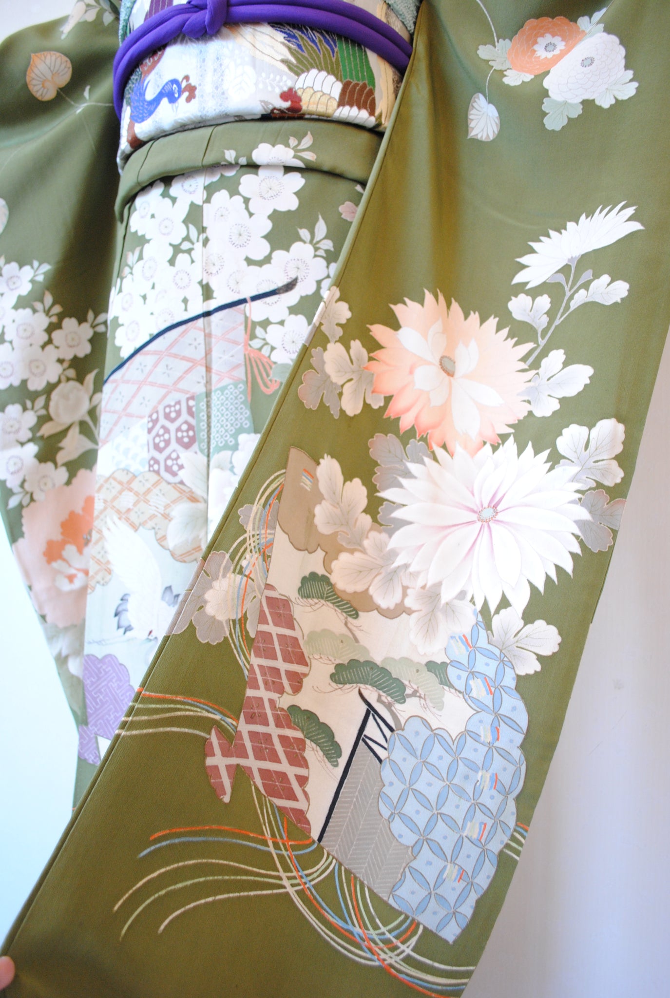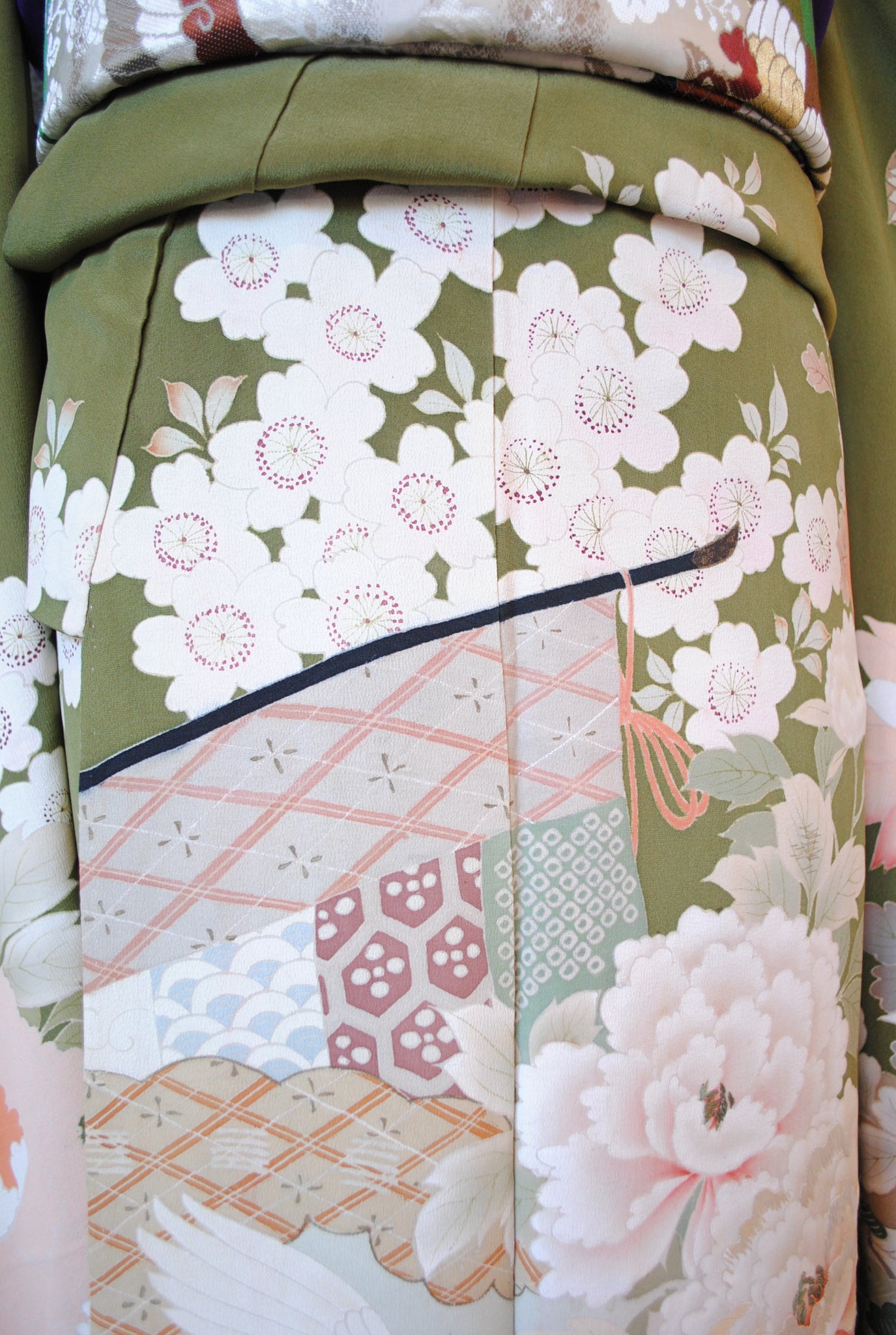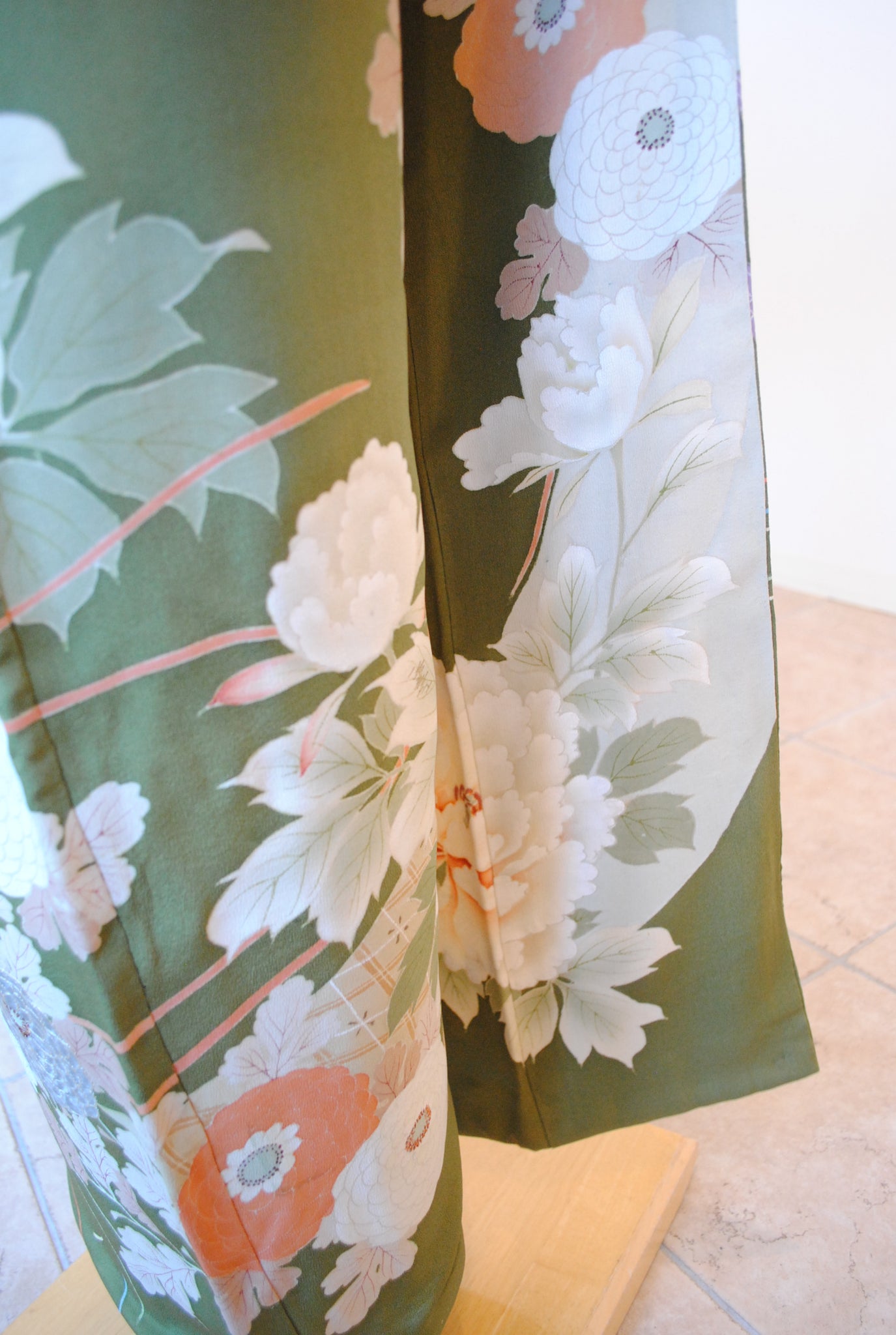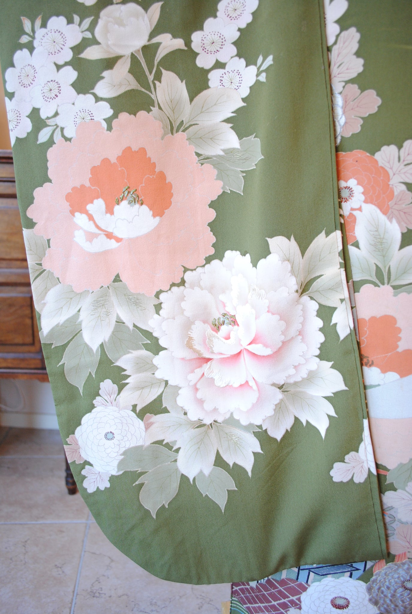 鶯色の地色に浮かび上がるように花々と御簾が描かれ、優美で古典的な雰囲気を漂わせています。