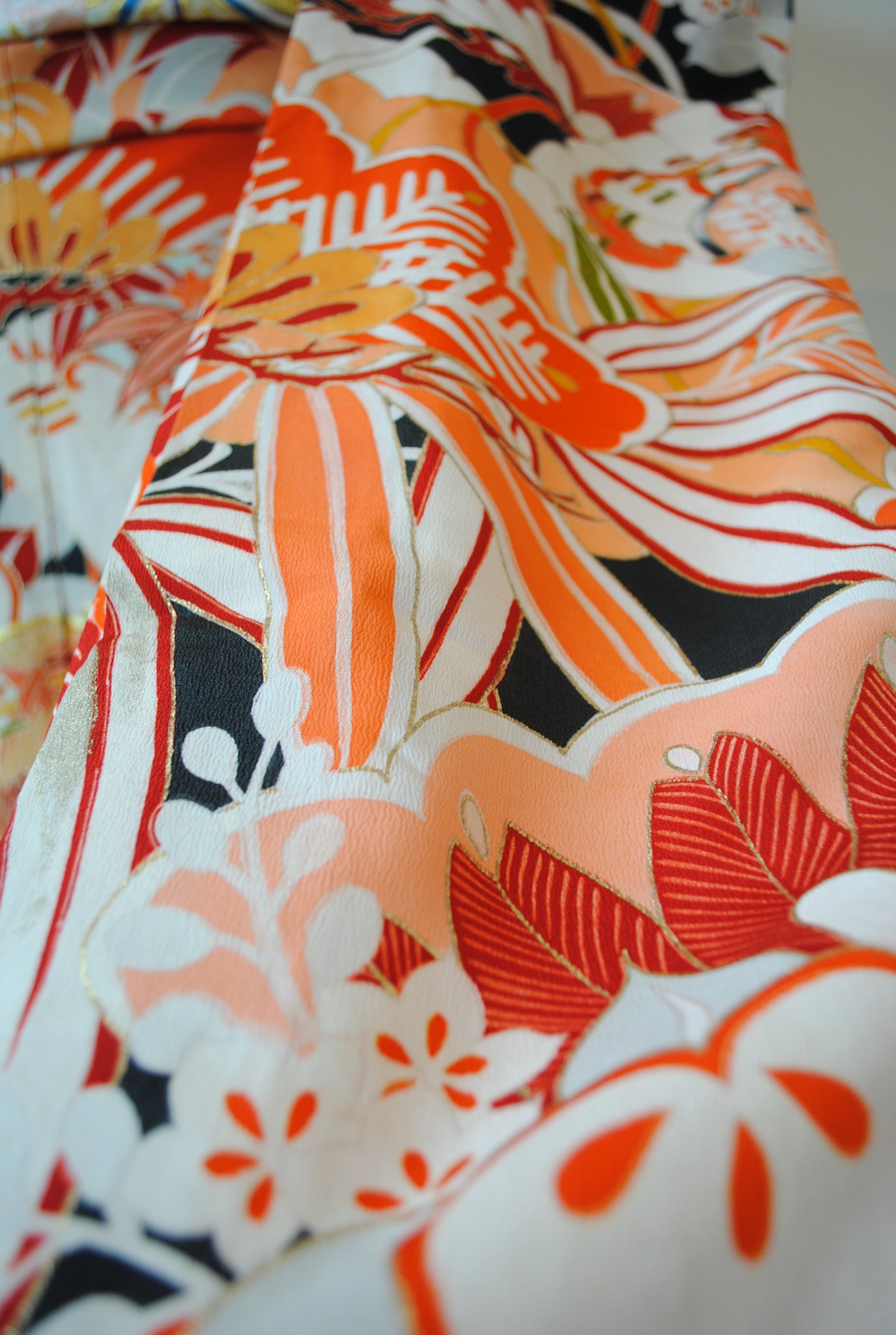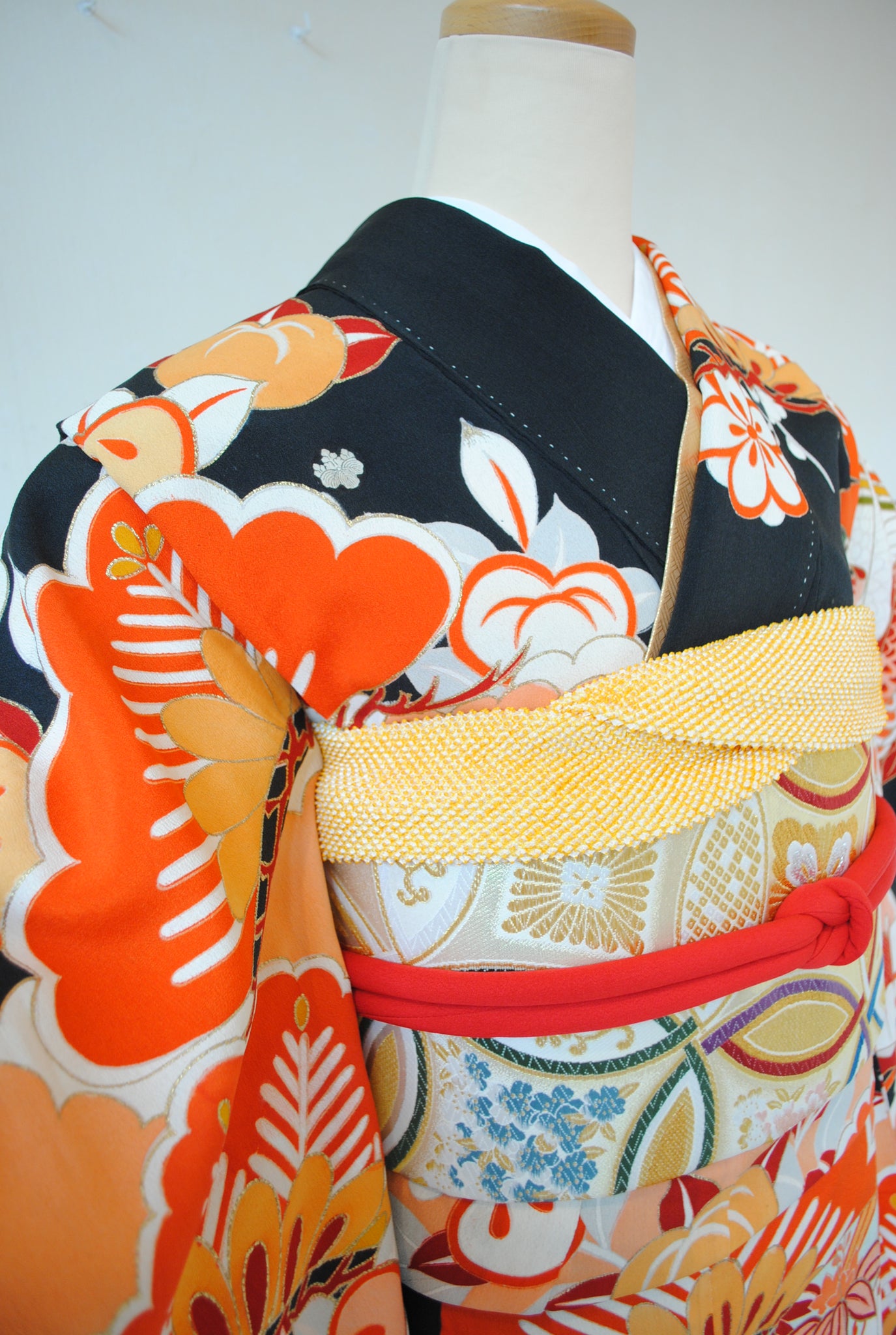 色数を抑えた配色が文様の力強さと構図の美しさを際立たせ、着る人の佇まいを凛と引き立ててくれる振袖です。成人式だけではなく、ご婚礼衣裳としても是非お召しください。