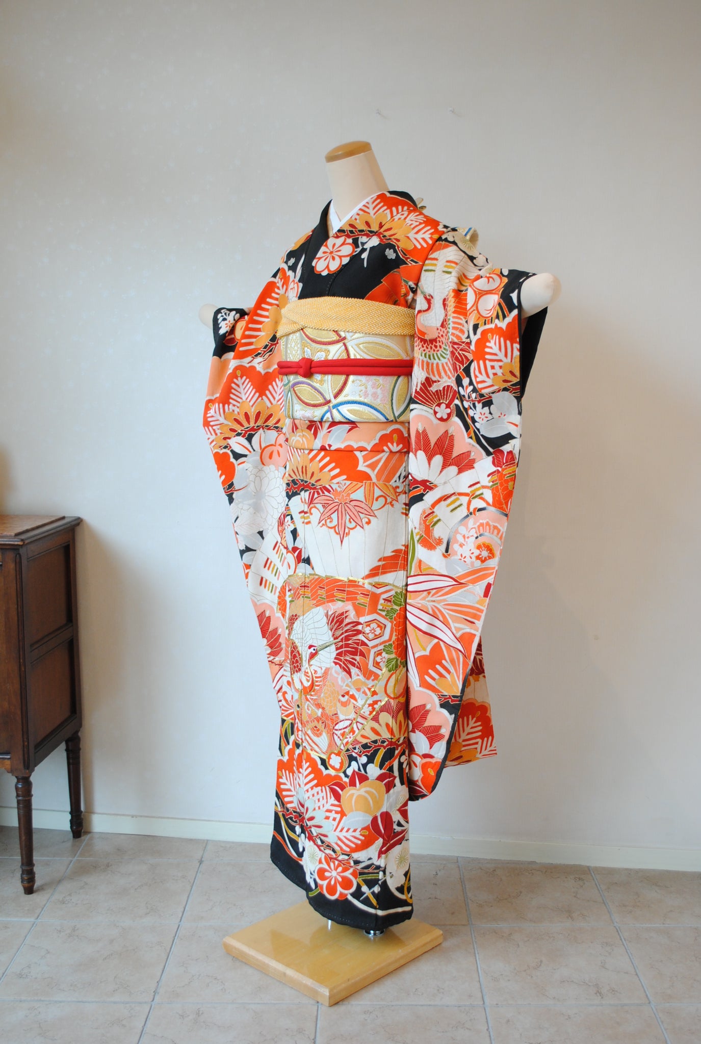 No.265 赤松に鶴檜扇文様黒振袖