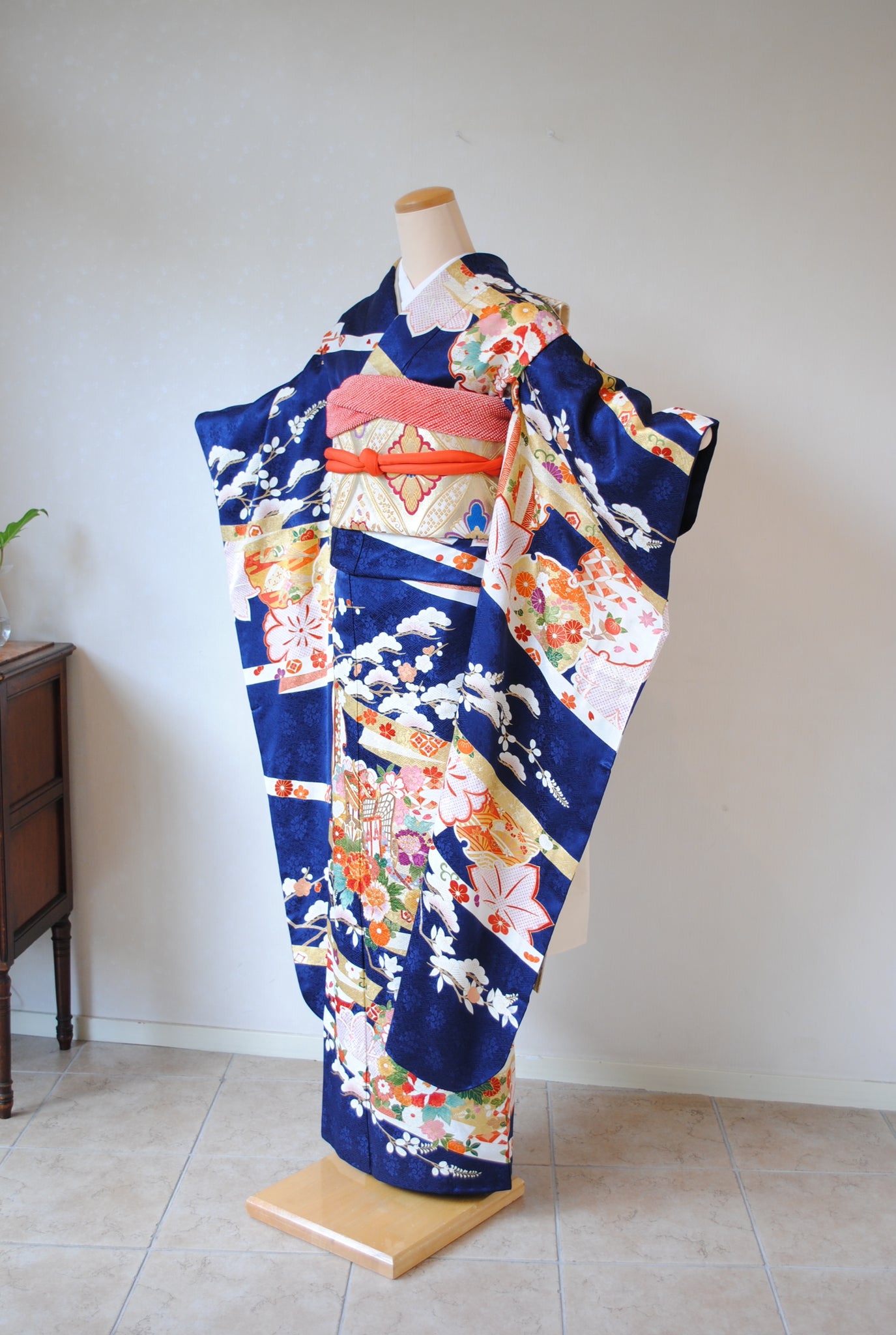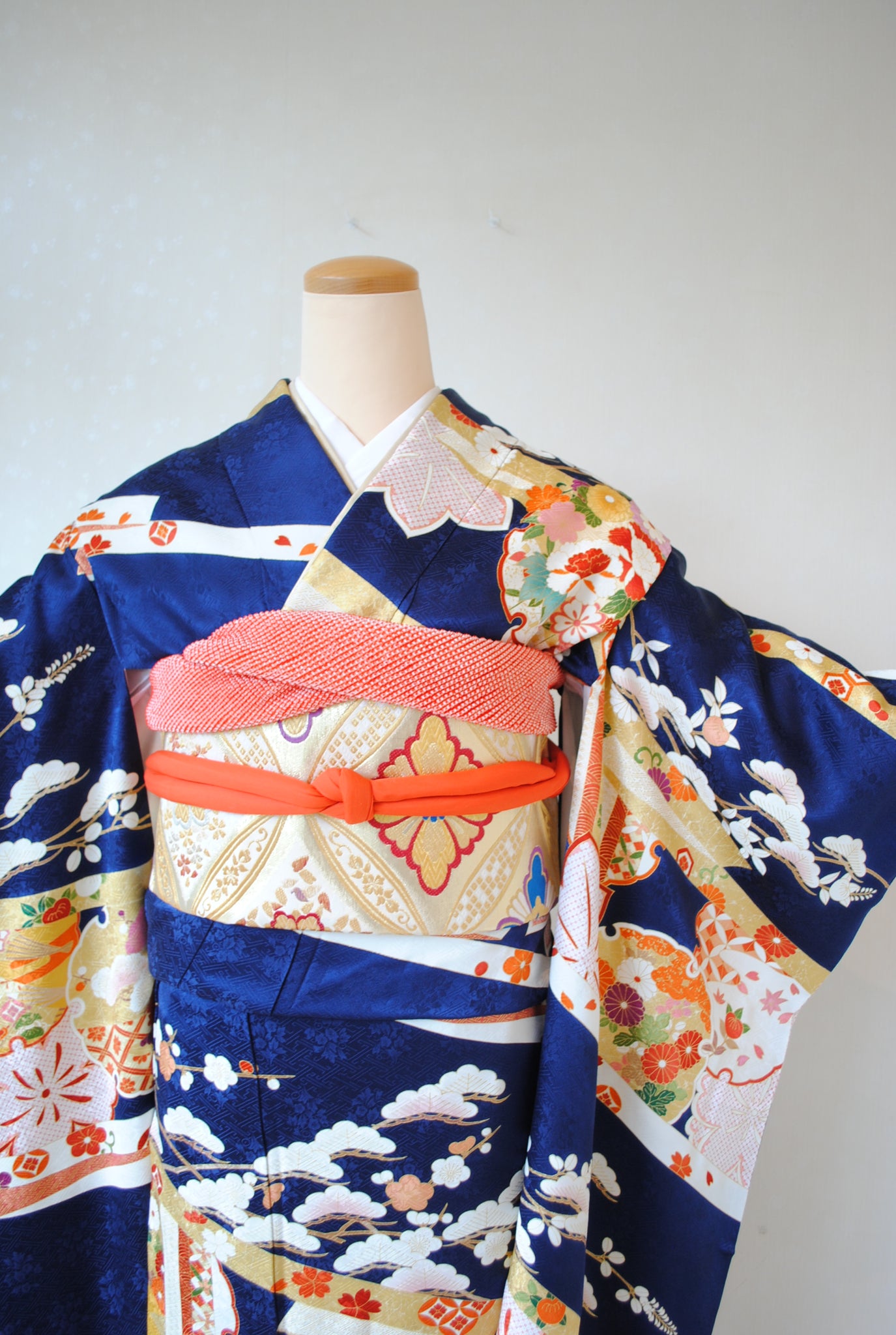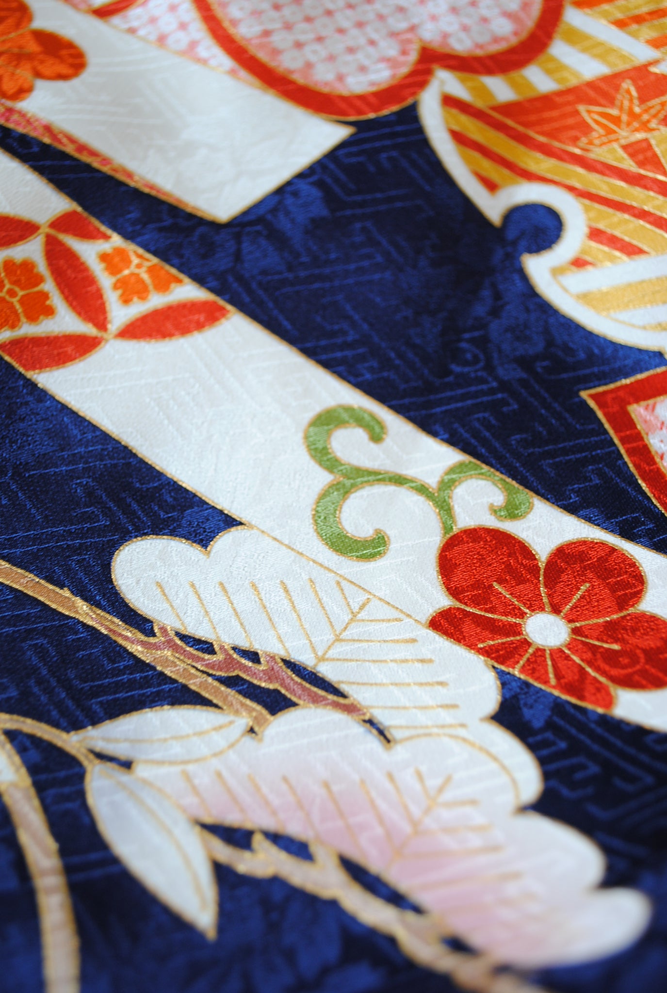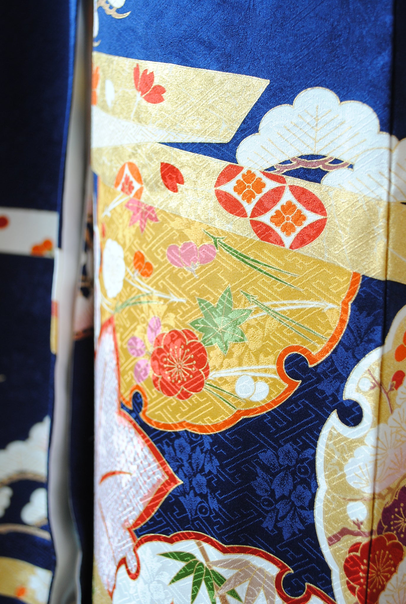 人気の紺色地に、御所車、松、楓や桜の鹿の子文様など、雅やかな古典柄が配されています。