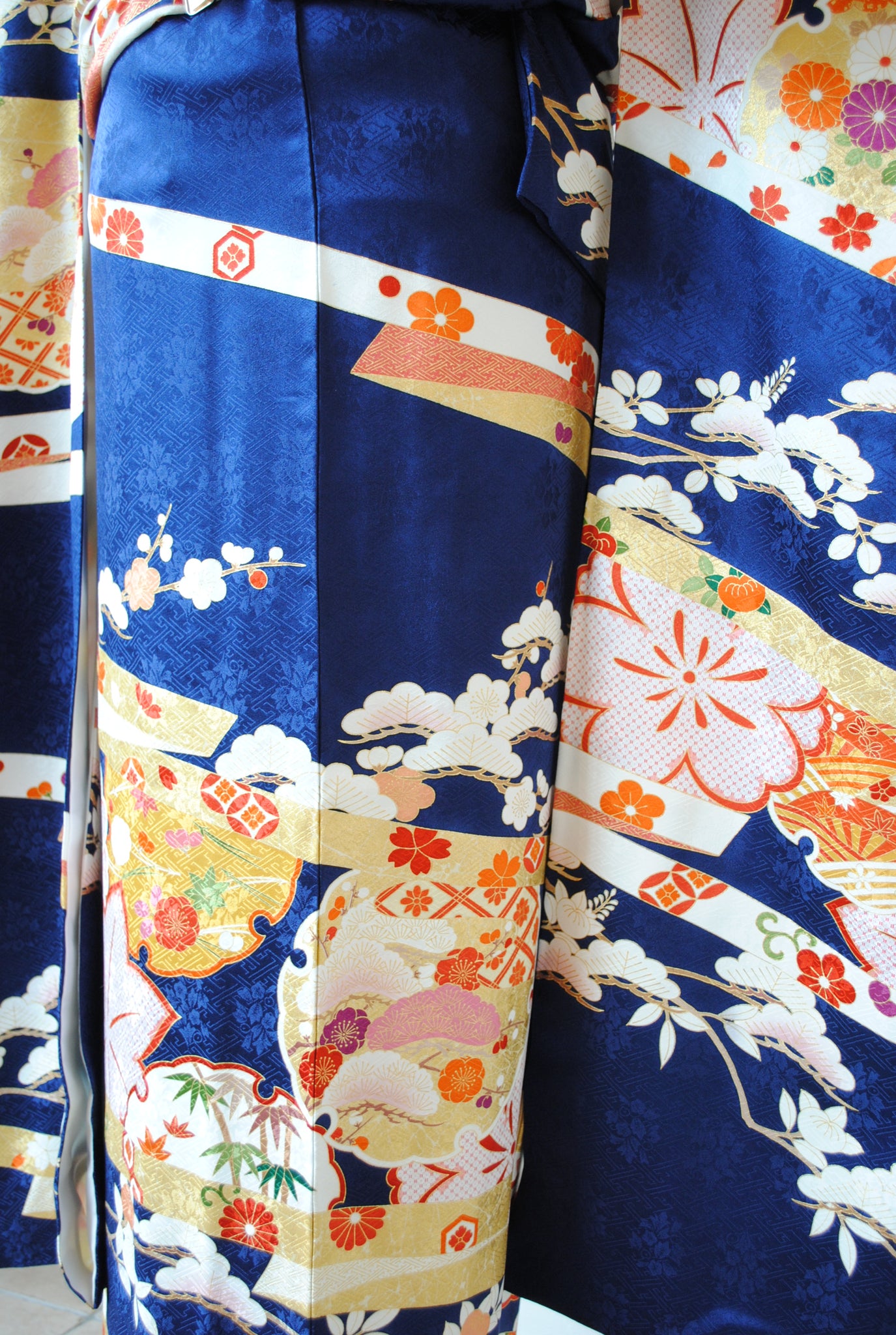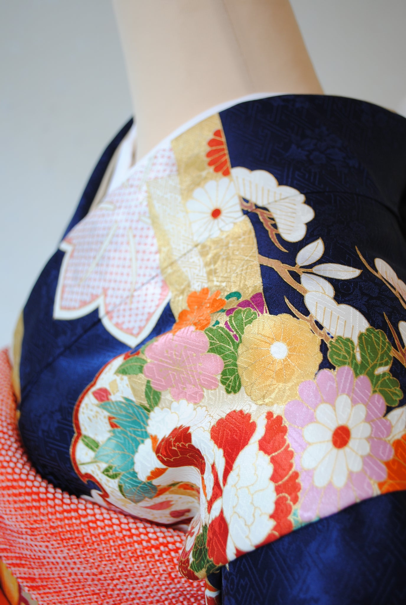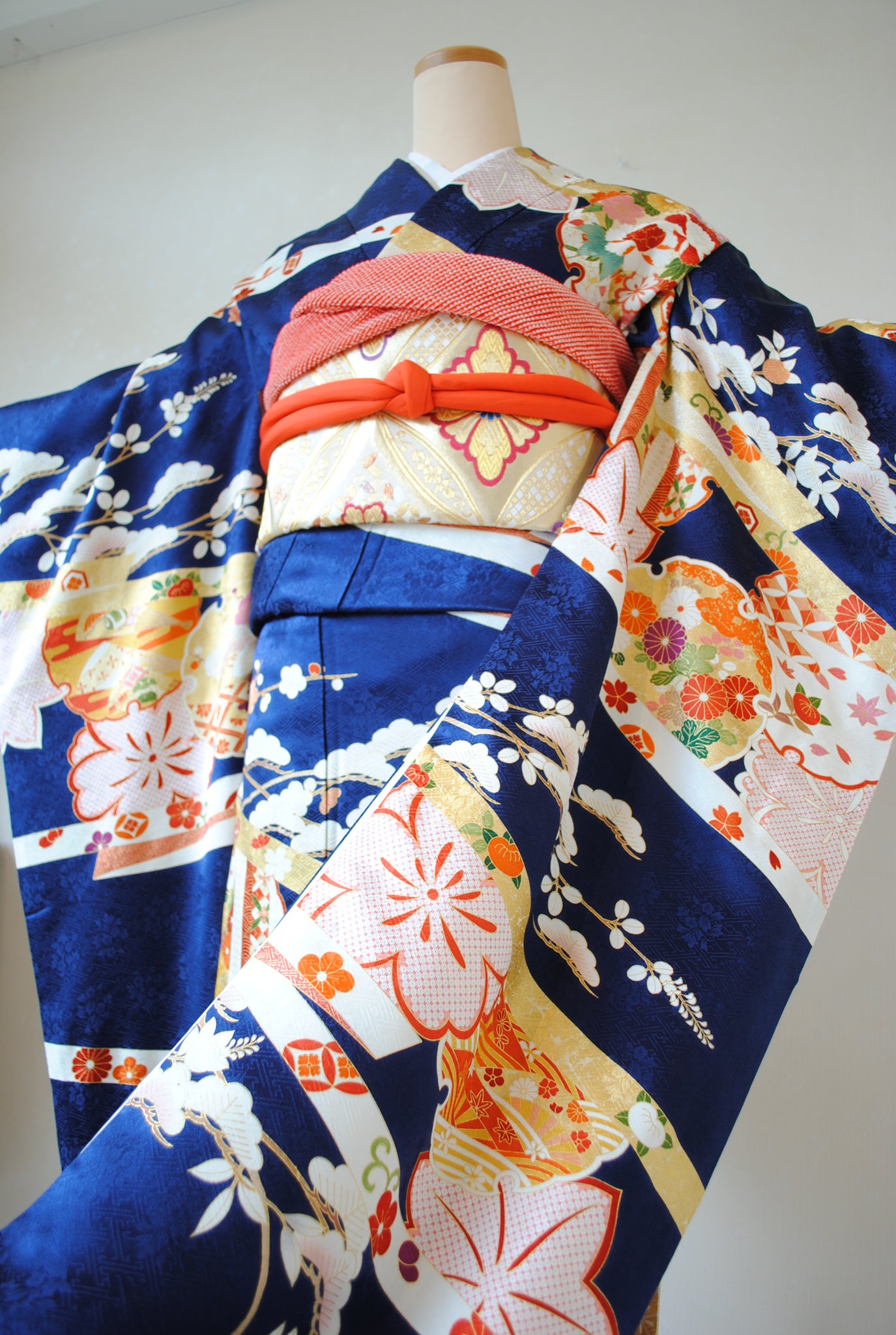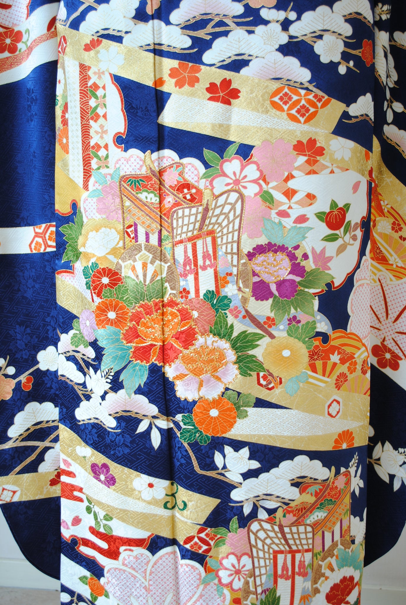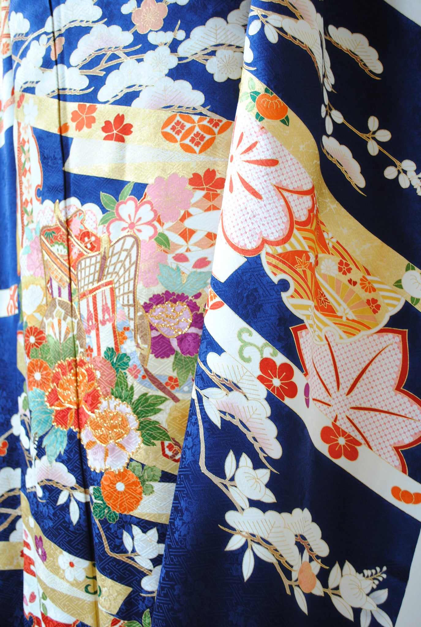 人気の紺色地に、御所車、松、楓や桜の鹿の子文様など、雅やかな古典柄が配されています。