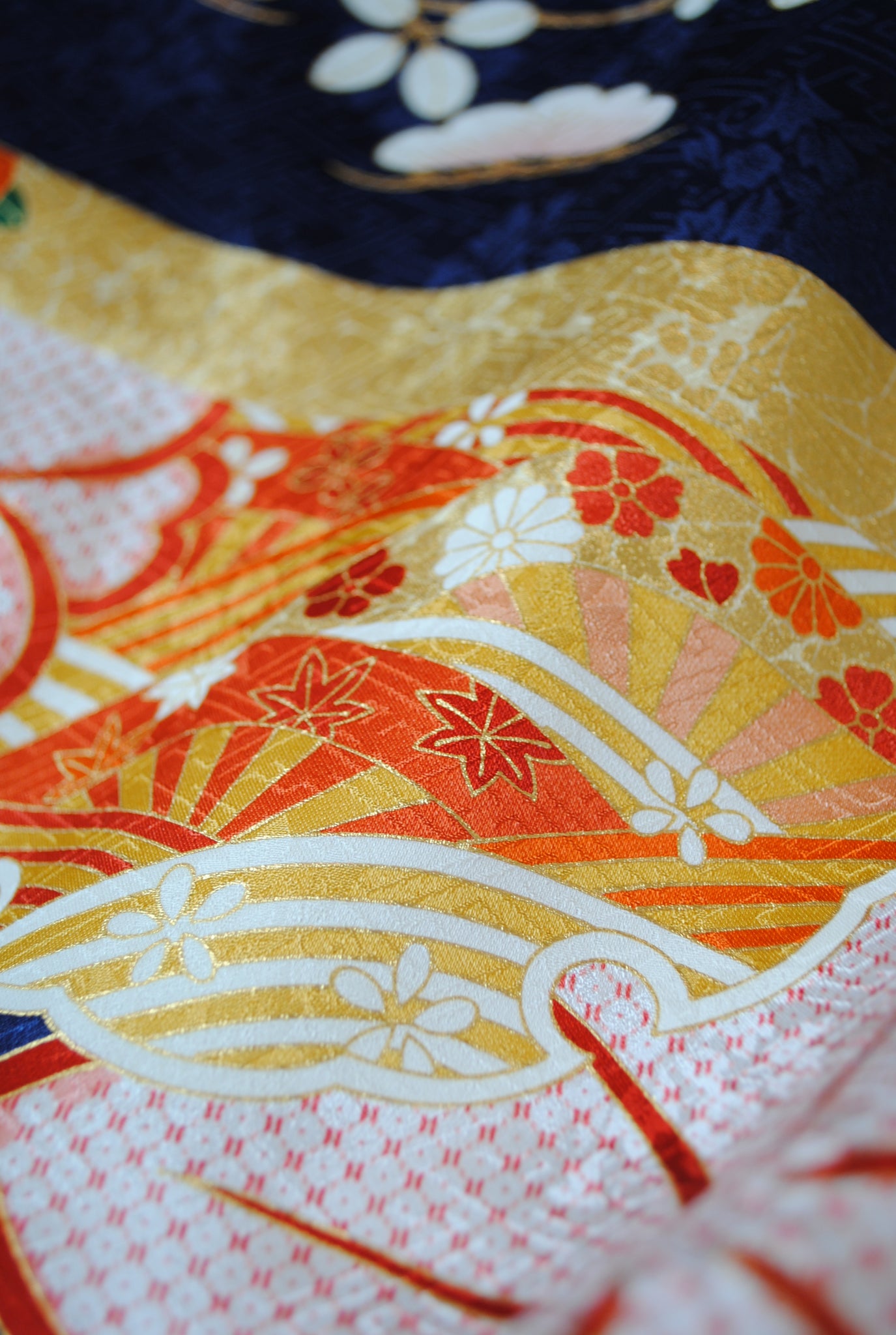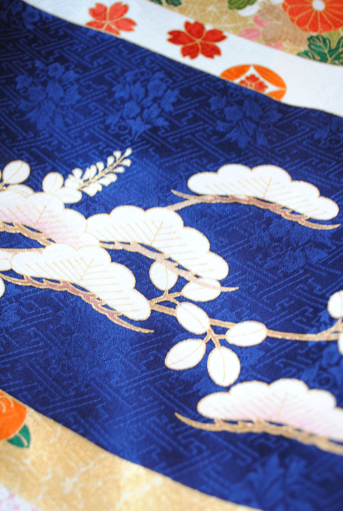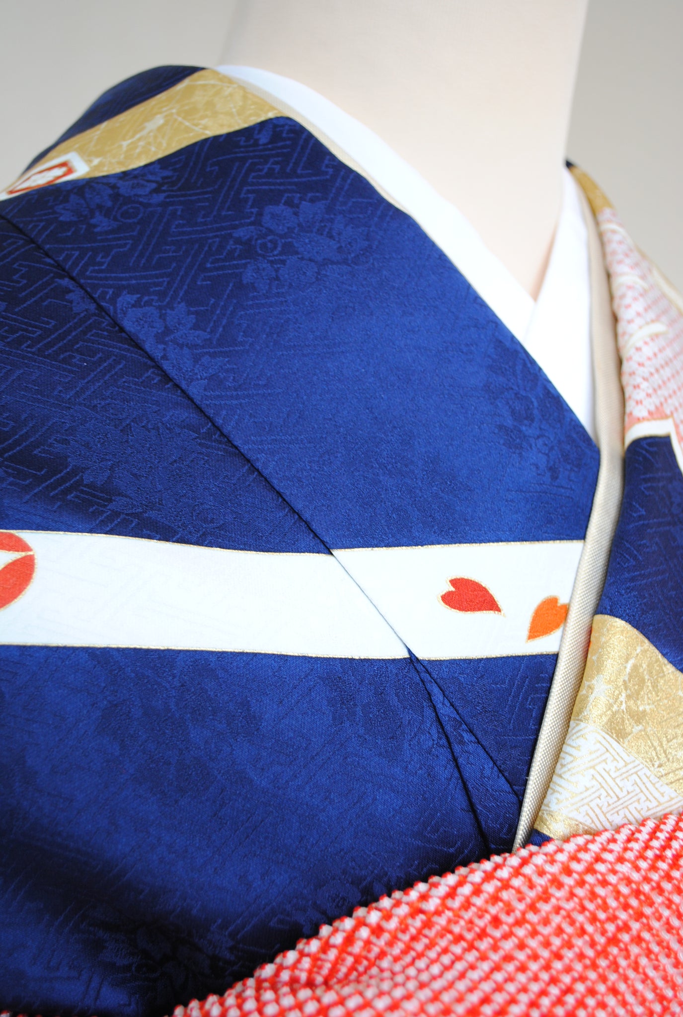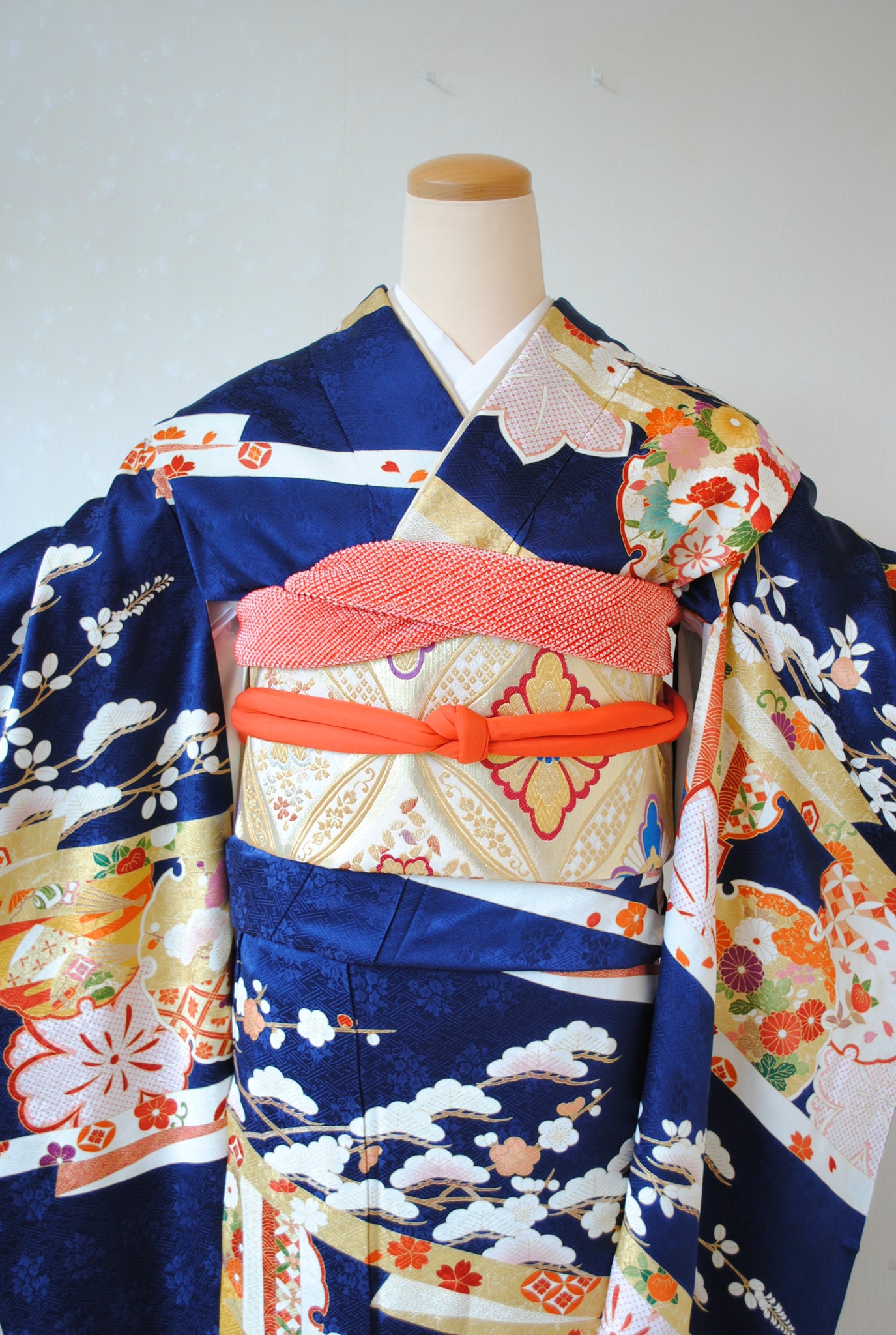 人気の紺色地に、御所車、松、楓や桜の鹿の子文様など、雅やかな古典柄が配されています。