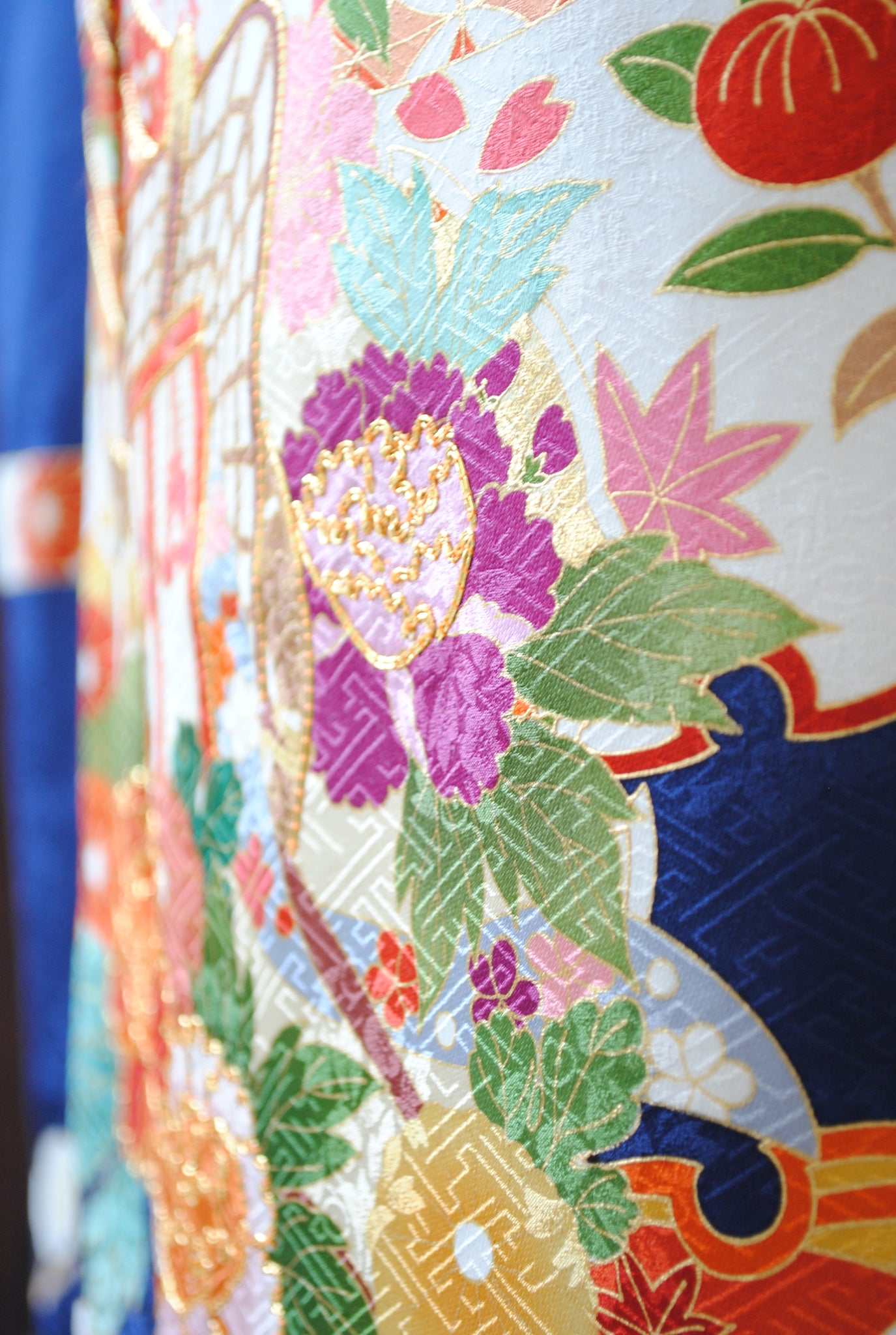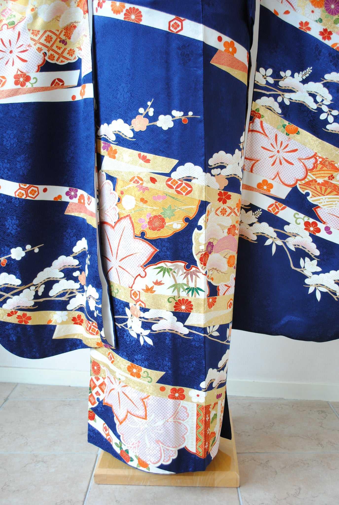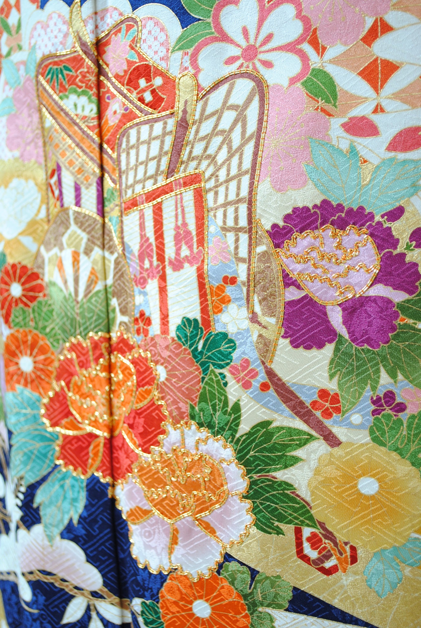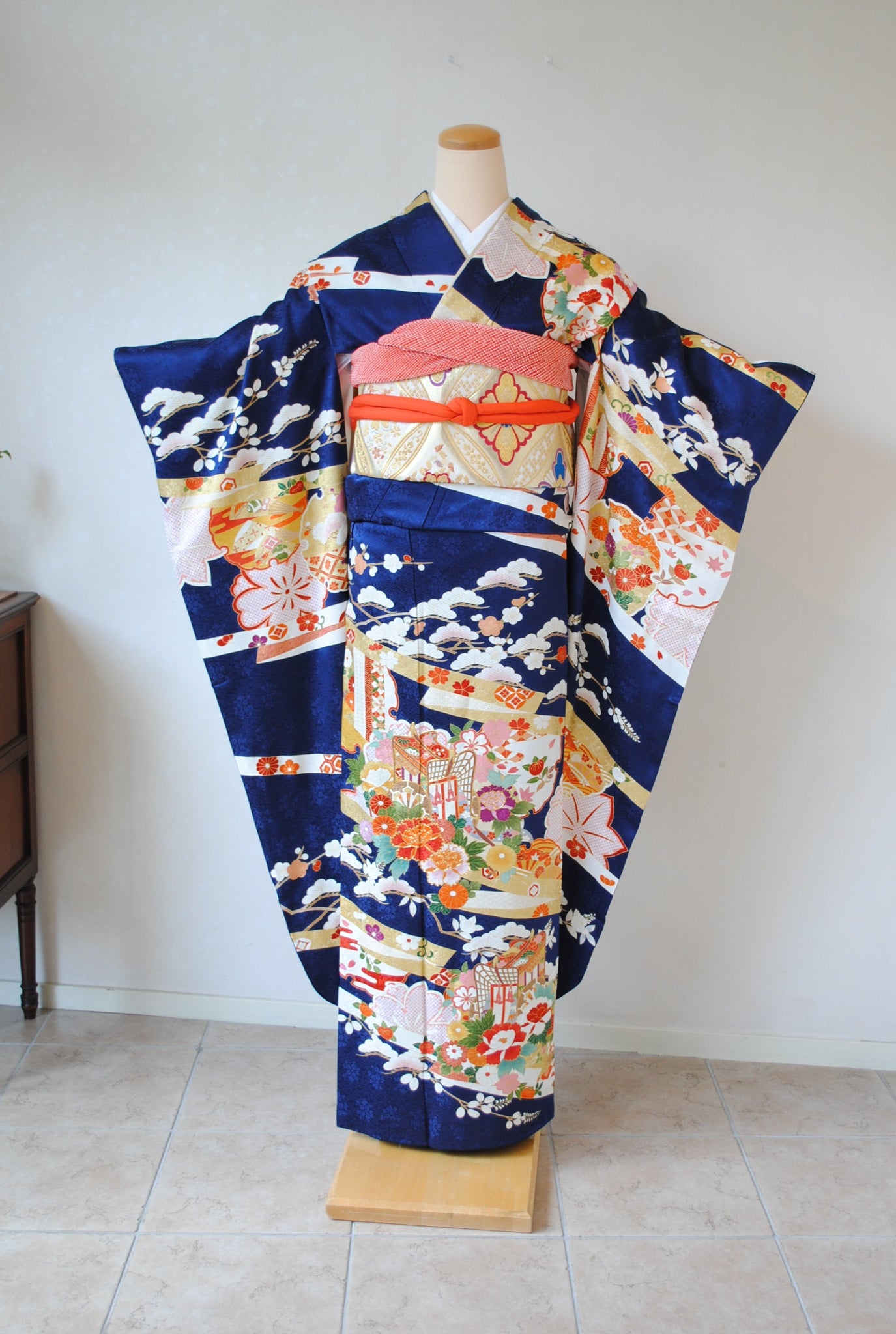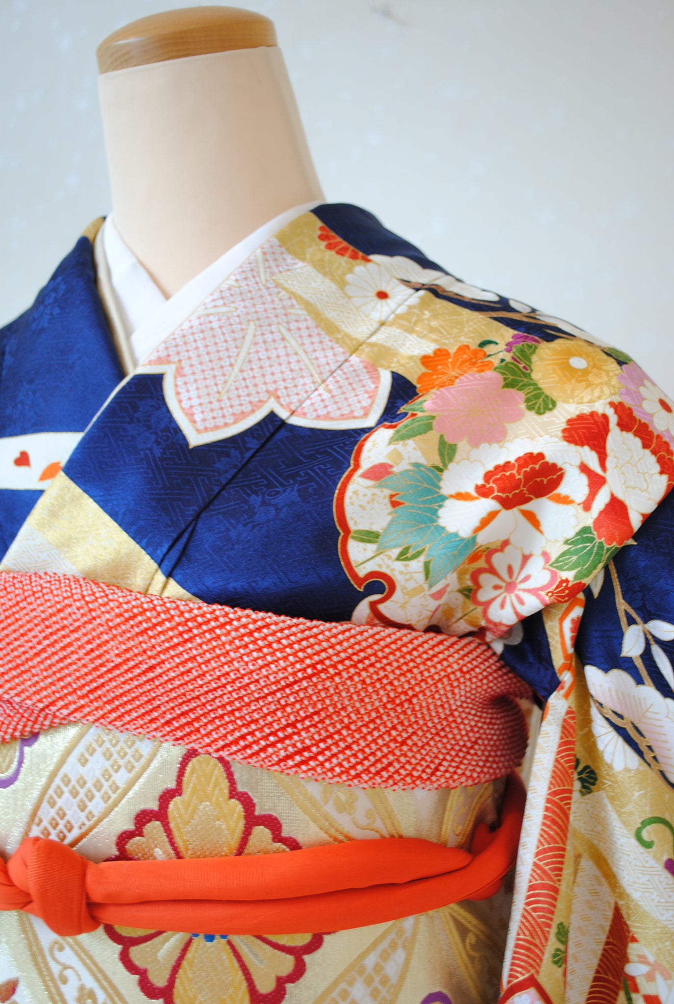 人気の紺色地に、御所車、松、楓や桜の鹿の子文様など、雅やかな古典柄が配されています。