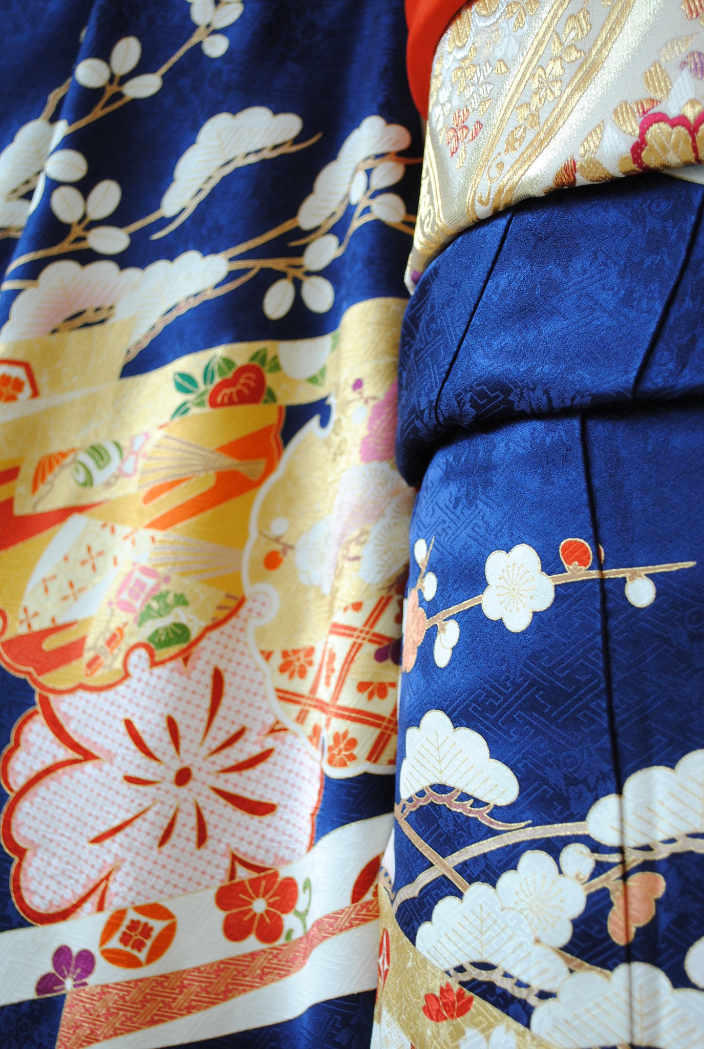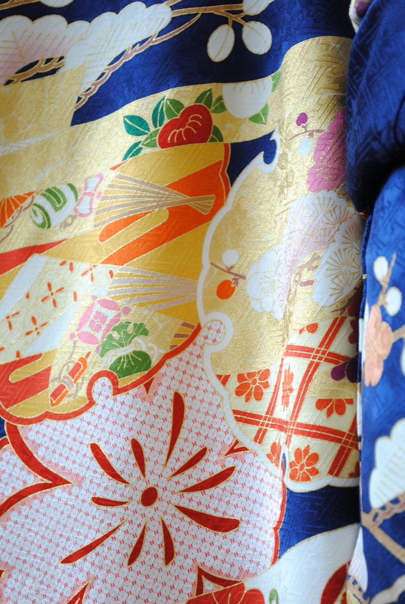 御所車は、平安貴族が用いた牛車を文様化したもので「高貴さ」「格調」の象徴。さらに幸せを運ぶ吉祥文様として現代にも受け継がれています。松は長寿や不変。桜や楓は四季の移ろいを映し出し、華やかにな晴れ着に相応しい意匠です。