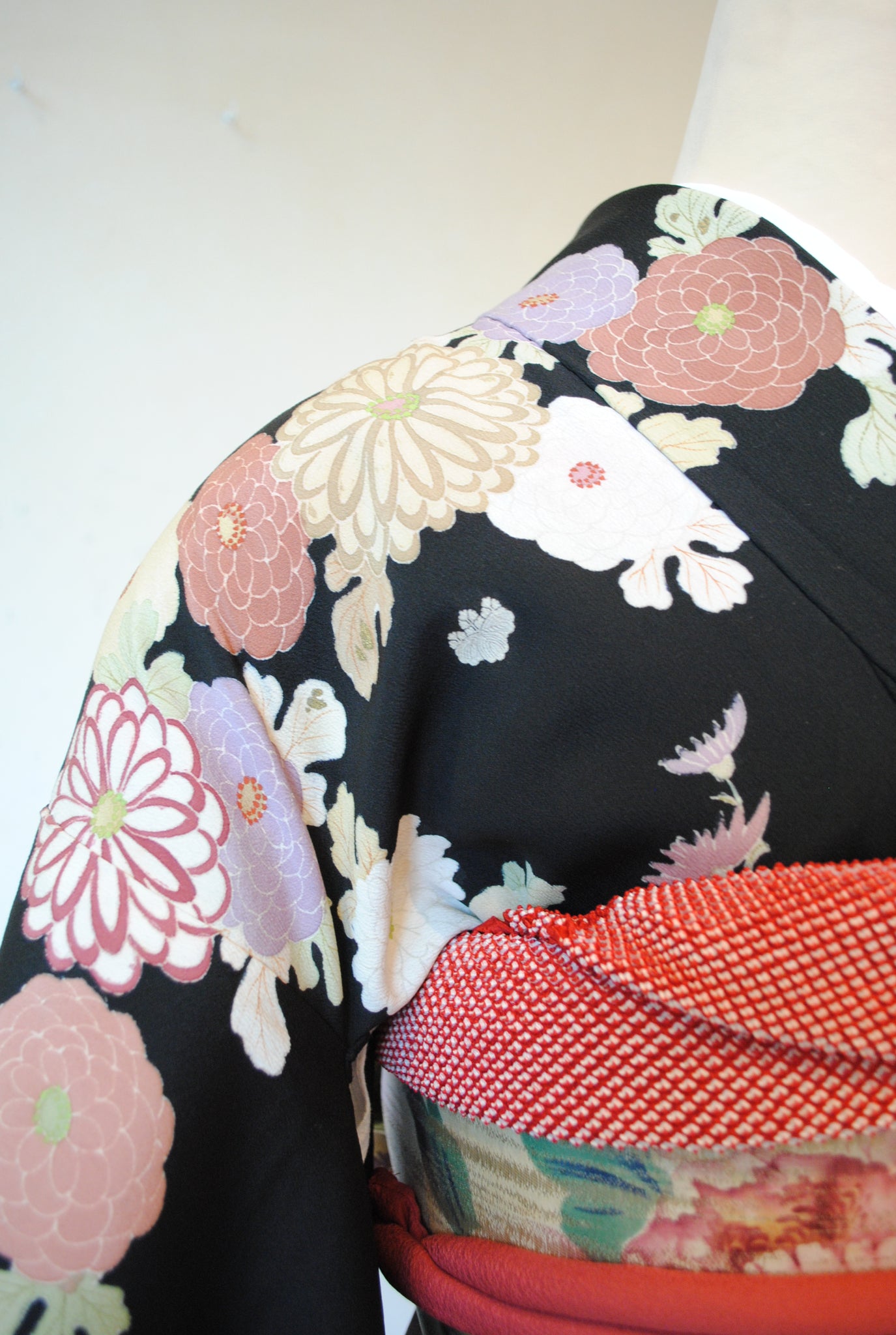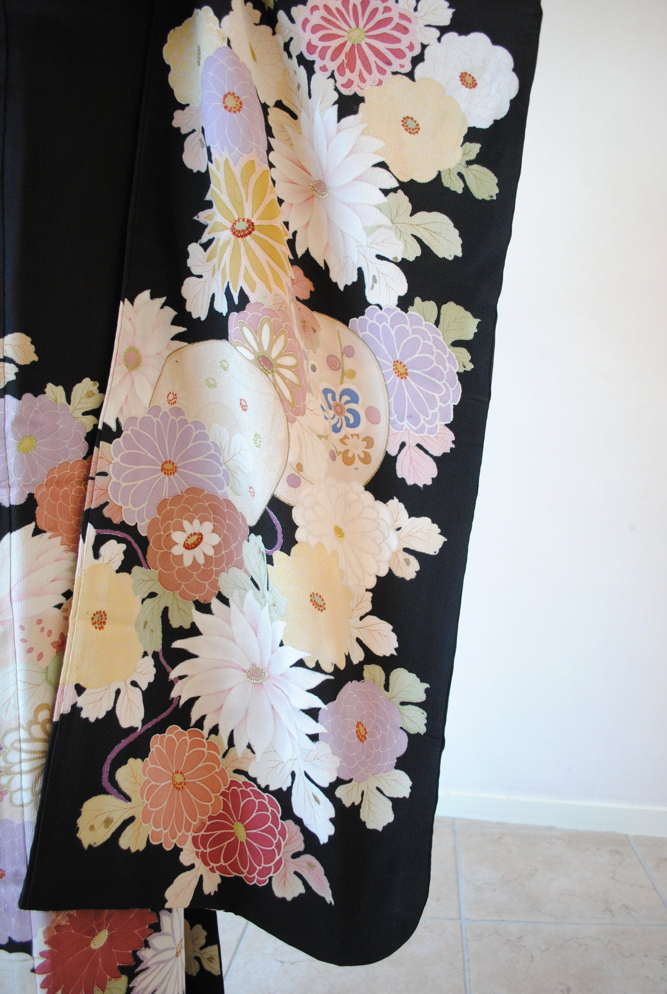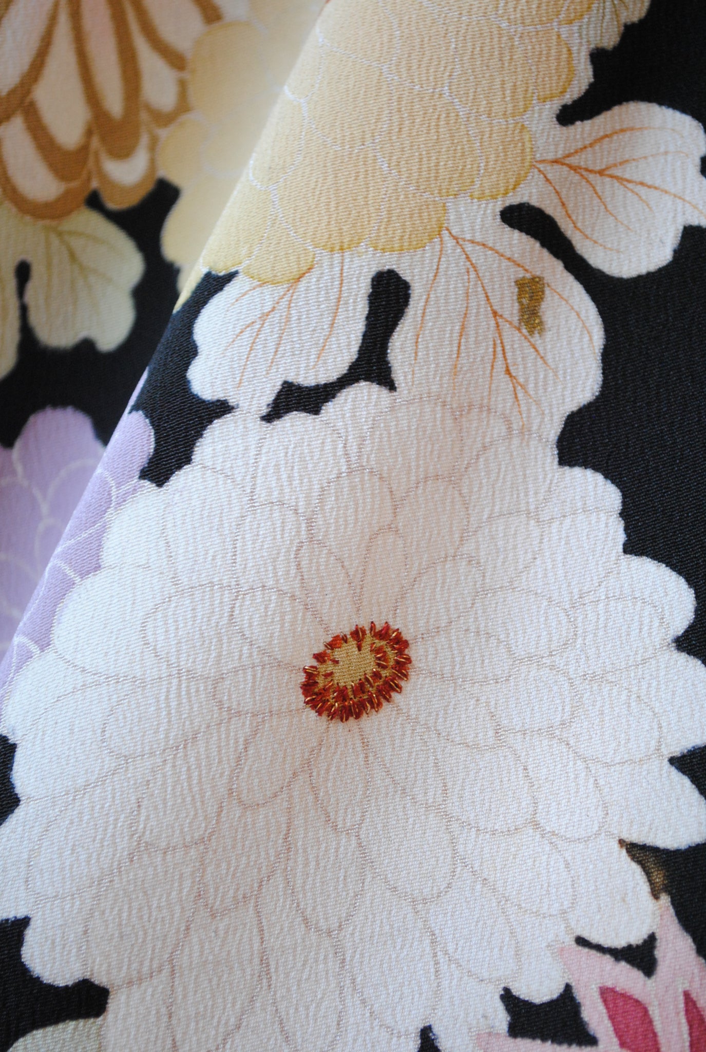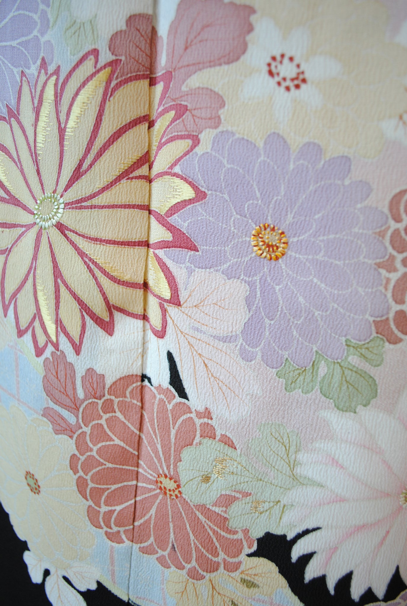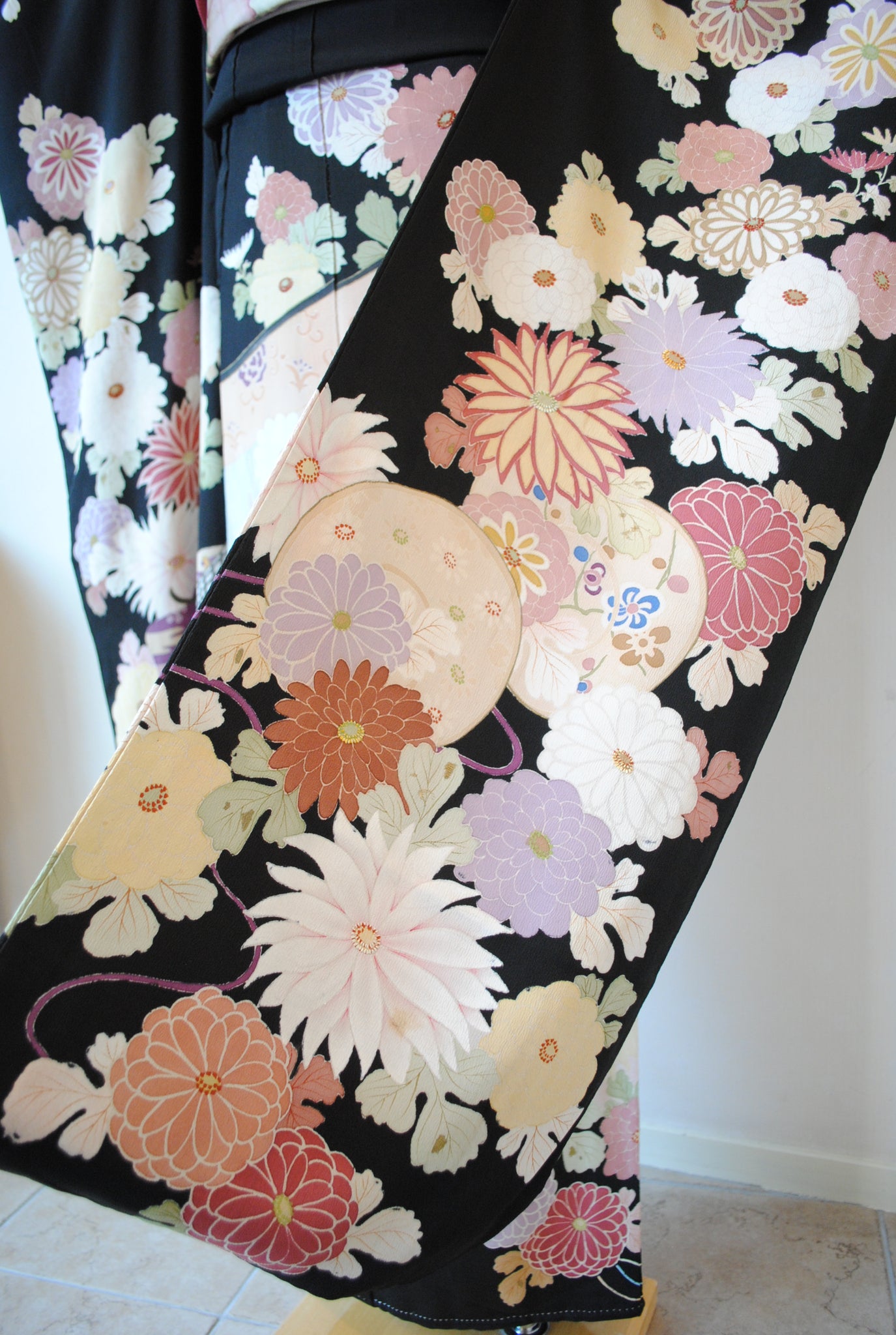 時を経た墨黒の上質な絹地に浮かび上がる菊の花。薄紫や桃色の花弁はくすみを帯びて、パステルほど明るくなく、深みをたたえた良い色になっています。