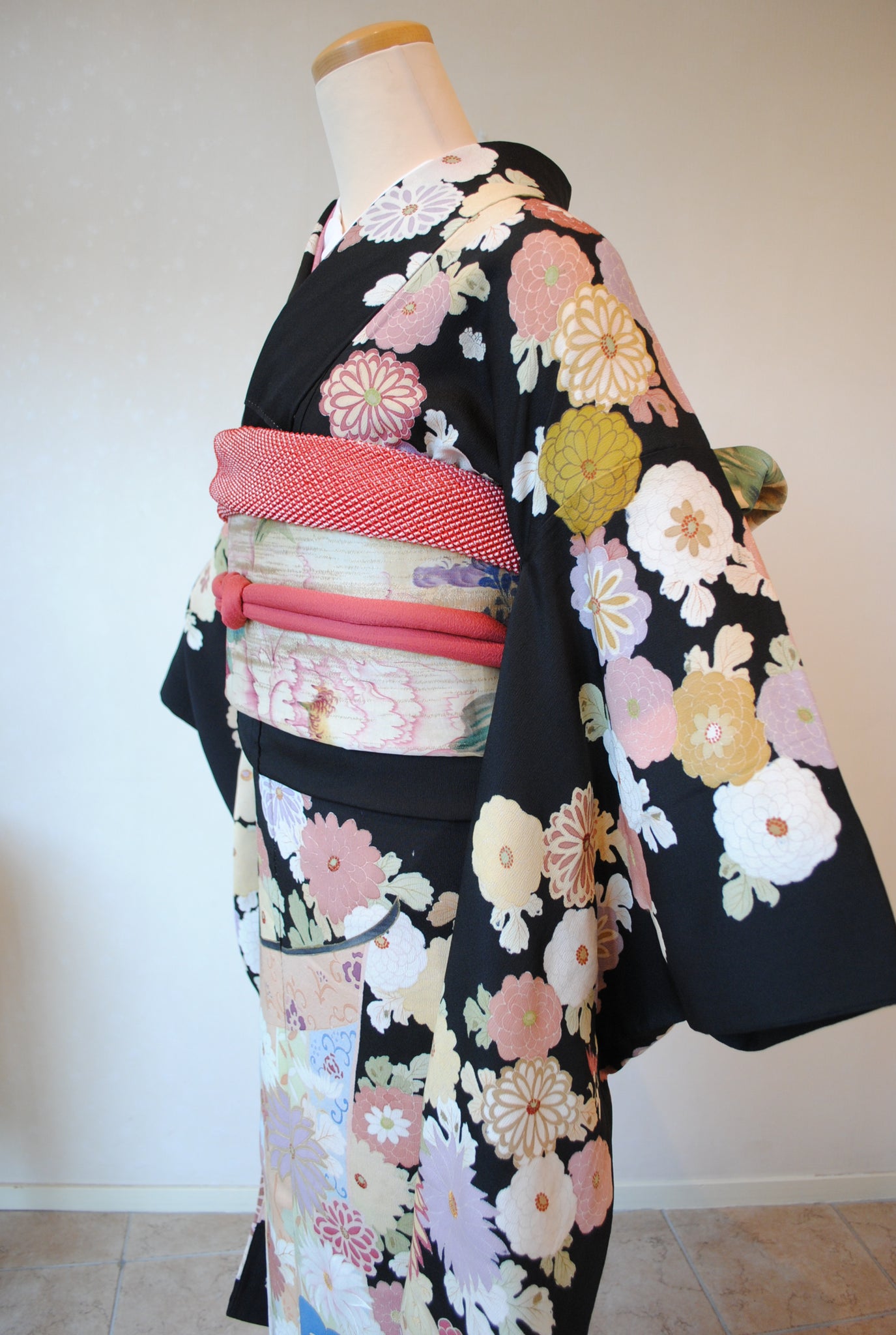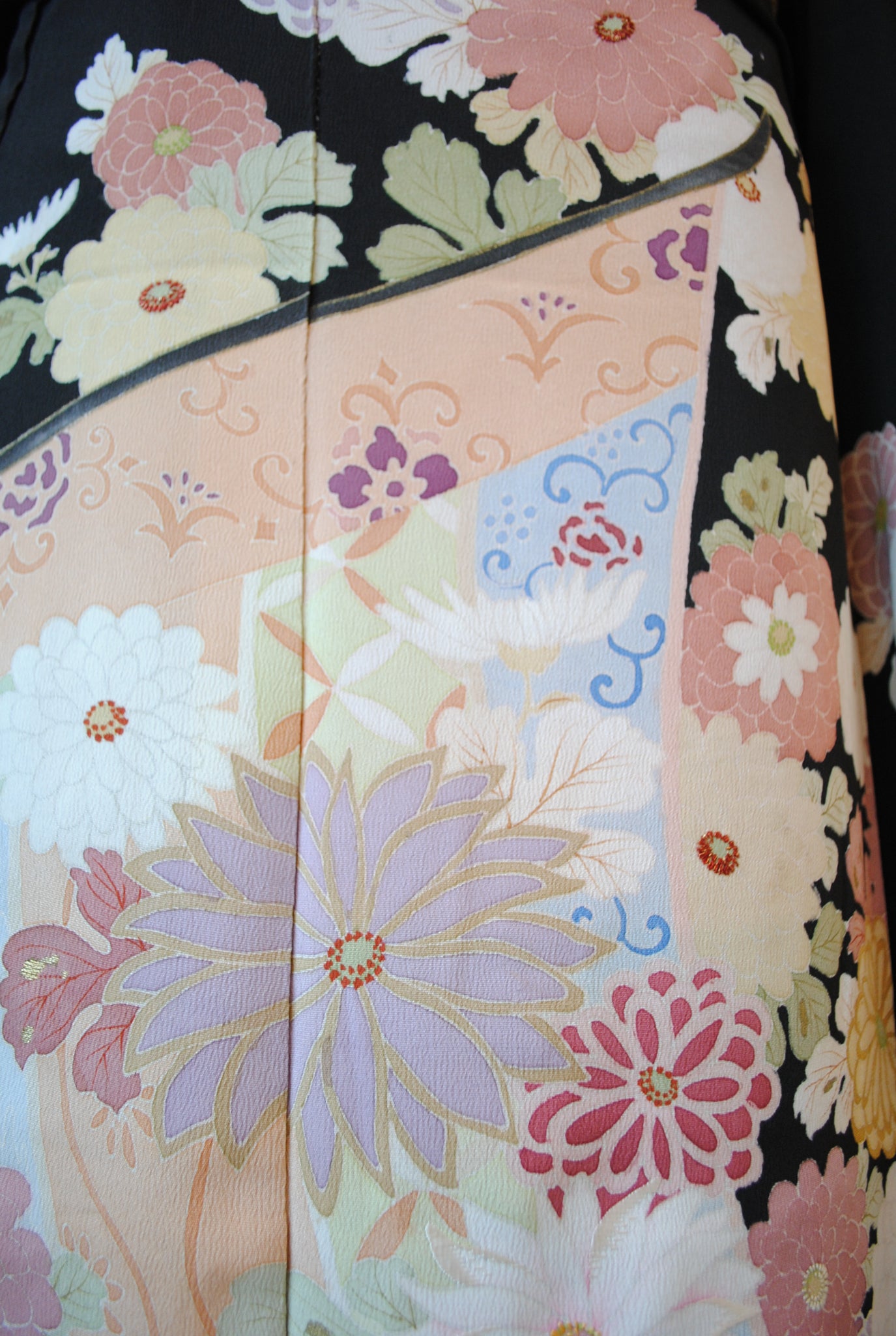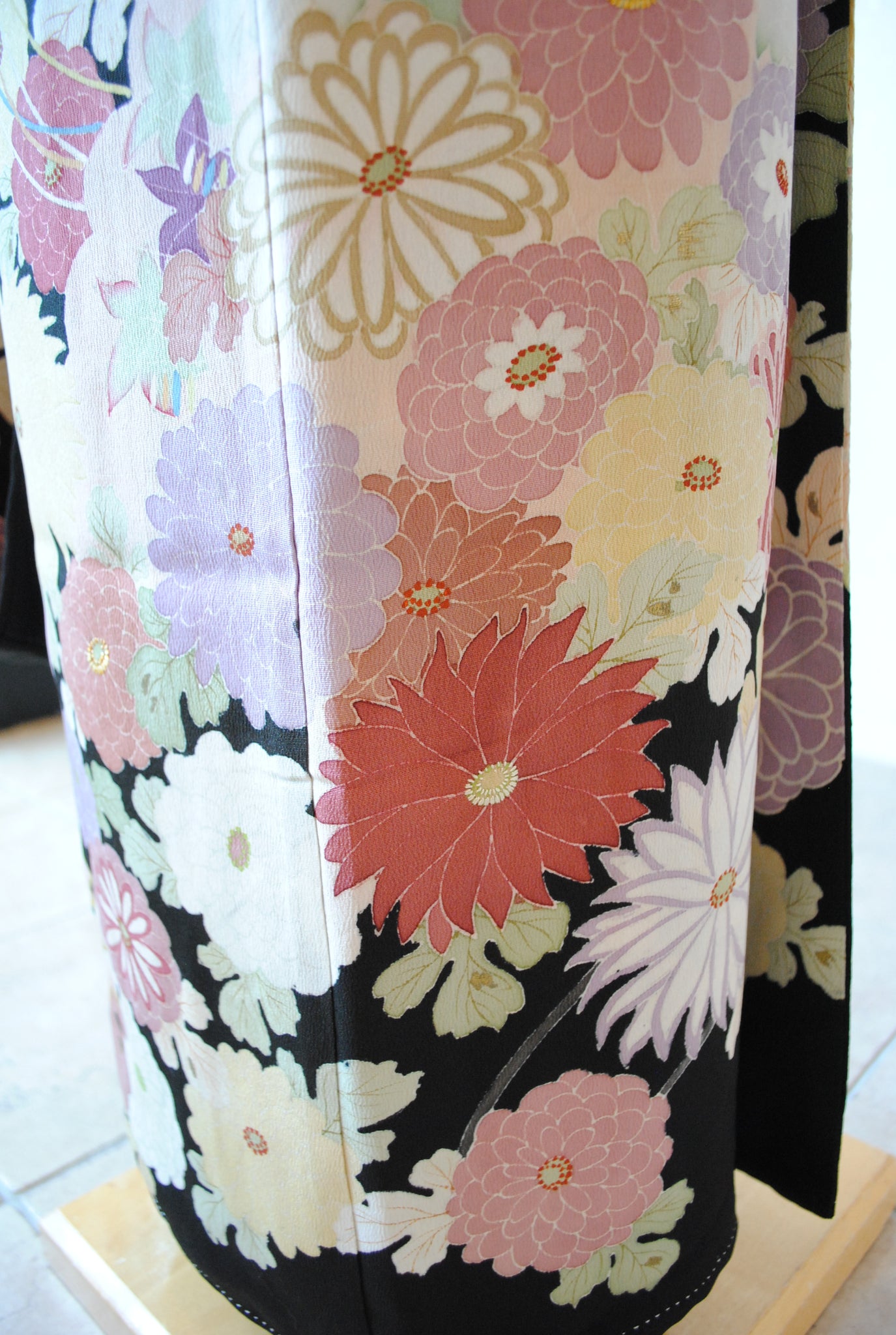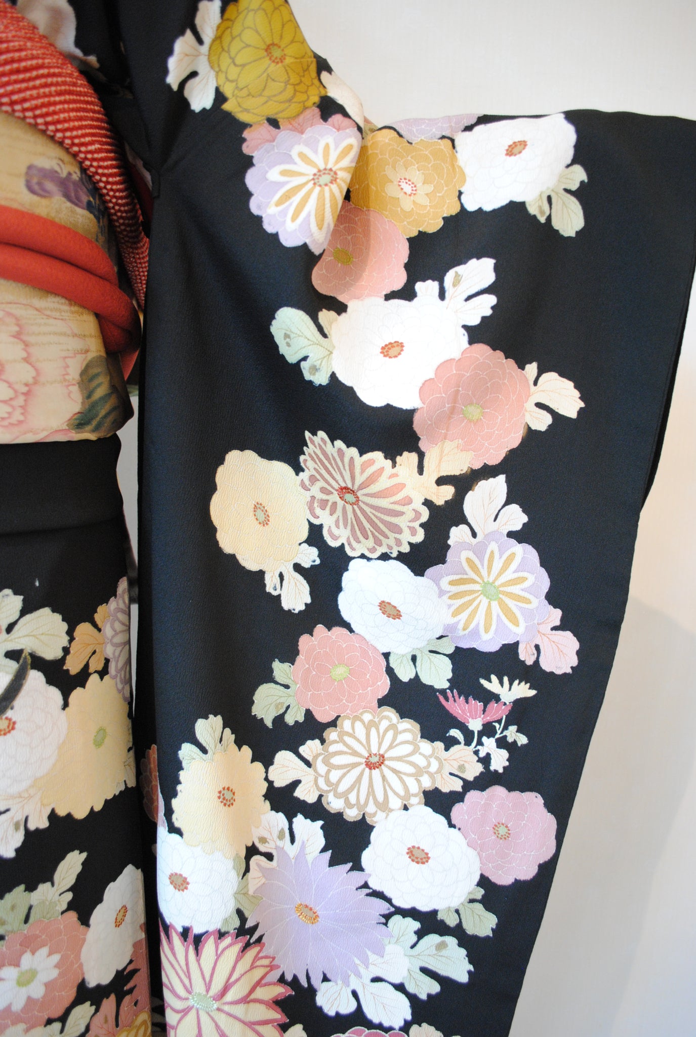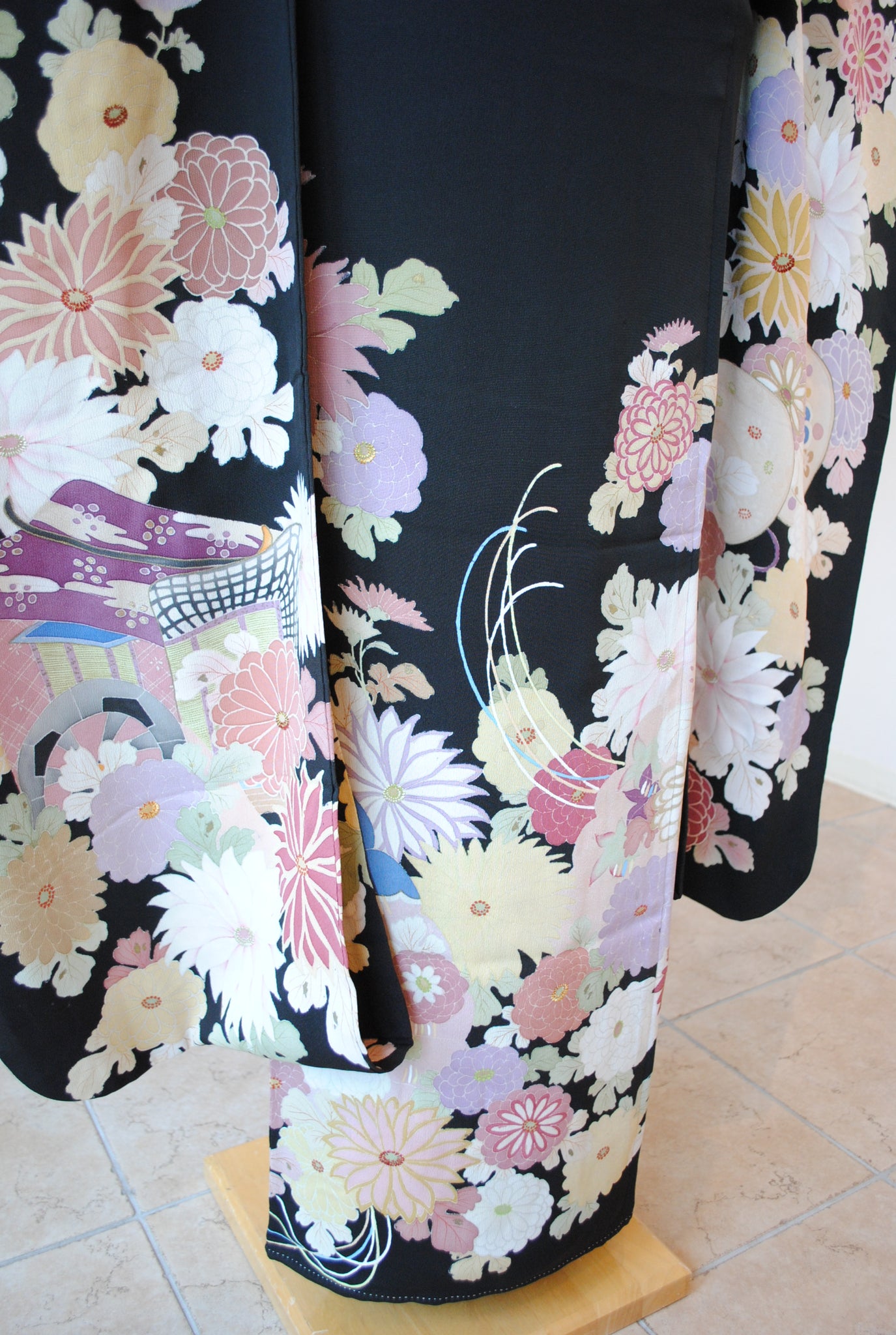 時を経た墨黒の上質な絹地に浮かび上がる菊の花。薄紫や桃色の花弁はくすみを帯びて、パステルほど明るくなく、深みをたたえた良い色になっています。