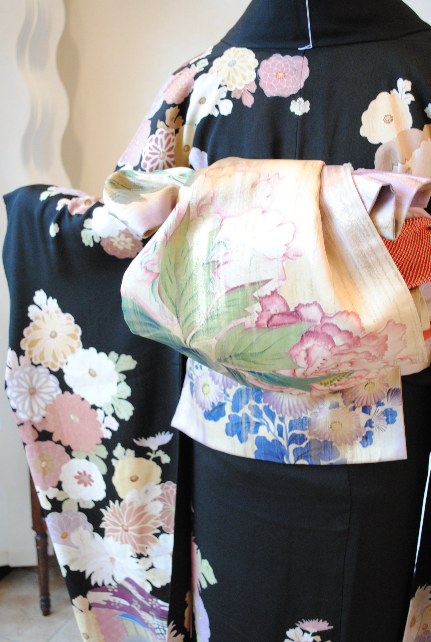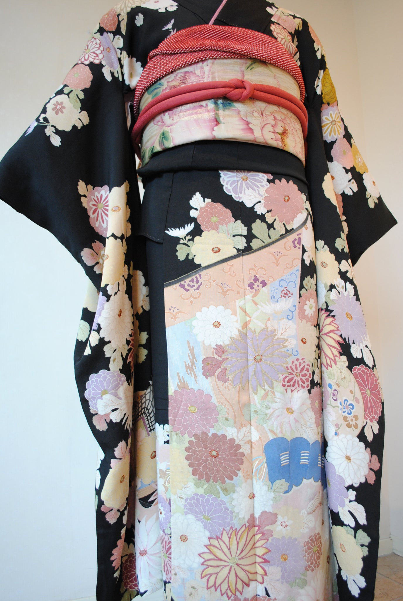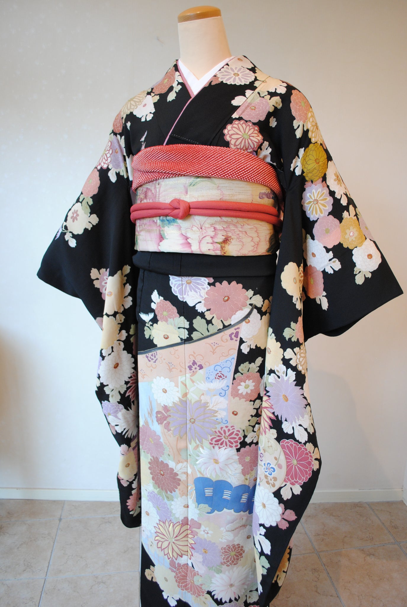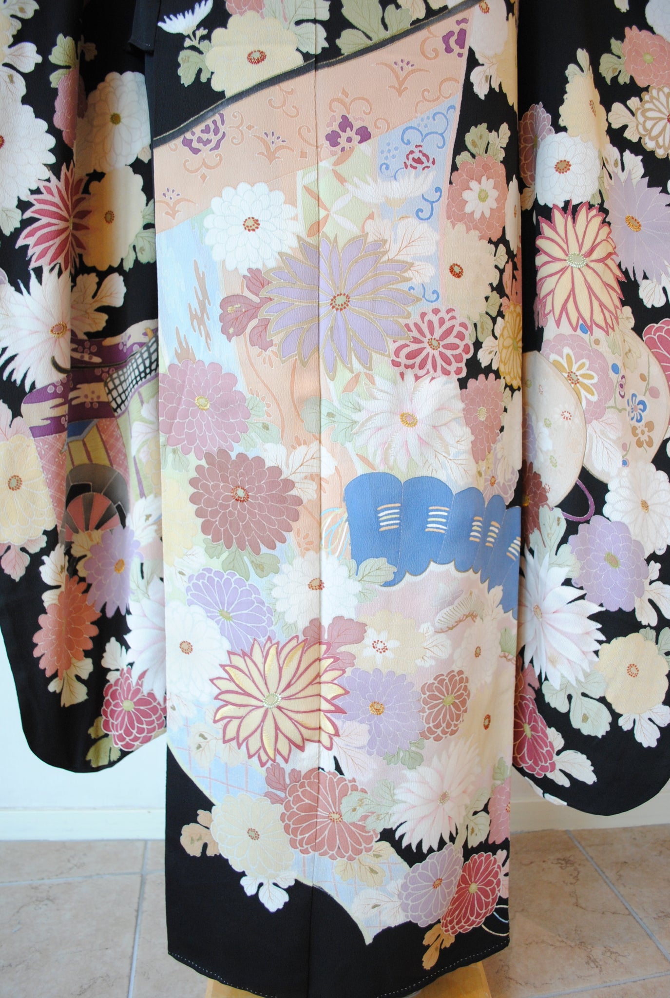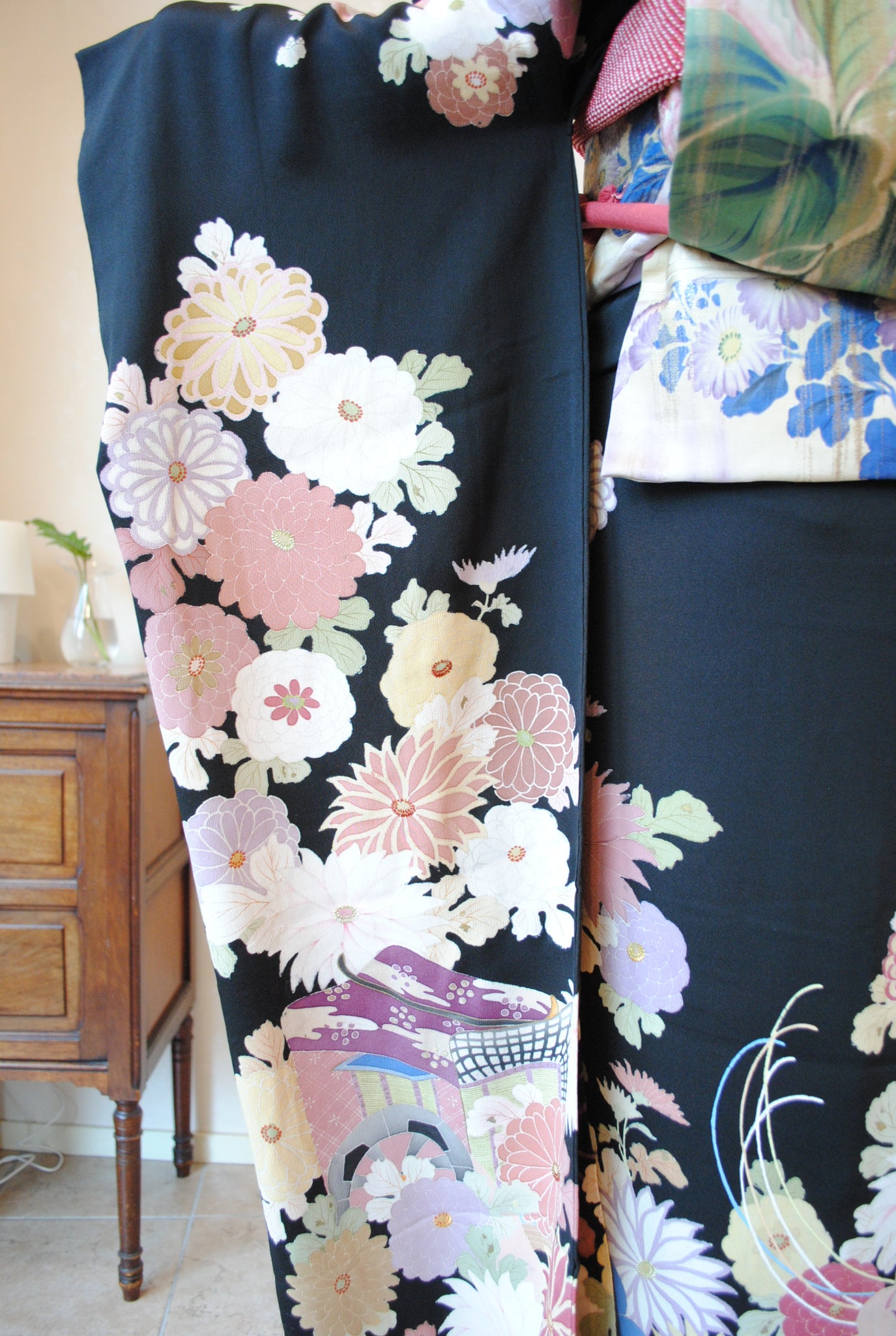 時を経た墨黒の上質な絹地に浮かび上がる菊の花。薄紫や桃色の花弁はくすみを帯びて、パステルほど明るくなく、深みをたたえた良い色になっています。