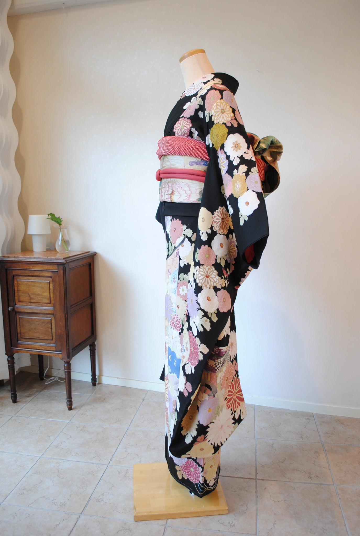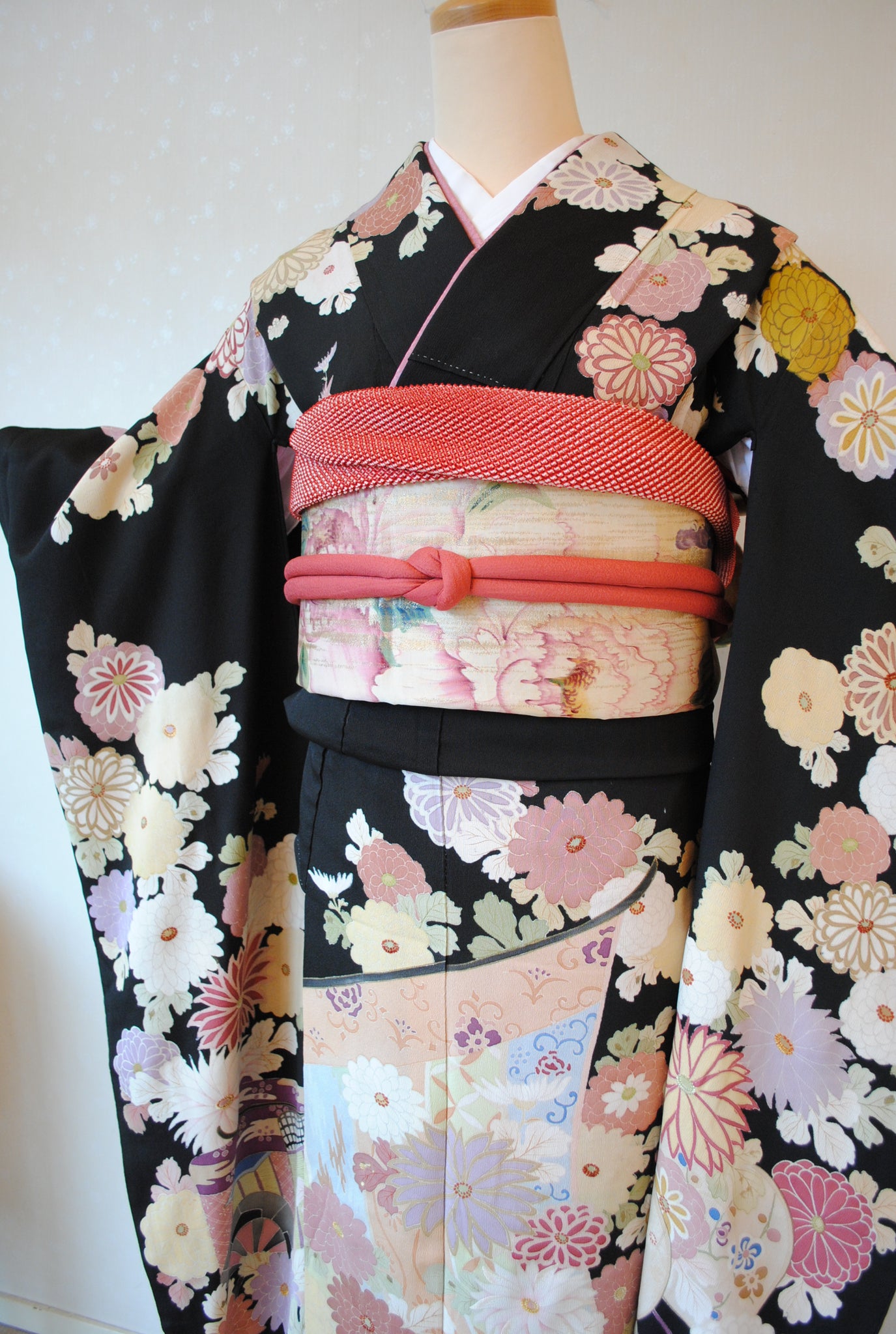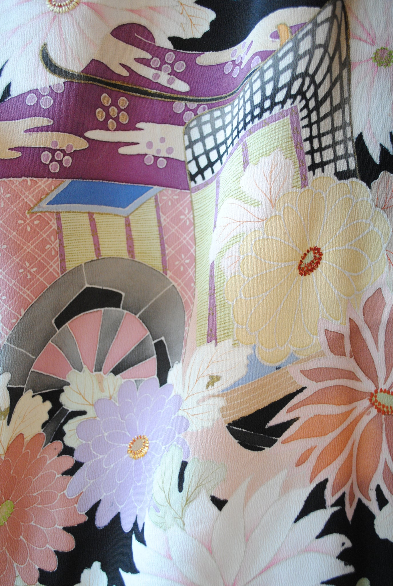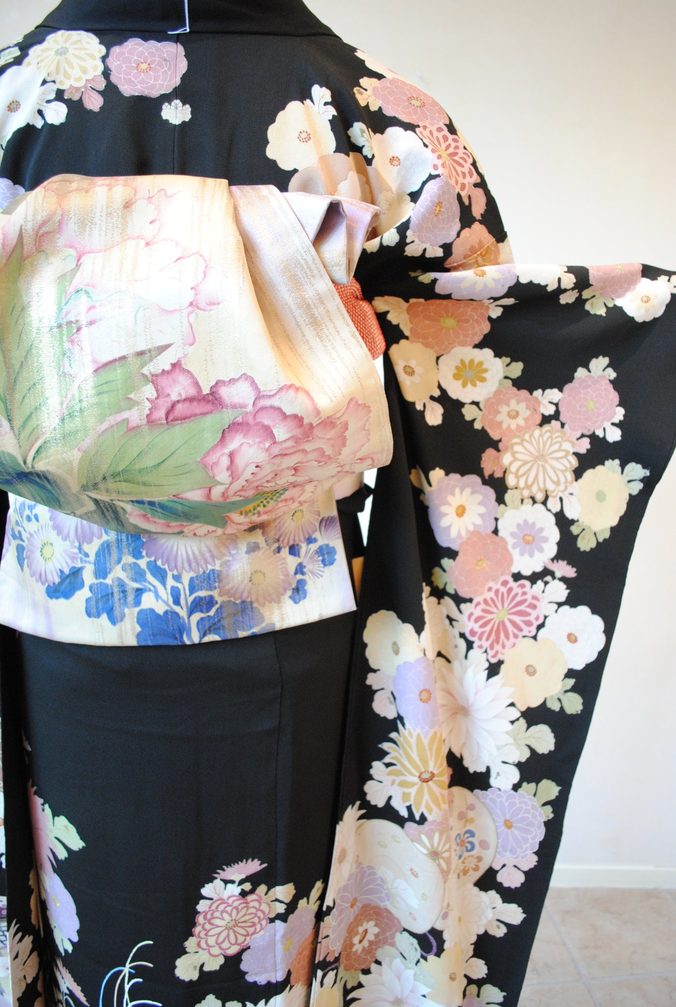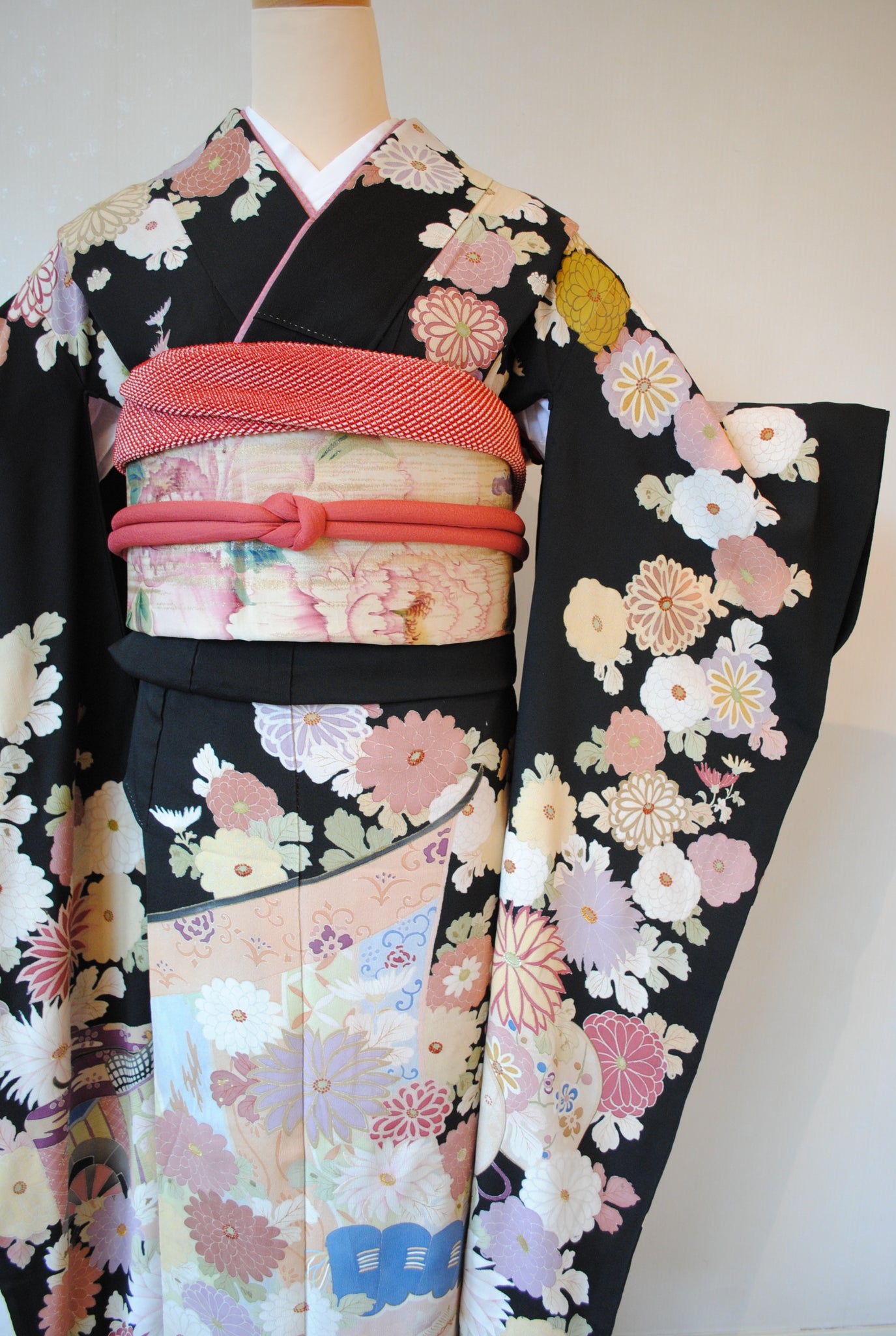 時を経た墨黒の上質な絹地に浮かび上がる菊の花。薄紫や桃色の花弁はくすみを帯びて、パステルほど明るくなく、深みをたたえた良い色になっています。