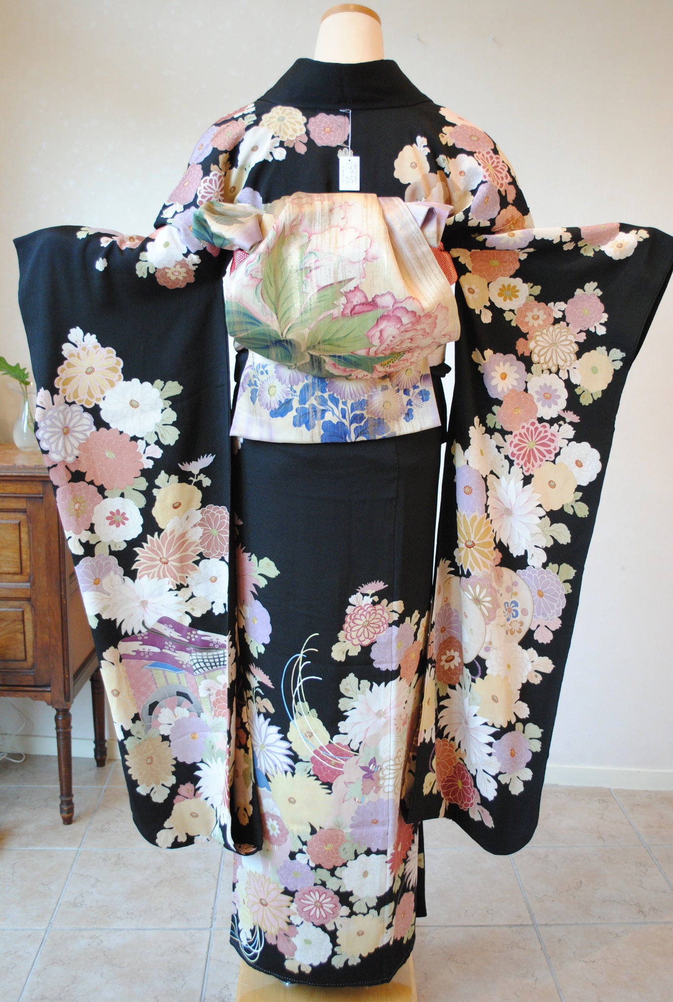 昭和初期のアンティーク黒振袖です。優美な几帳に菊花が咲き重なっています。
