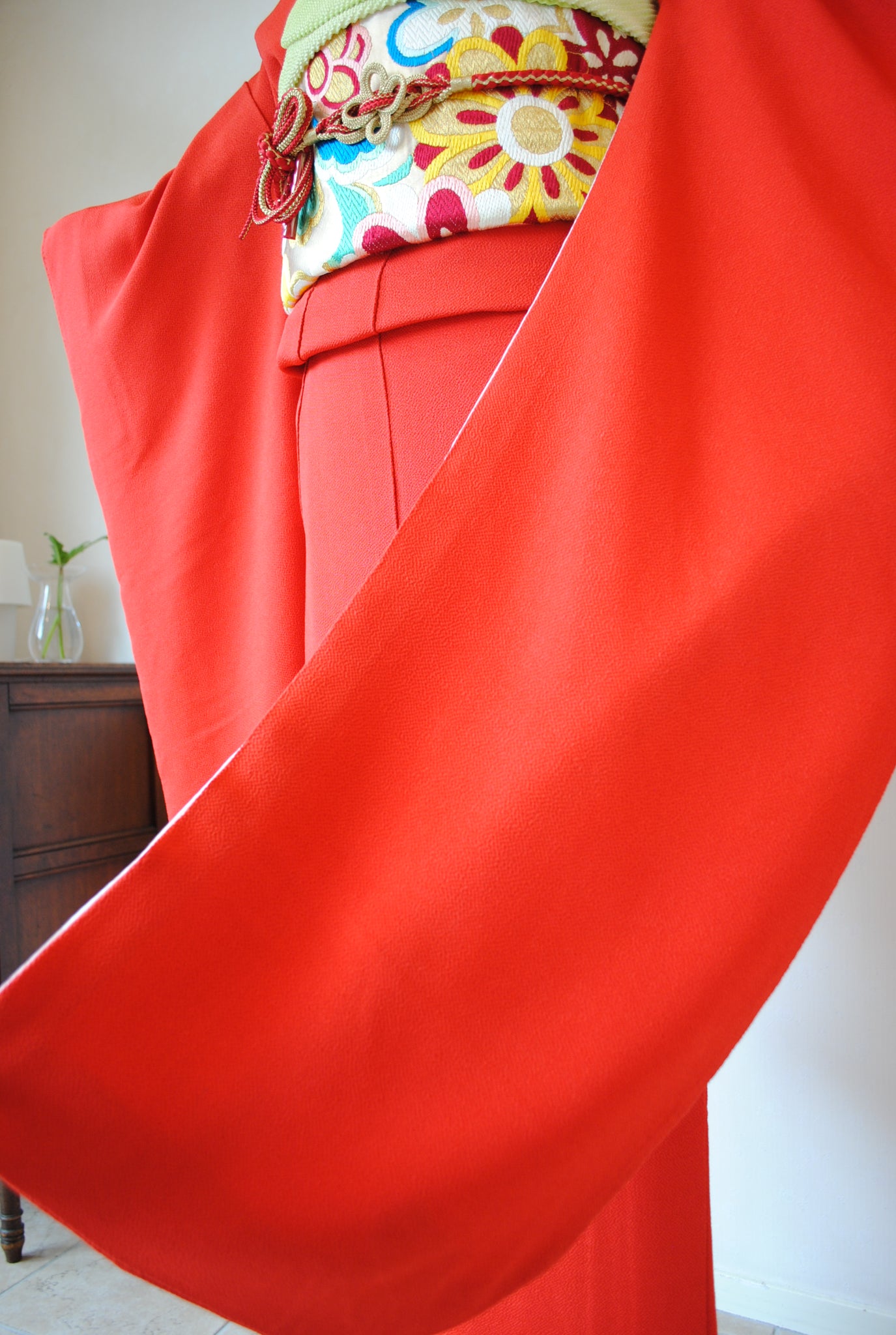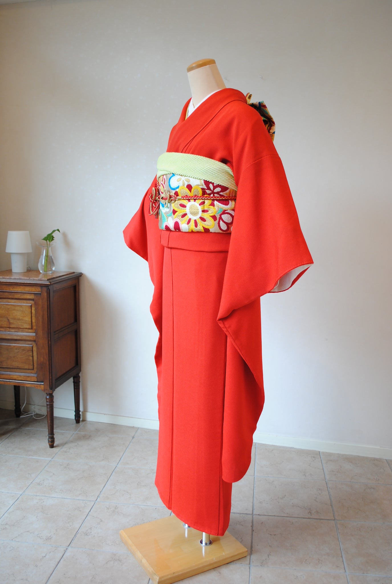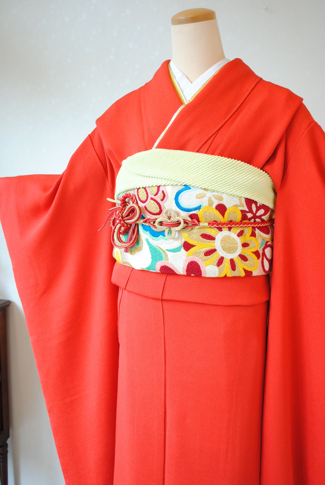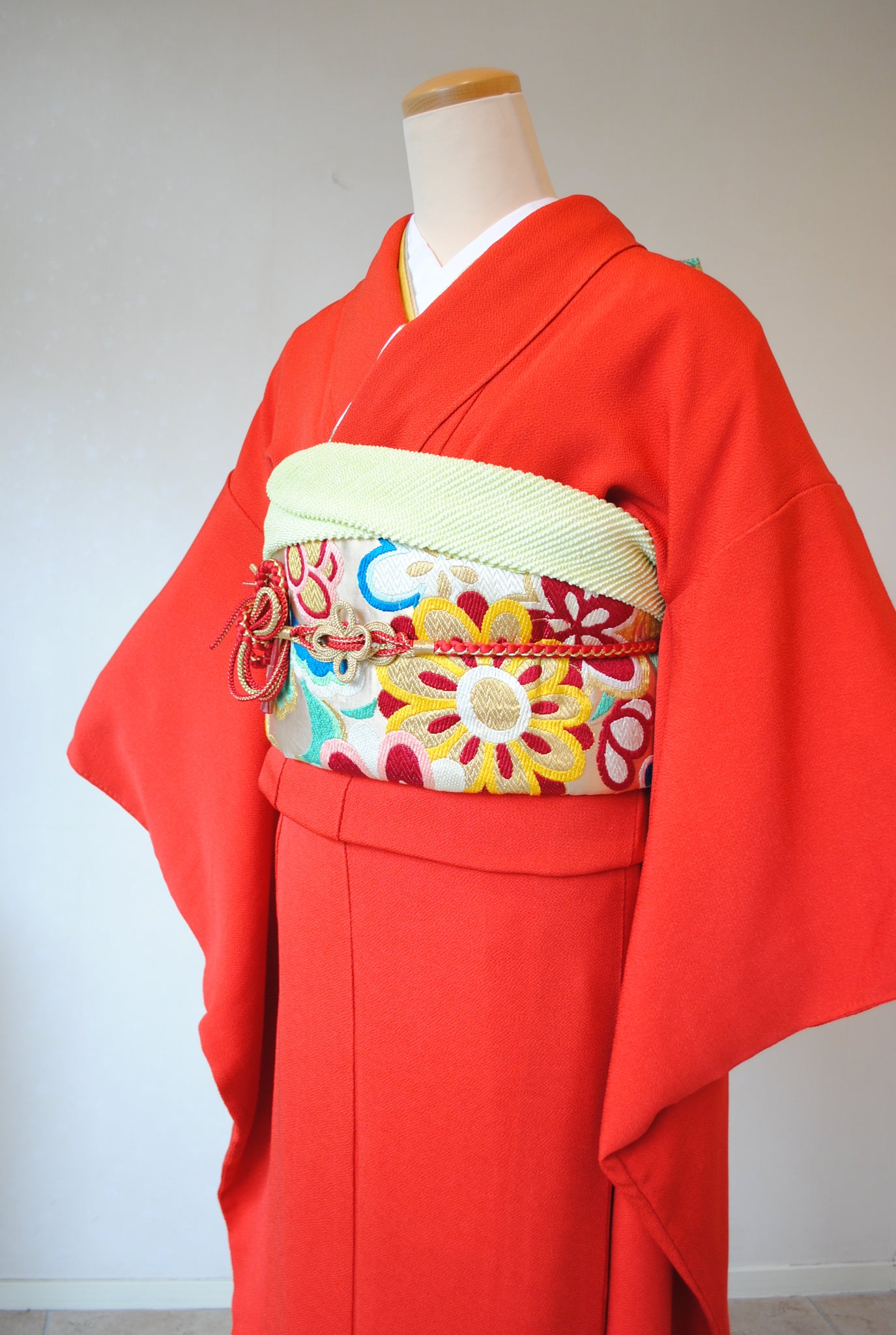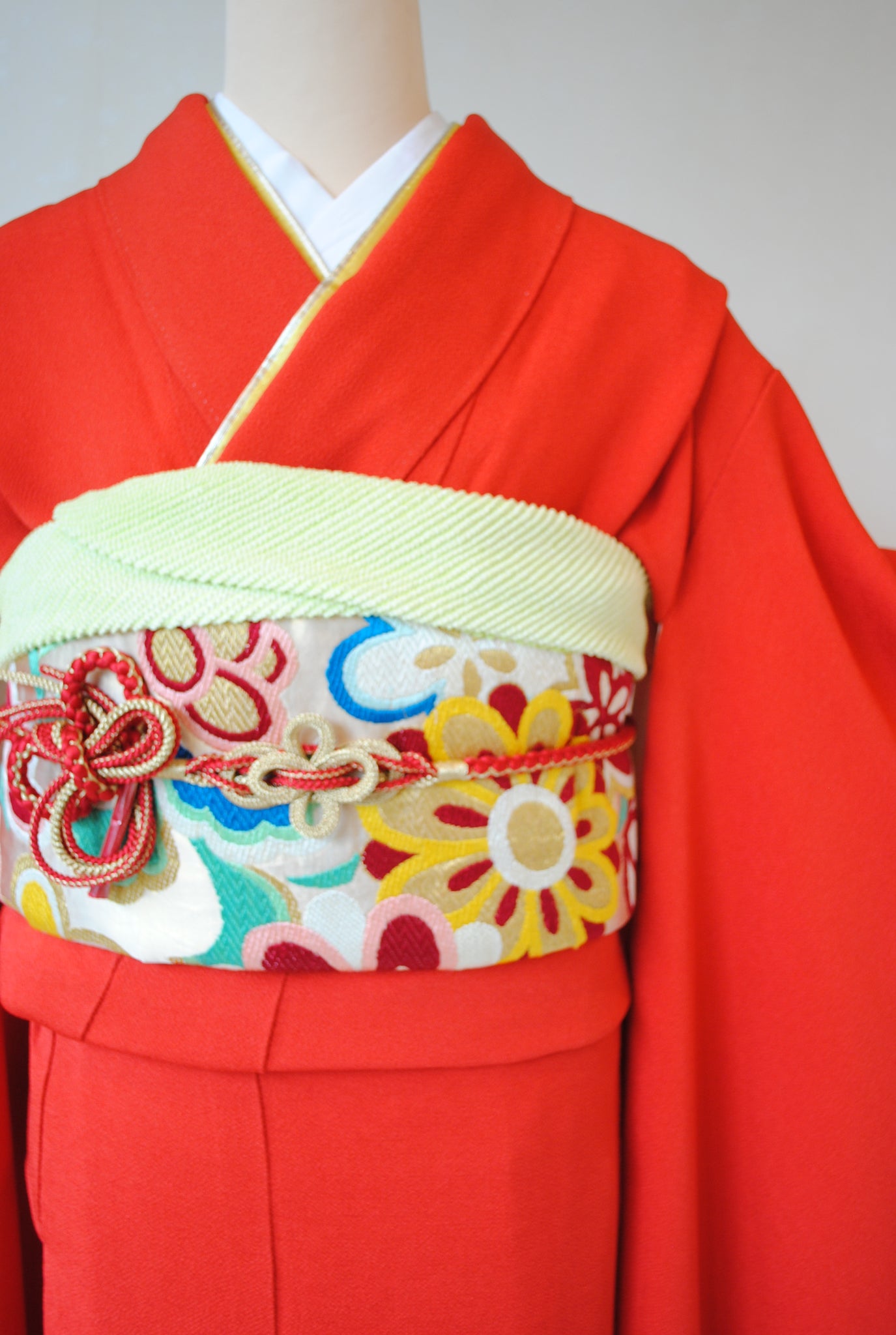 彩ある丸帯を合わせると可愛らしい印象に。金や黒のシンプルな帯を合わせるるとモダンな雰囲気に。