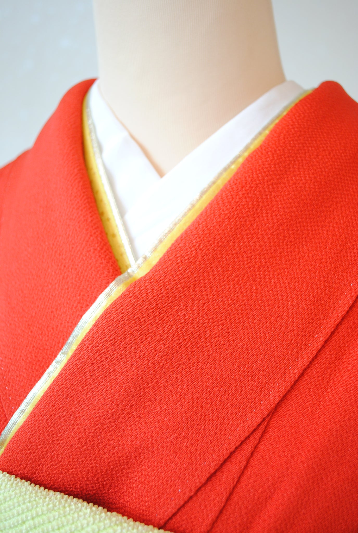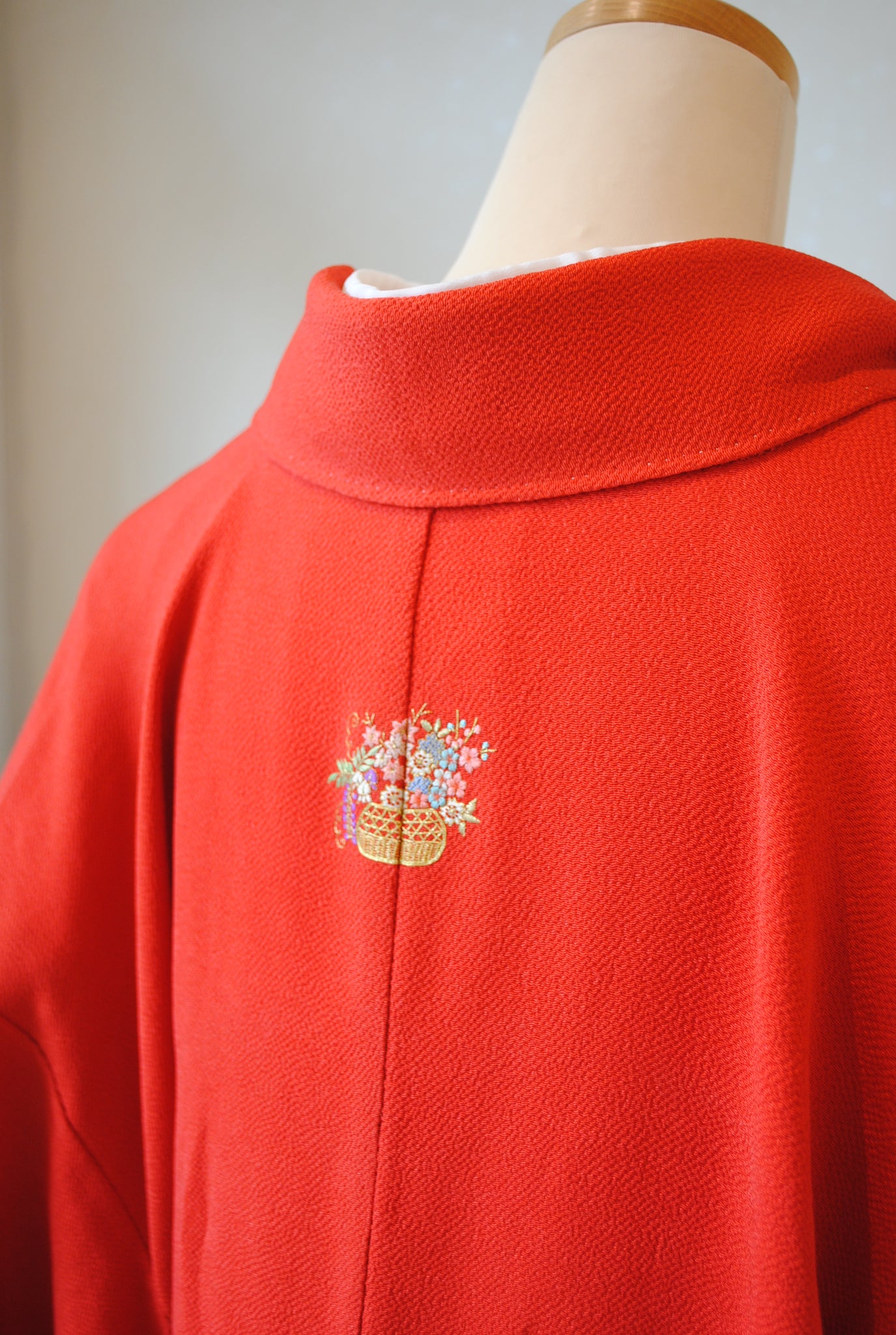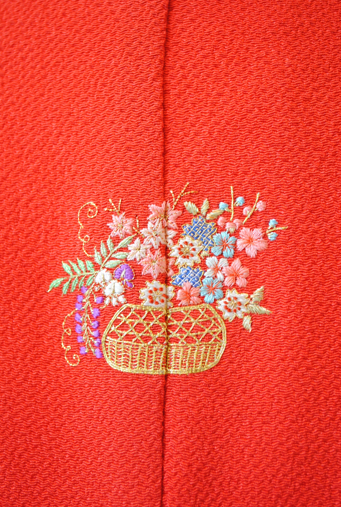 しぼのある上質な縮緬地で、背中心には花籠の飾り紋が刺繍で入っています。袴に合わせたときには特に背紋がポイントになり素敵にお召しいただけます。