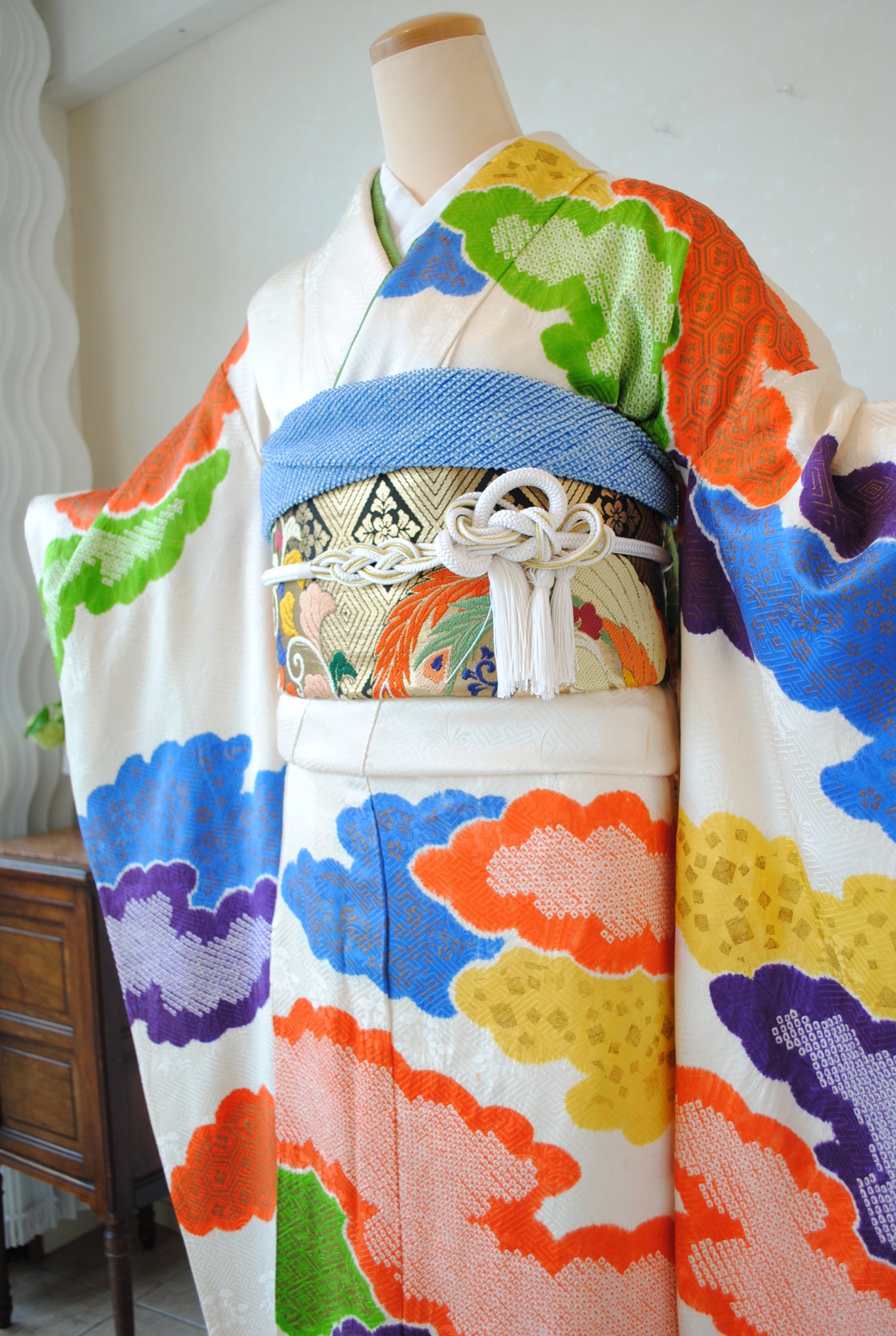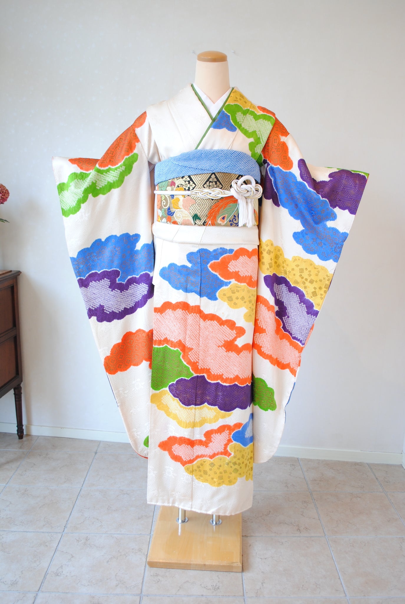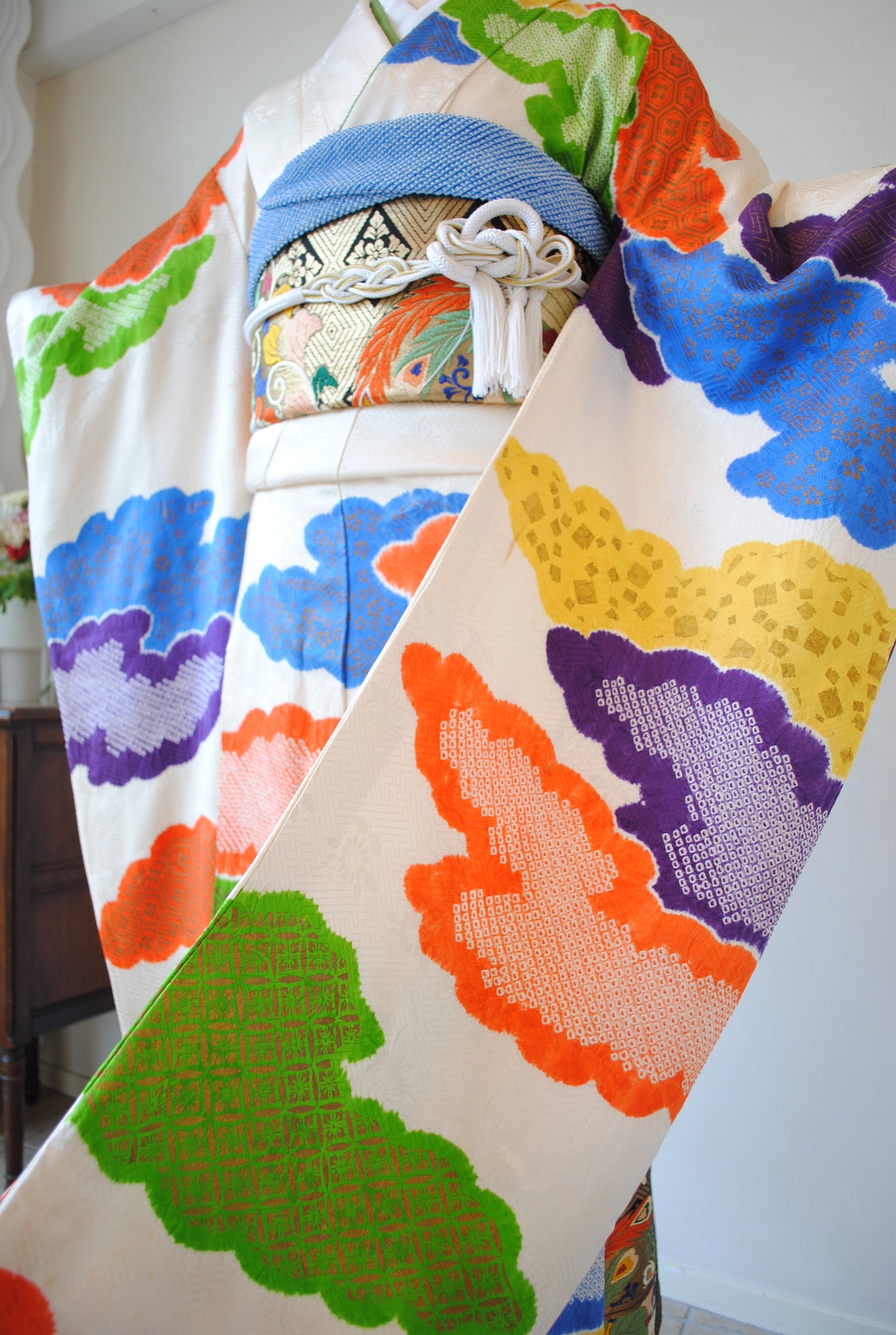 やわらかな白地に、絞りで表現された雲取り文様がリズミカルに広がる振袖です。