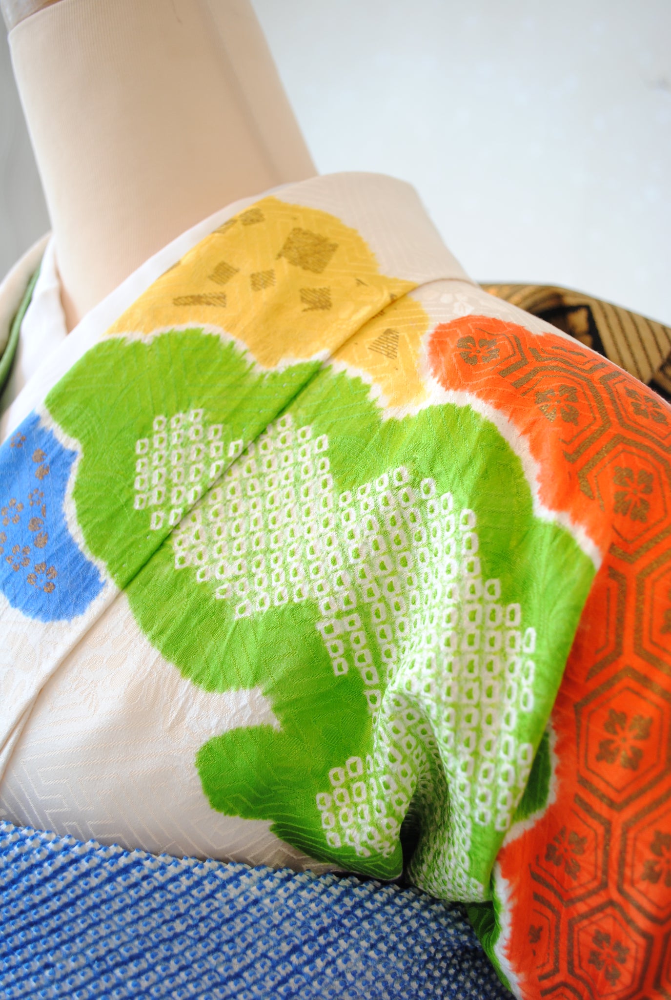 鮮やかな青や緑、橙など多彩な色使いでありながら、どこか落ち着きを感じさせるのはアンティークならではの魅力。