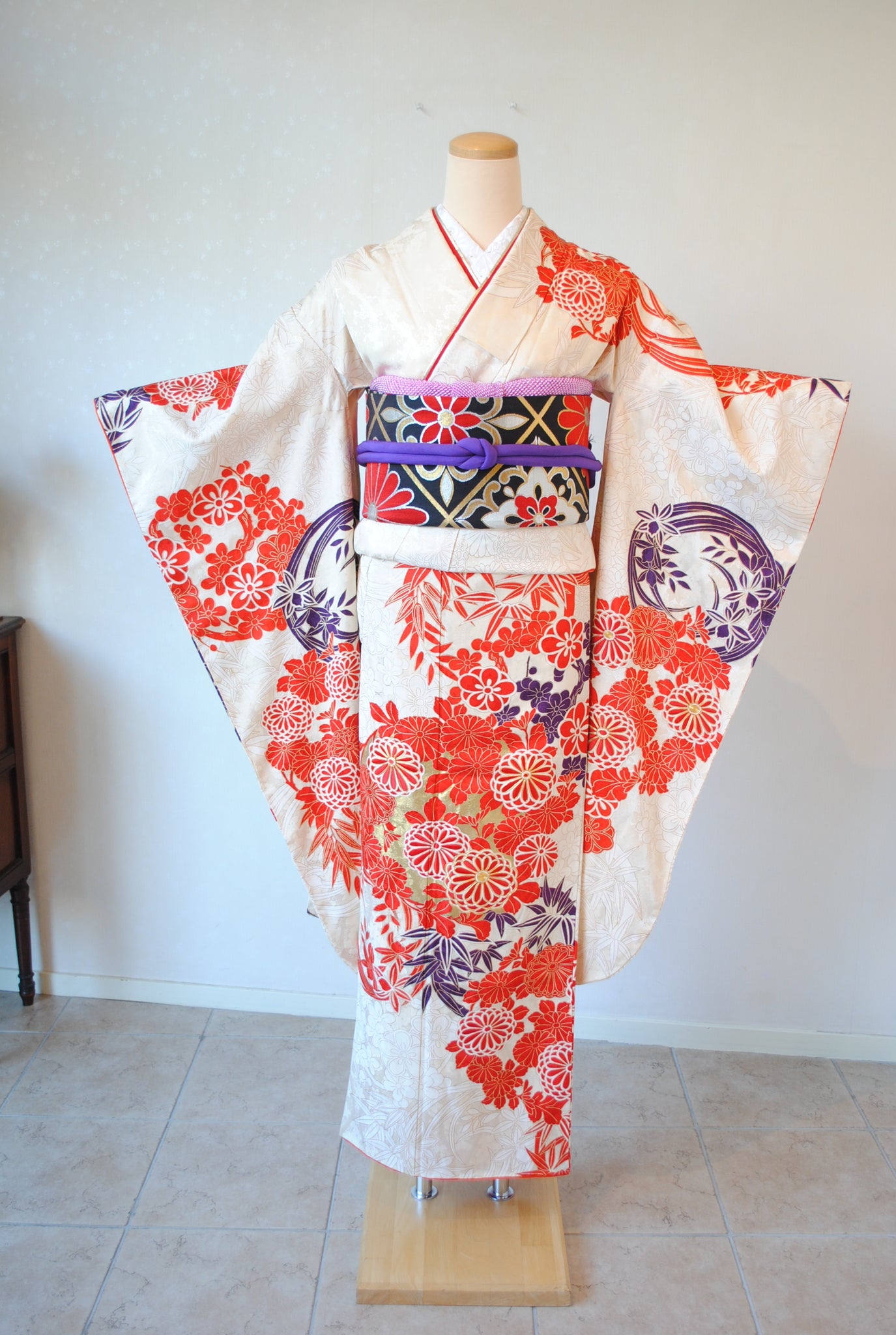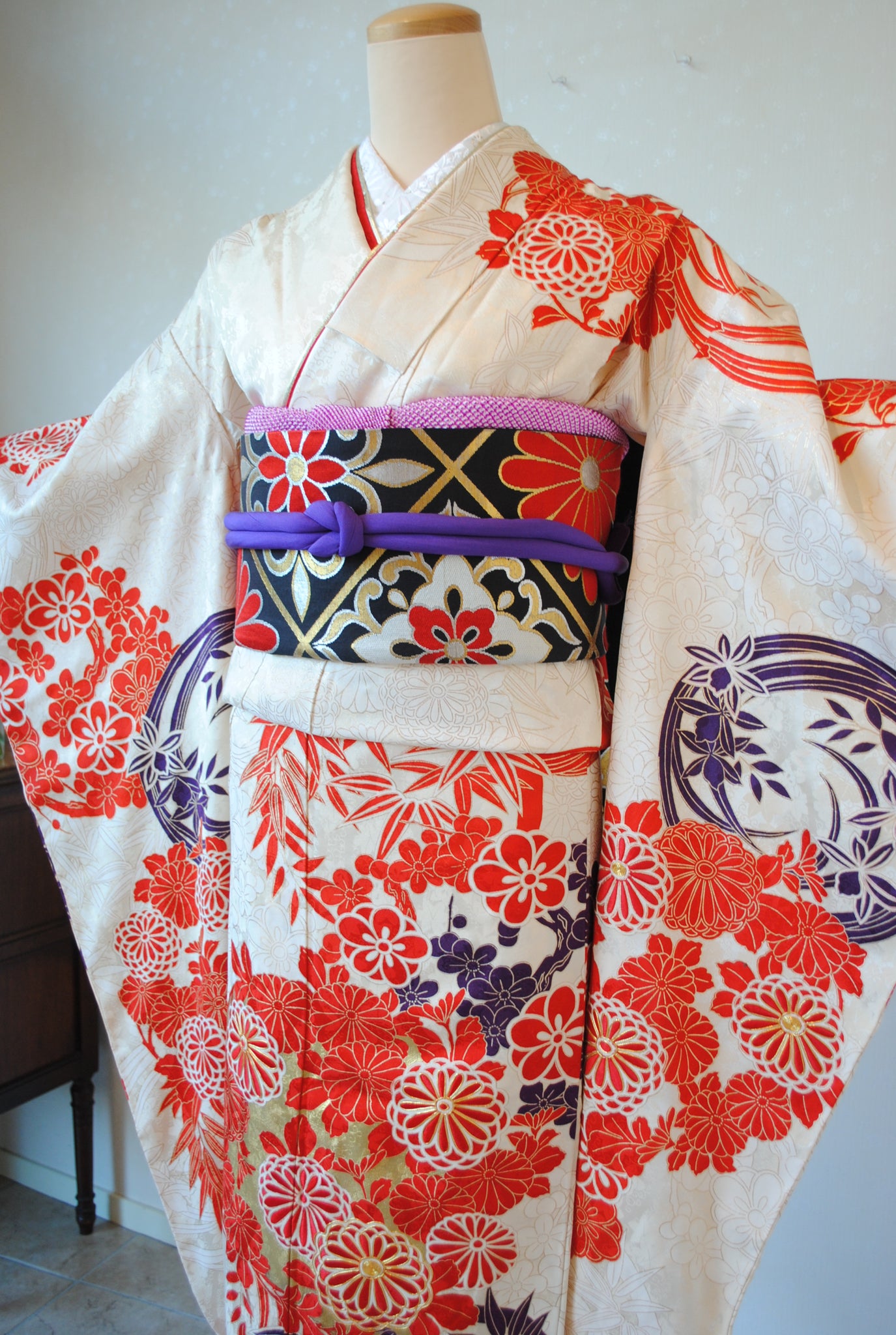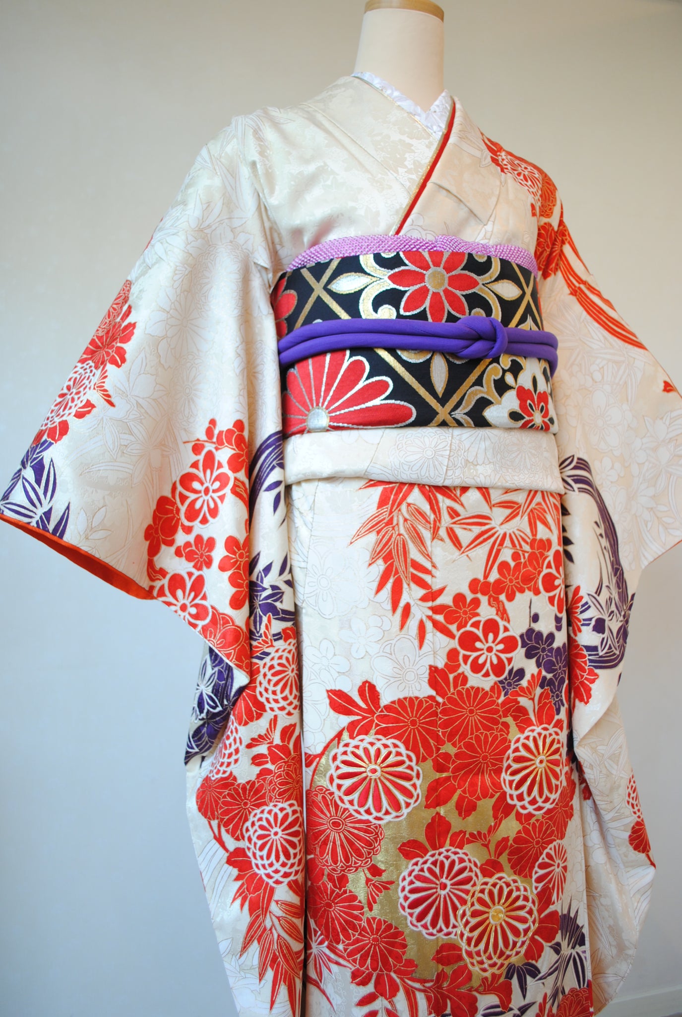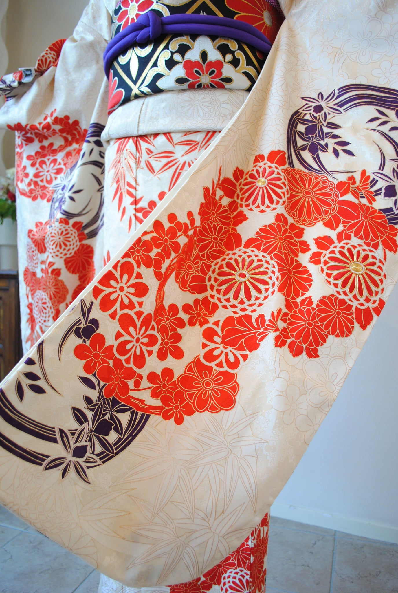 清楚な白地と、朱赤の四君子花丸文の対比が織りなす鮮やかな振袖姿。さりげなく入る濃い紫色と金箔がきりりと表情を引き締め、華やかな佇まいを演出します。