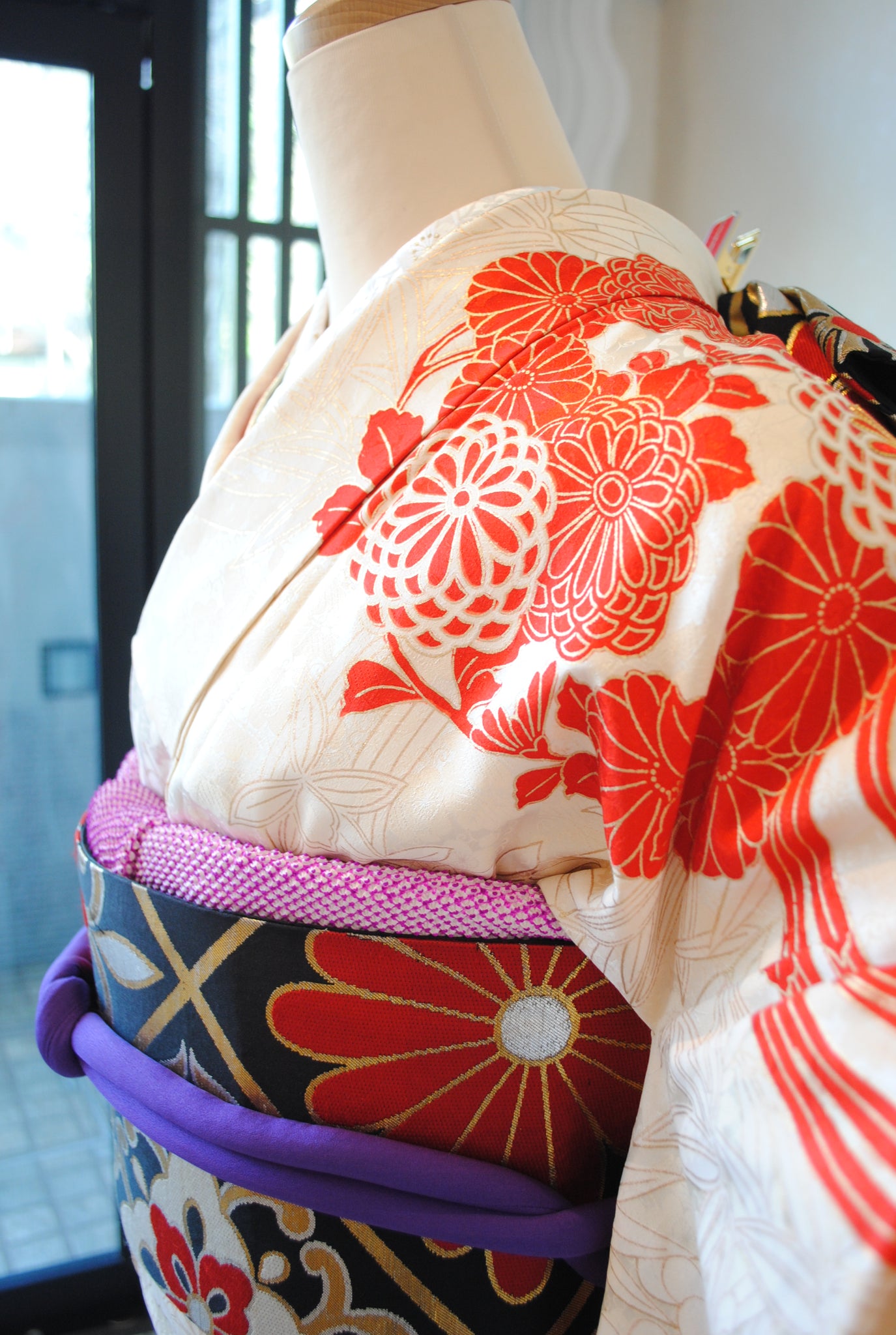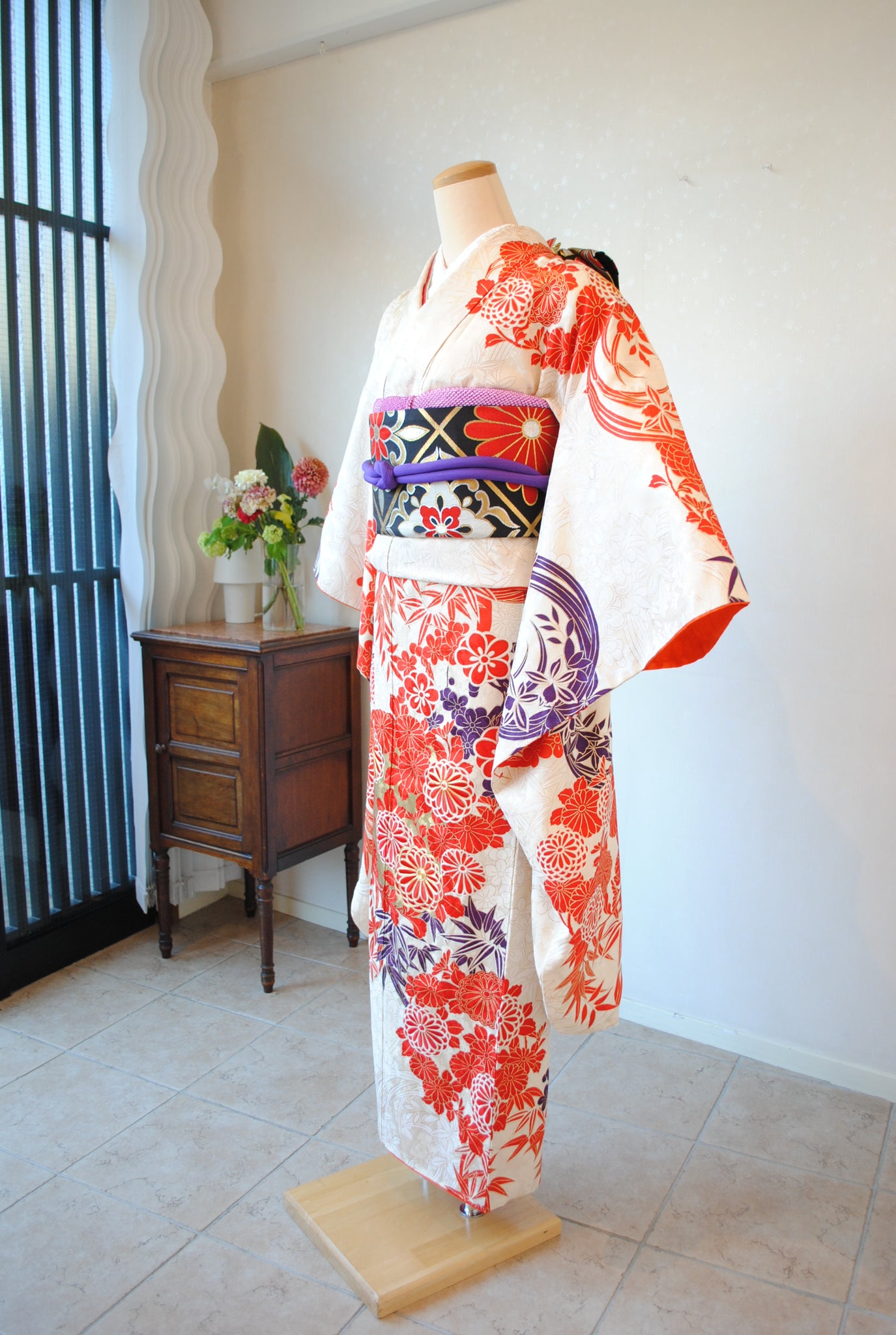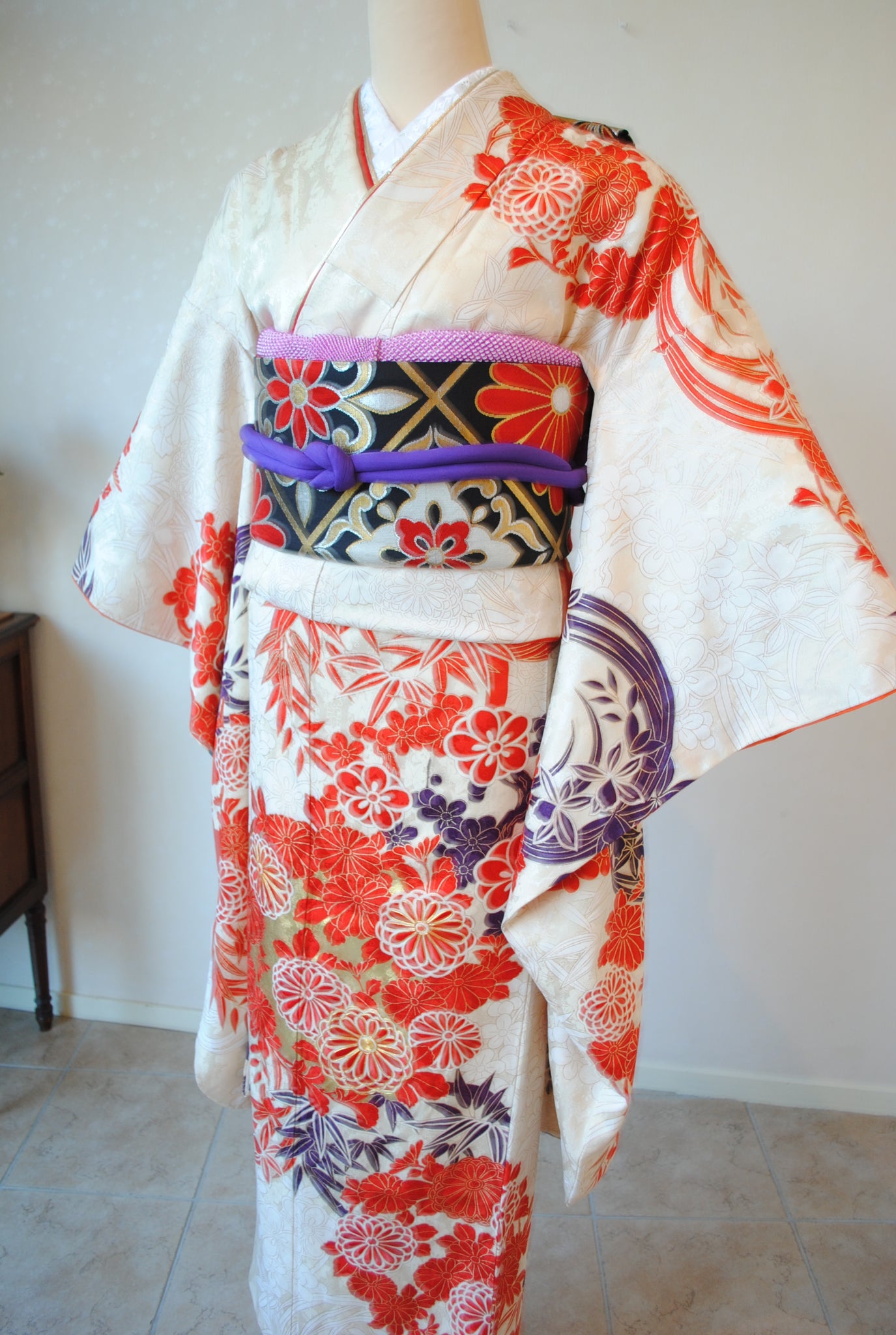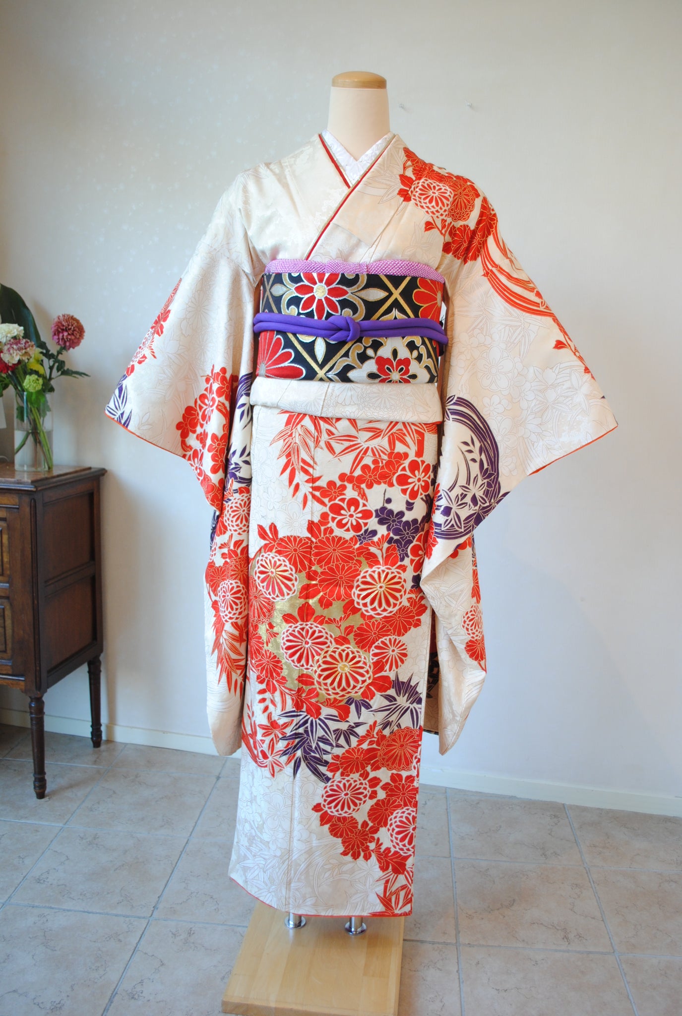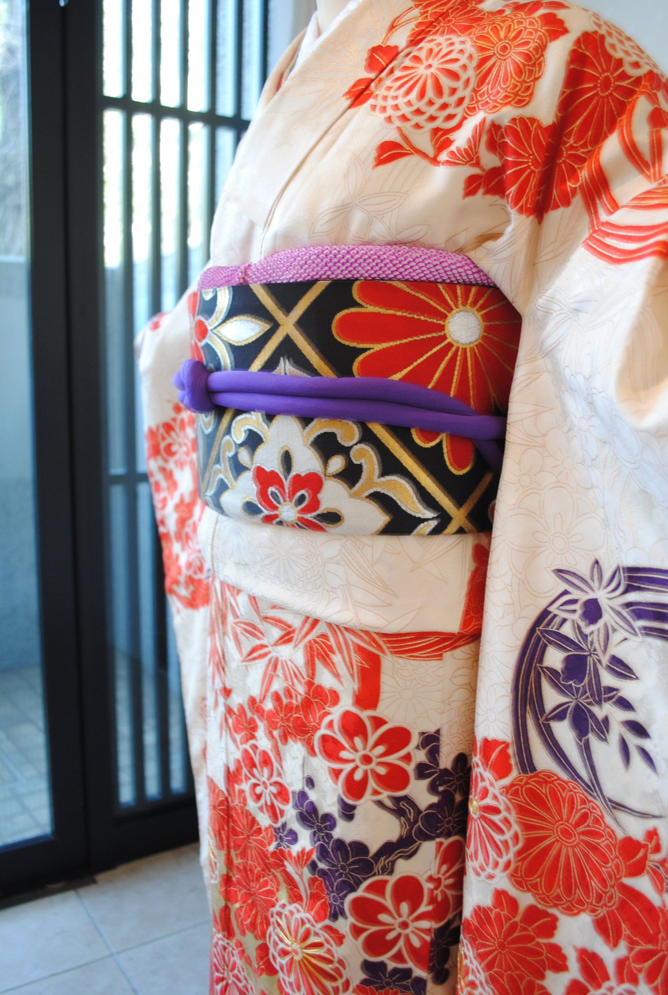 清楚な白地と、朱赤の四君子花丸文の対比が織りなす鮮やかな振袖姿。さりげなく入る濃い紫色と金箔がきりりと表情を引き締め、華やかな佇まいを演出します。