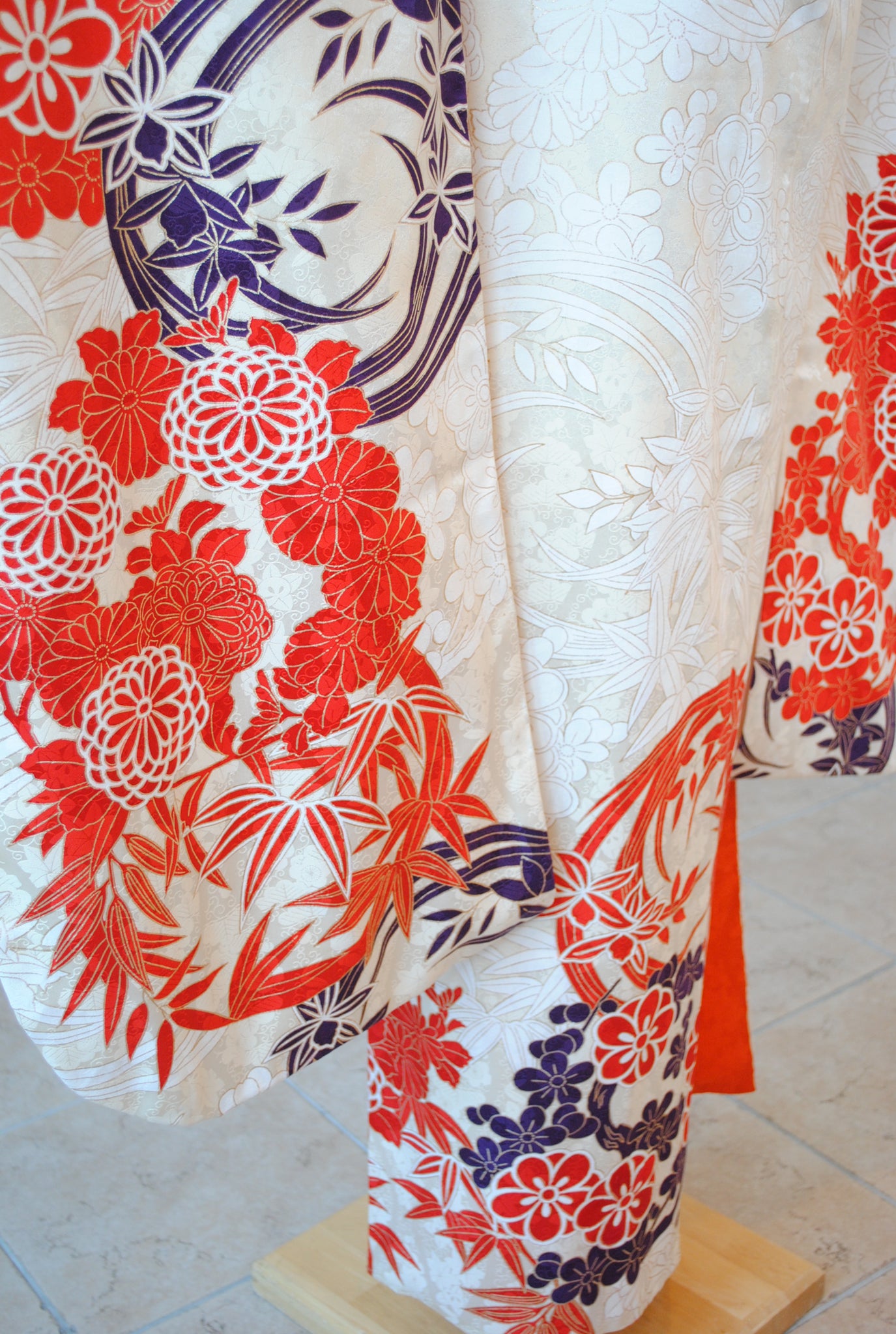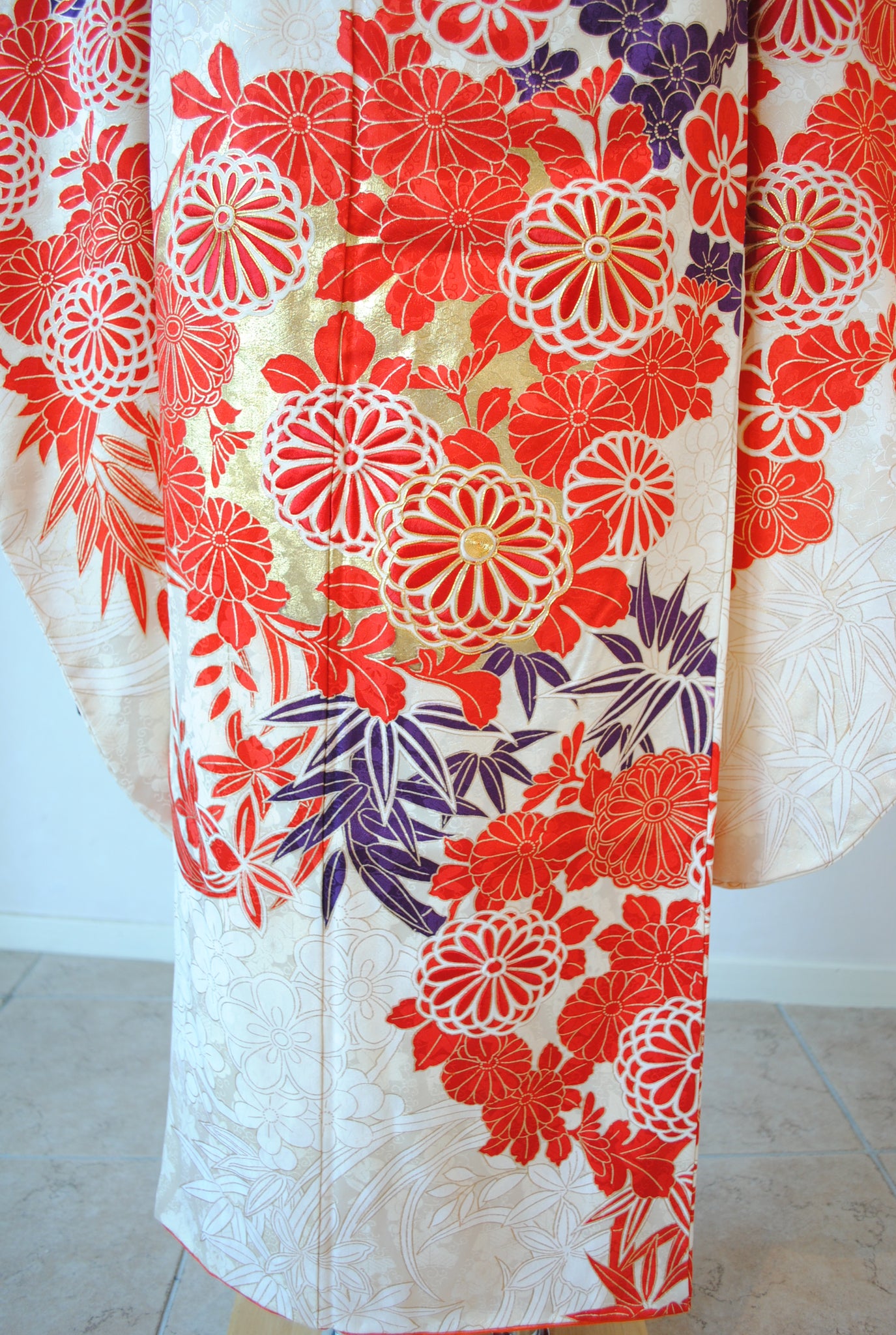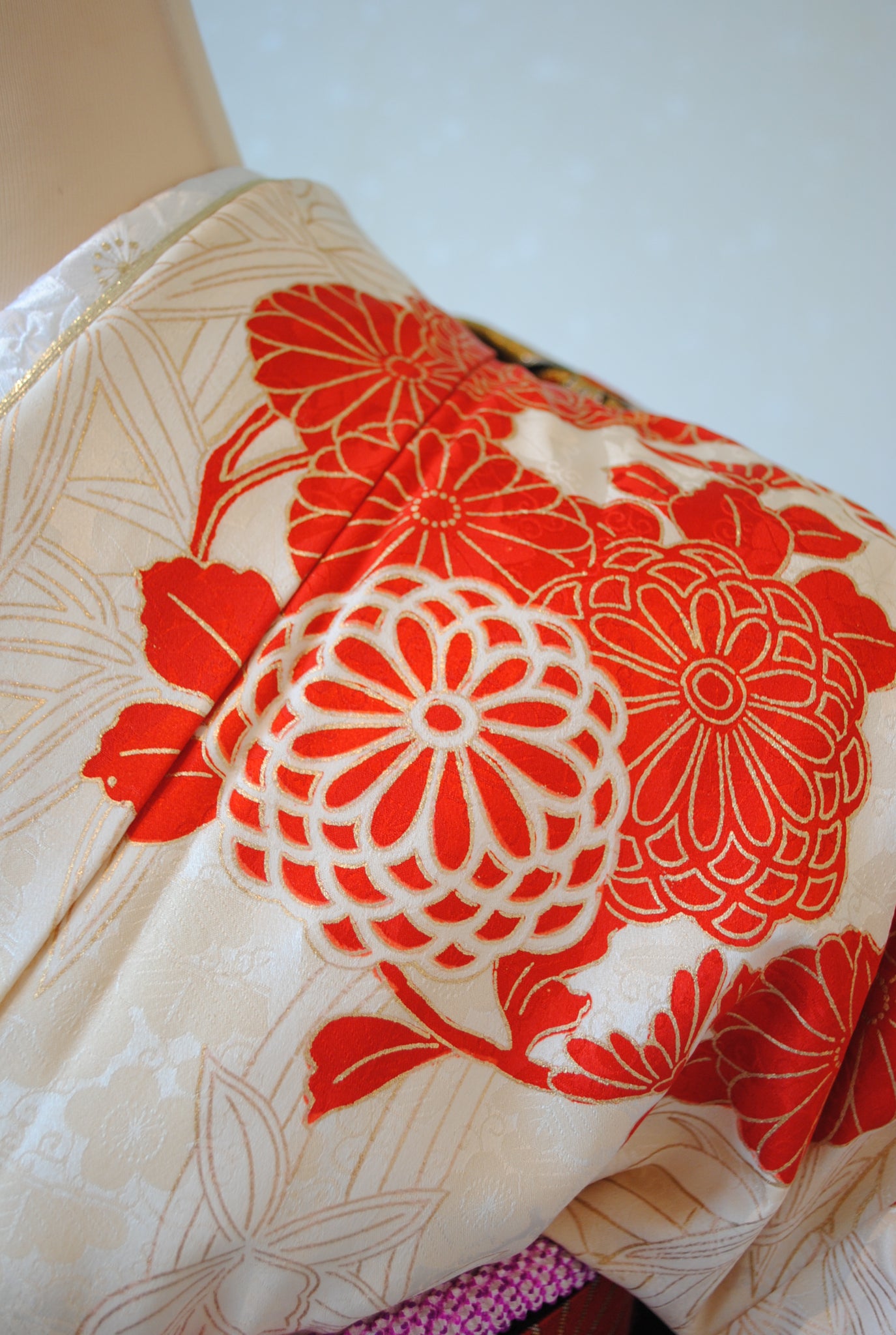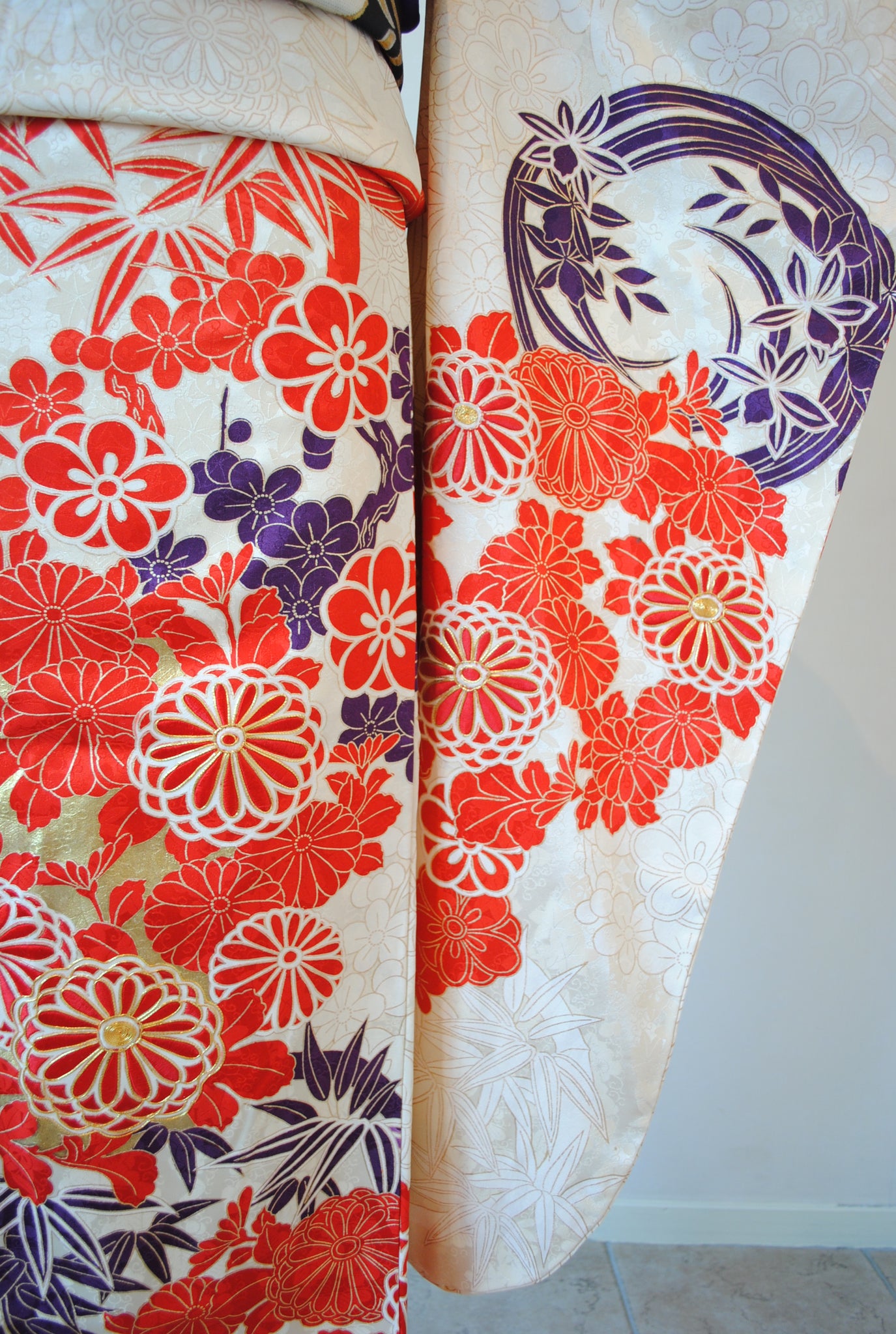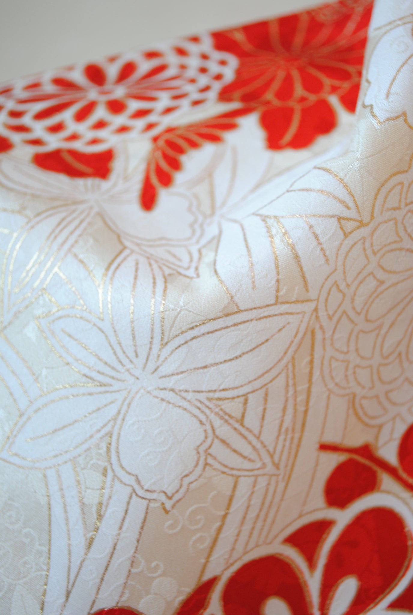 清らかな光沢をたたえた白綸子に、華やかな朱赤の花丸文が咲き誇る振袖です。