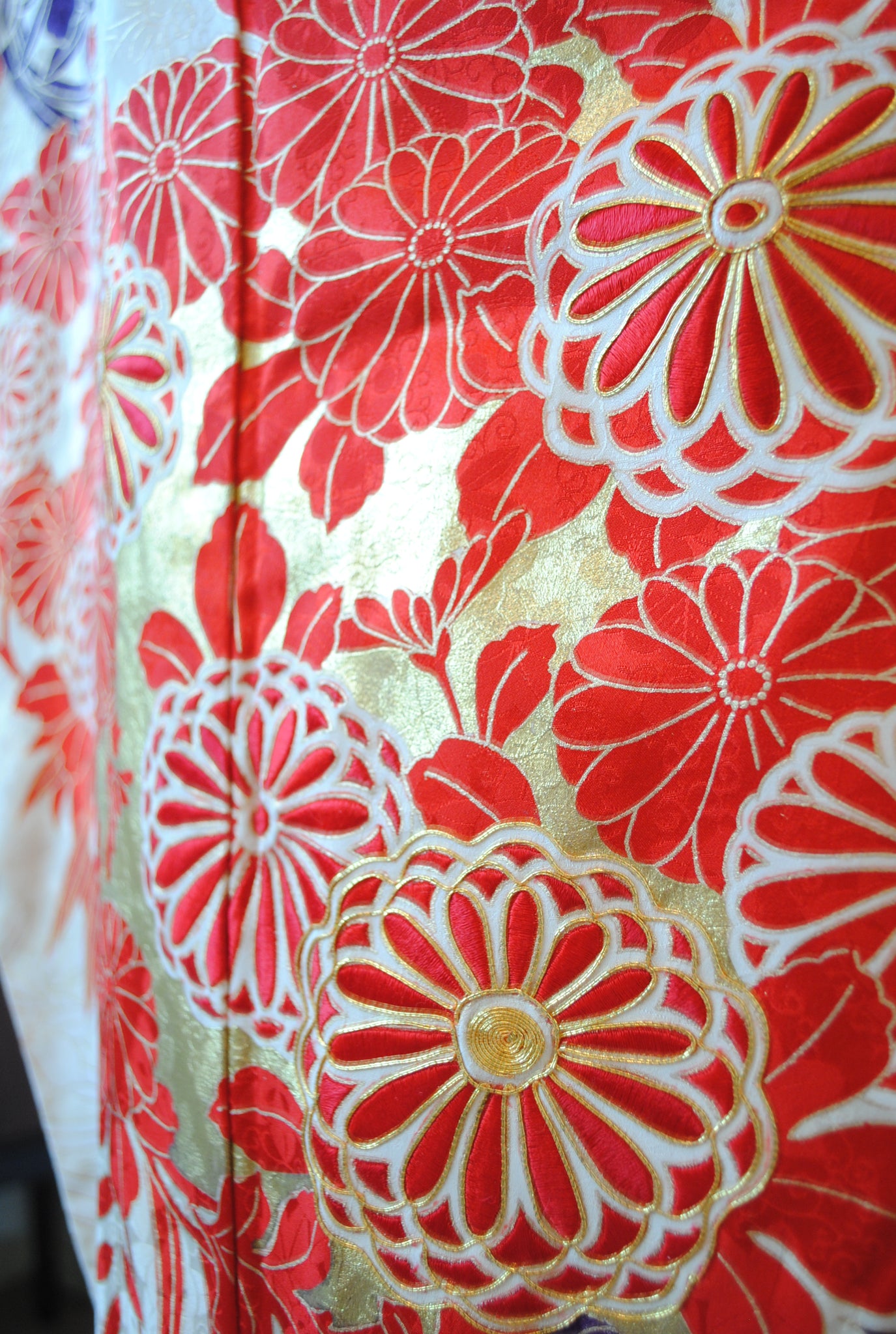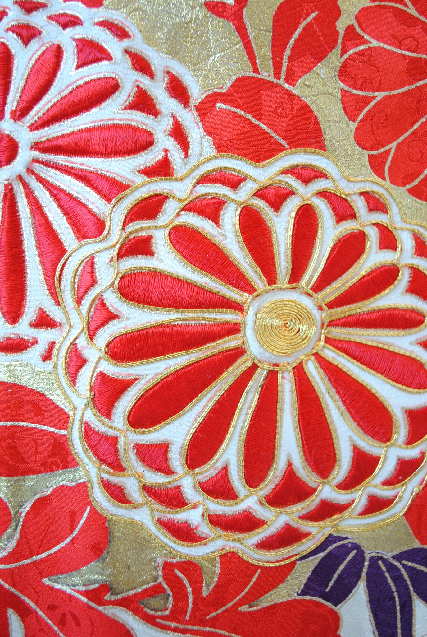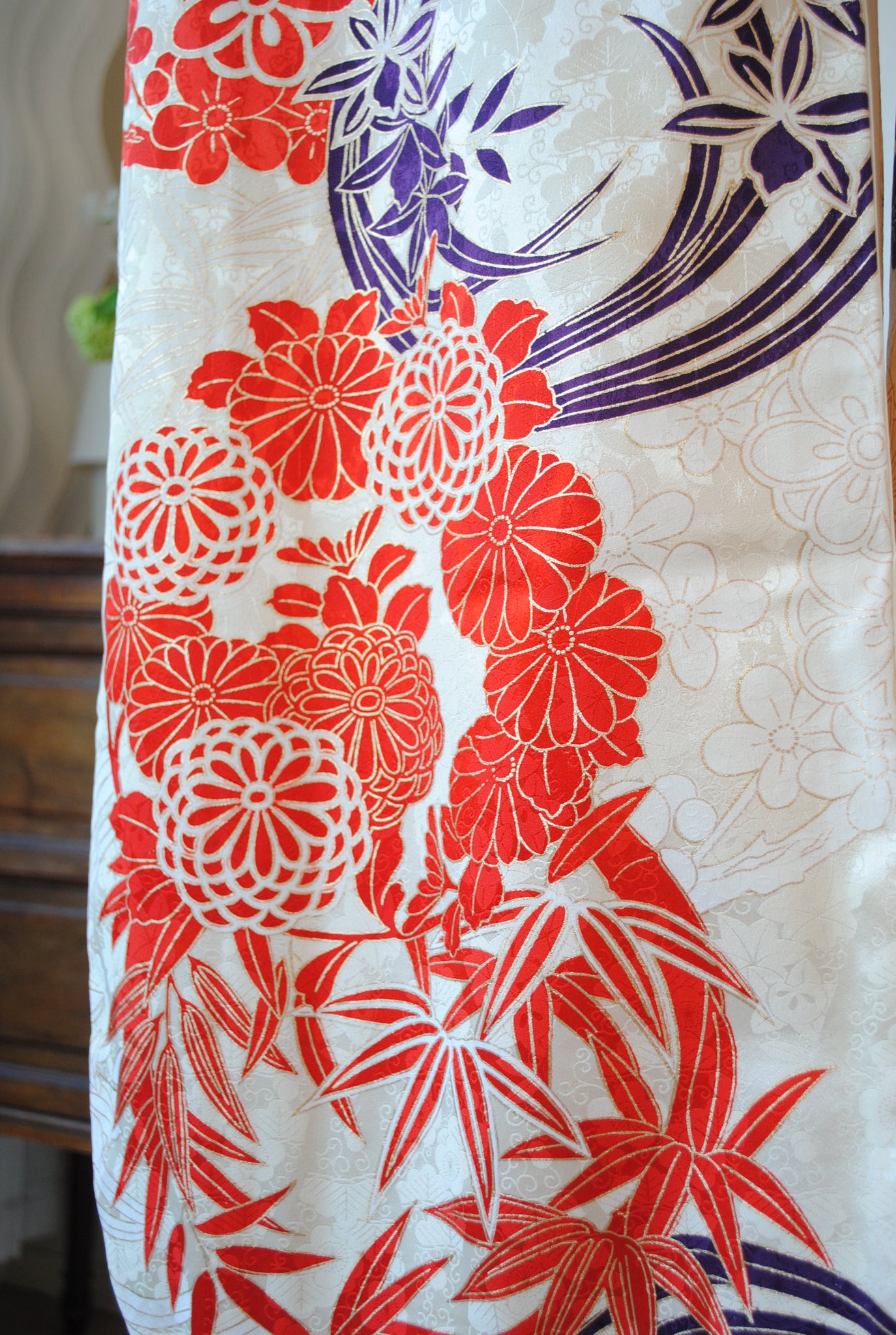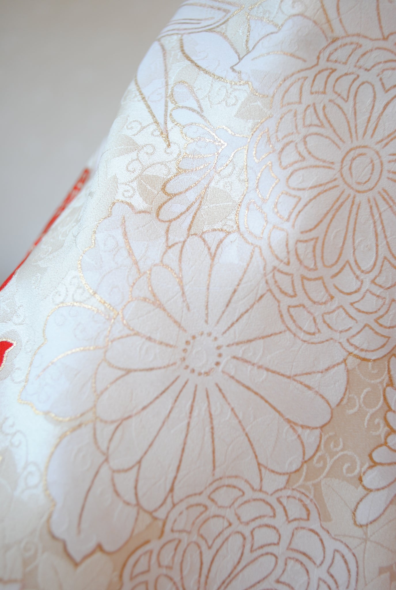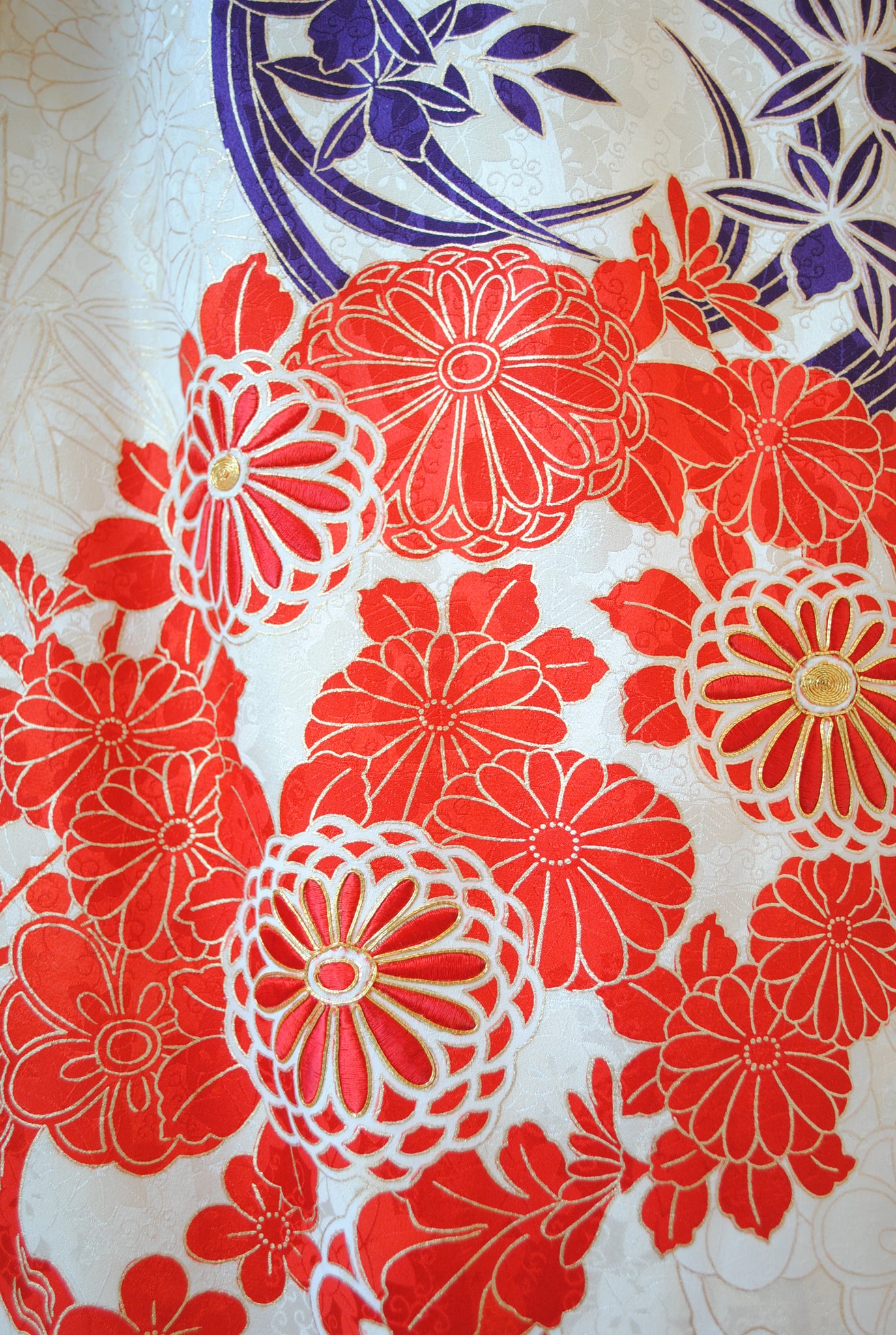 清らかな光沢をたたえた白綸子に、華やかな朱赤の花丸文が咲き誇る振袖です。