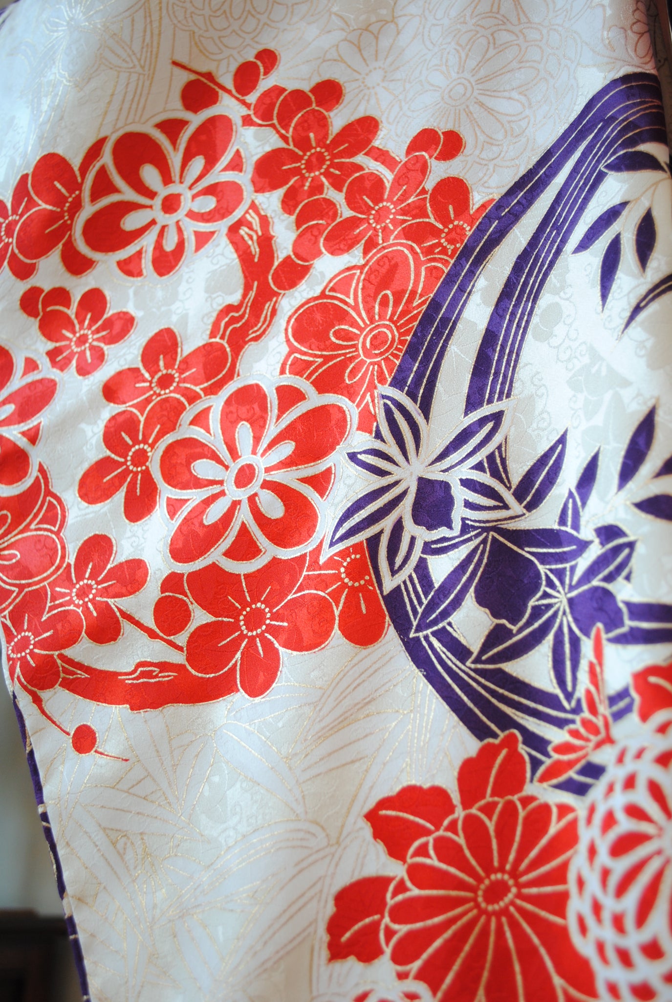 意匠は格調高い四君子文様。梅・蘭・竹・菊それぞれの植物が持つ気品を、理想の人格になぞらえてきた古典の吉祥文様です。フォーマルシーンに相応しい品格を添えてくれます。