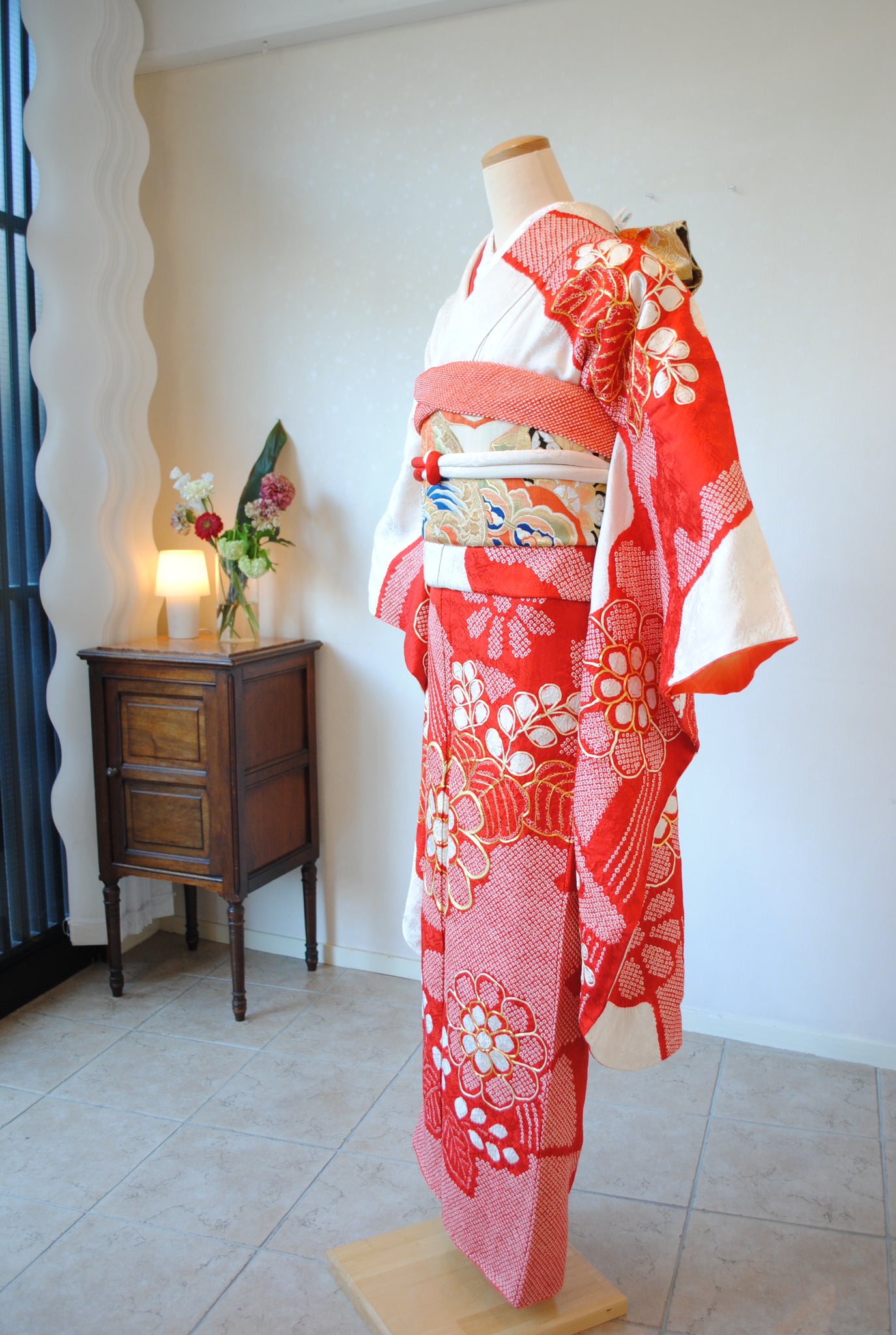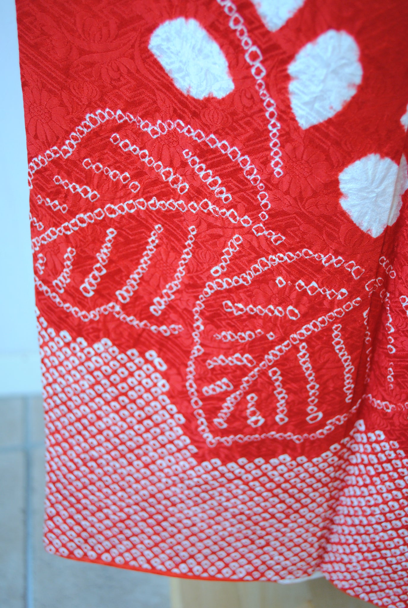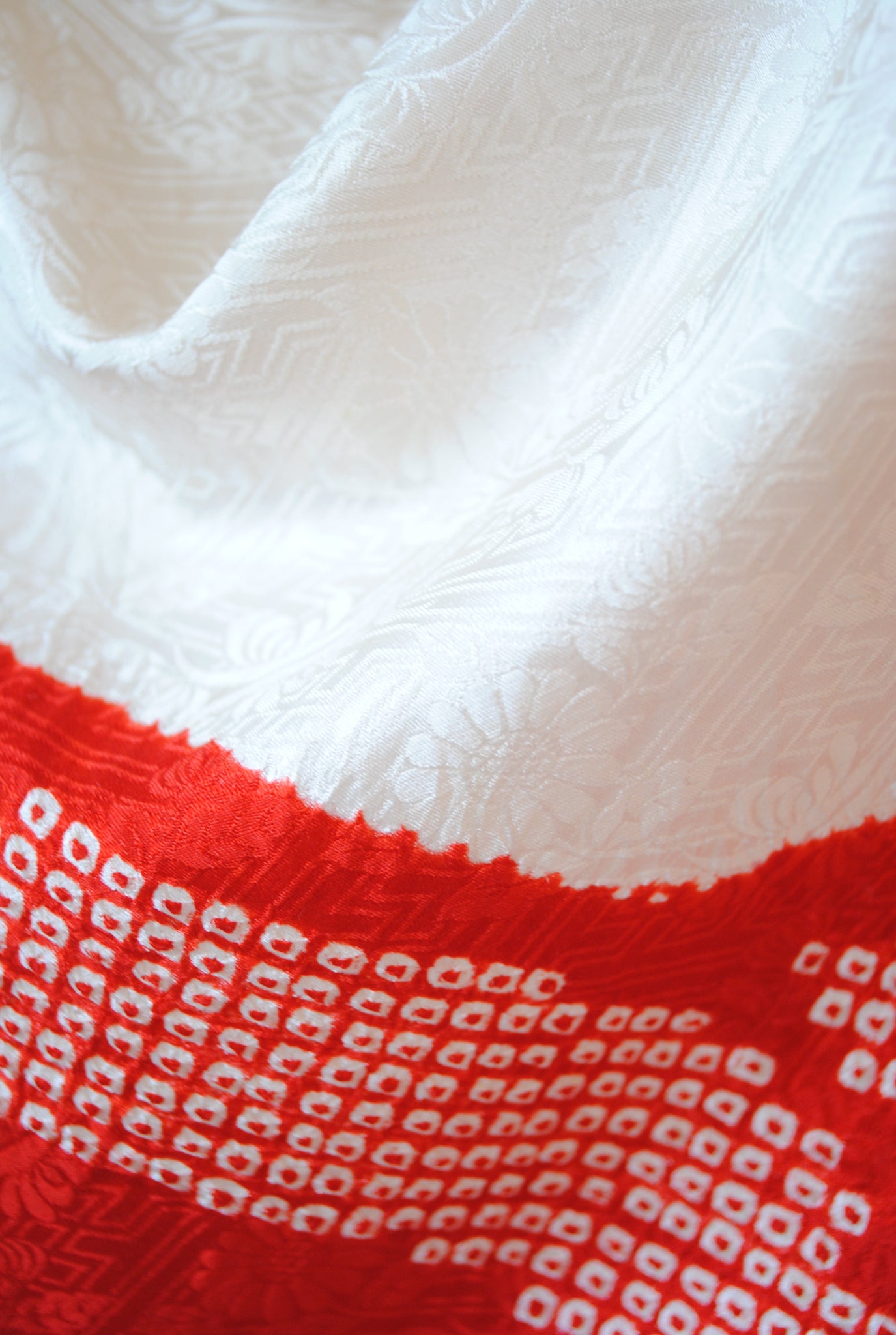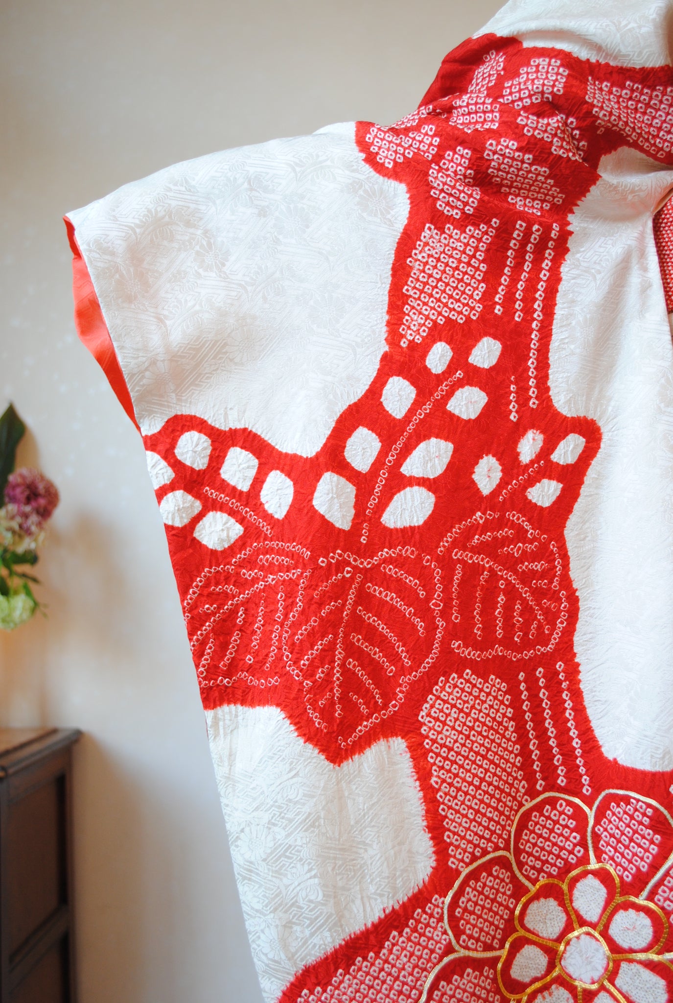 白の柔らかさを背景に、赤の絞りがくっきりと浮かび上がる一着。絞りならではの風格が、装いに上質さをもたらしています。