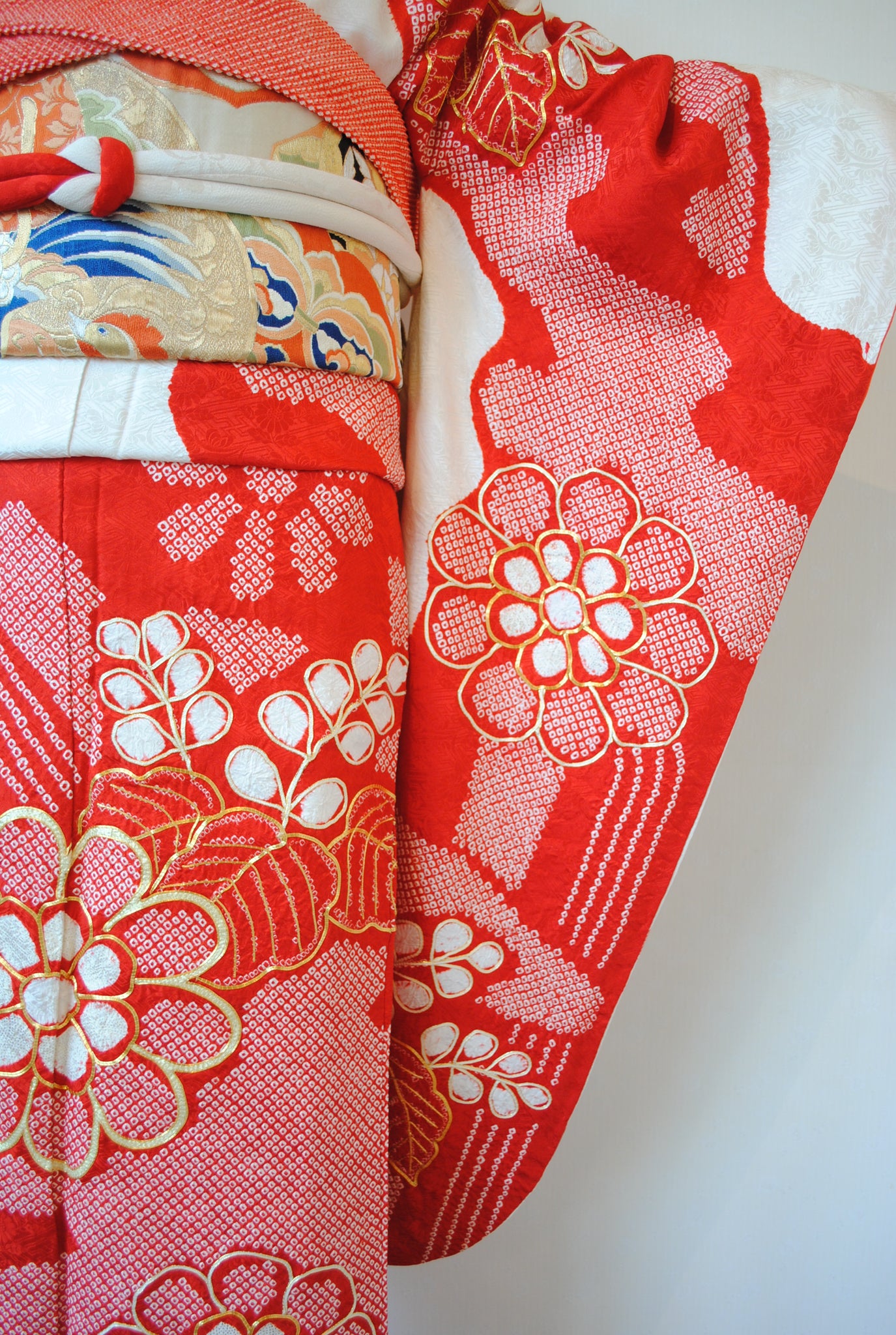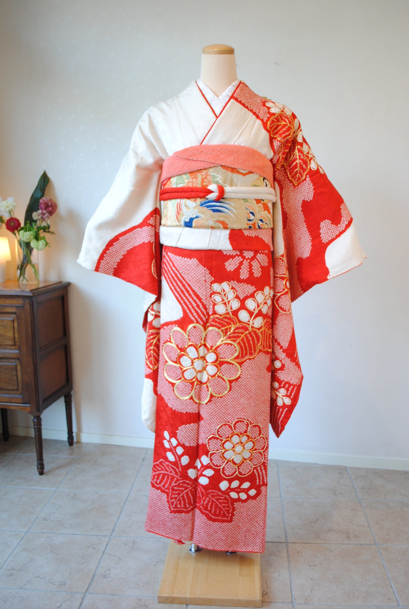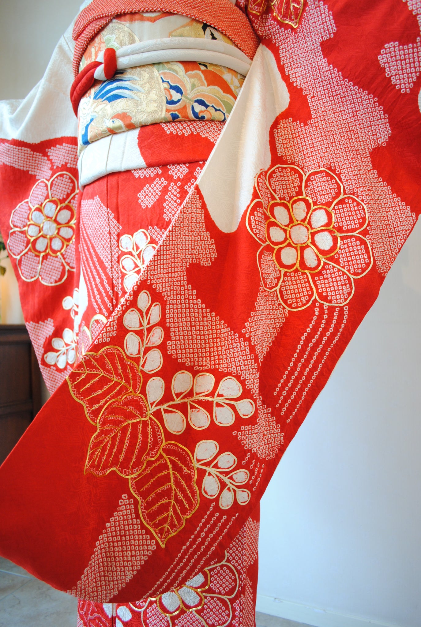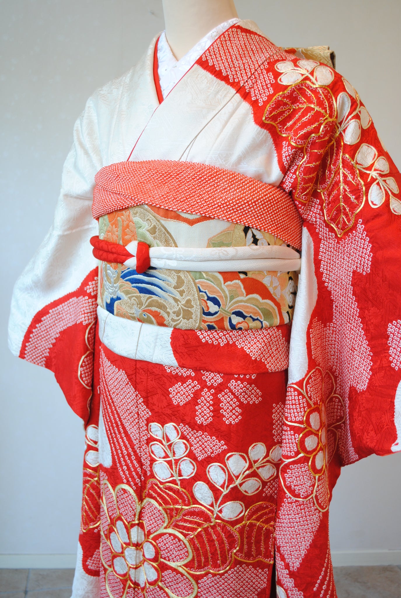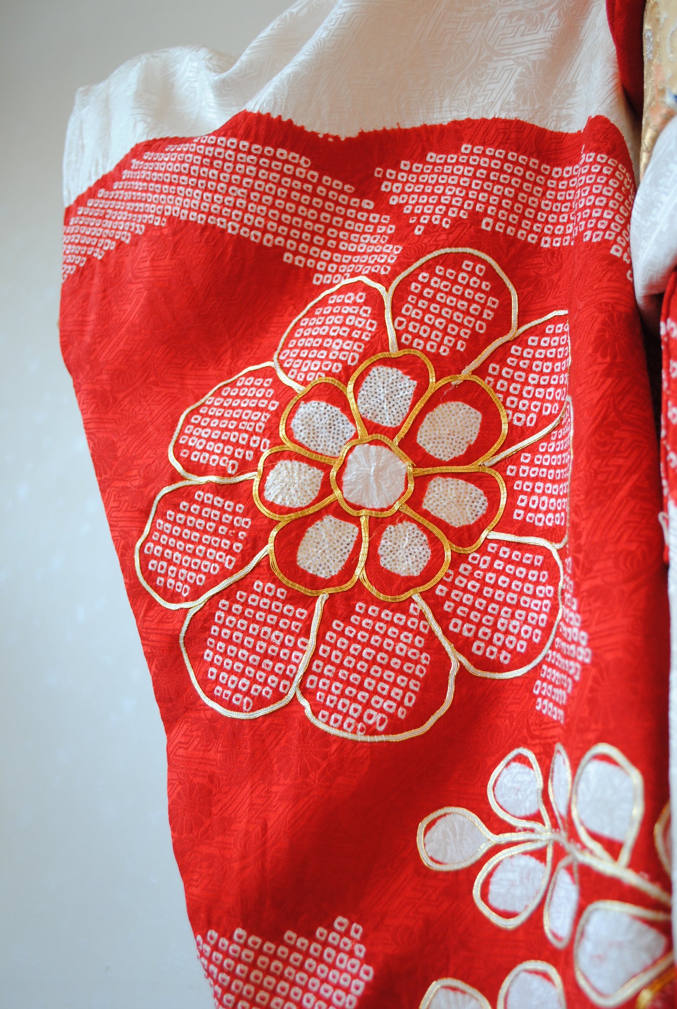 白の柔らかさを背景に、赤の絞りがくっきりと浮かび上がる一着。絞りならではの風格が、装いに上質さをもたらしています。