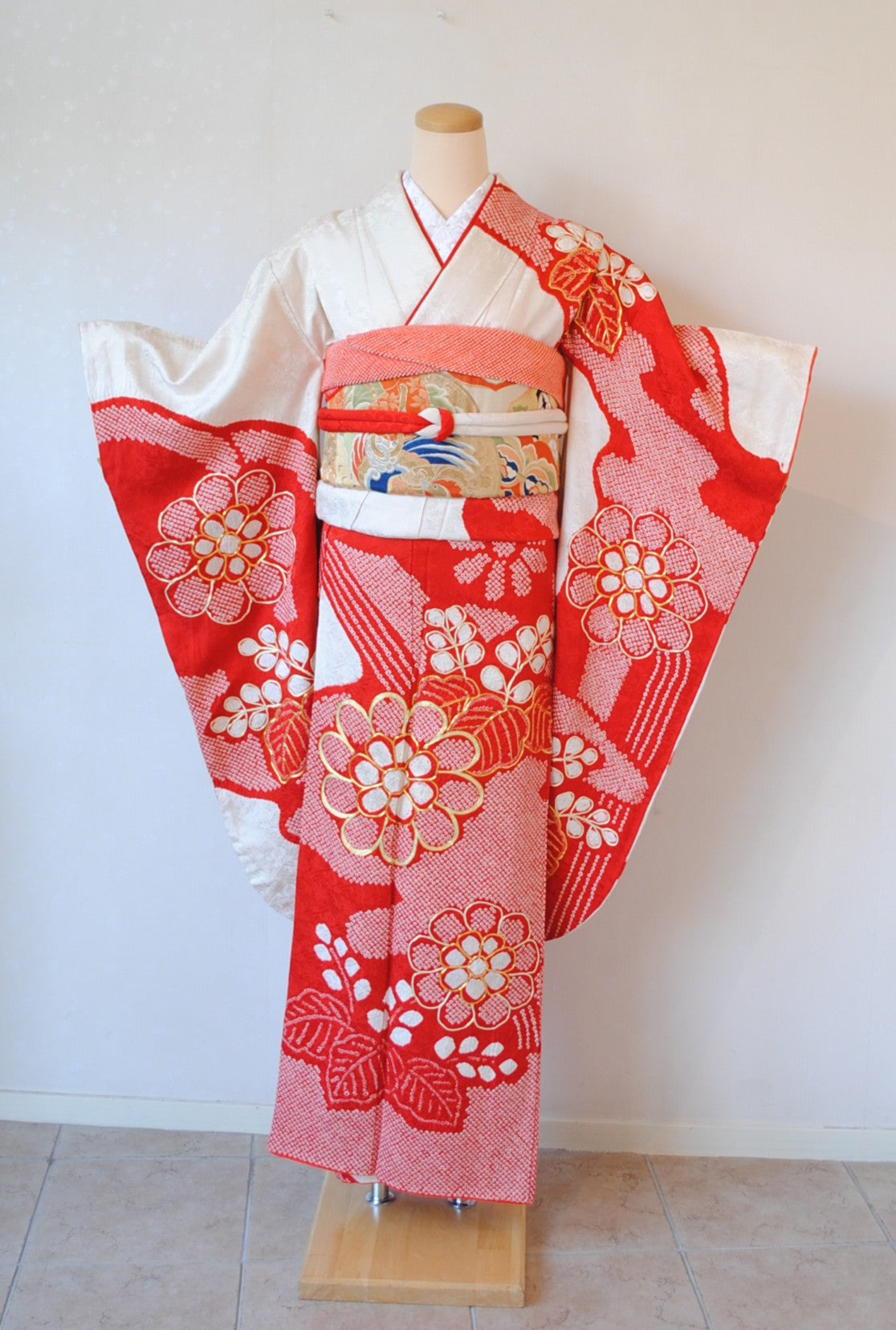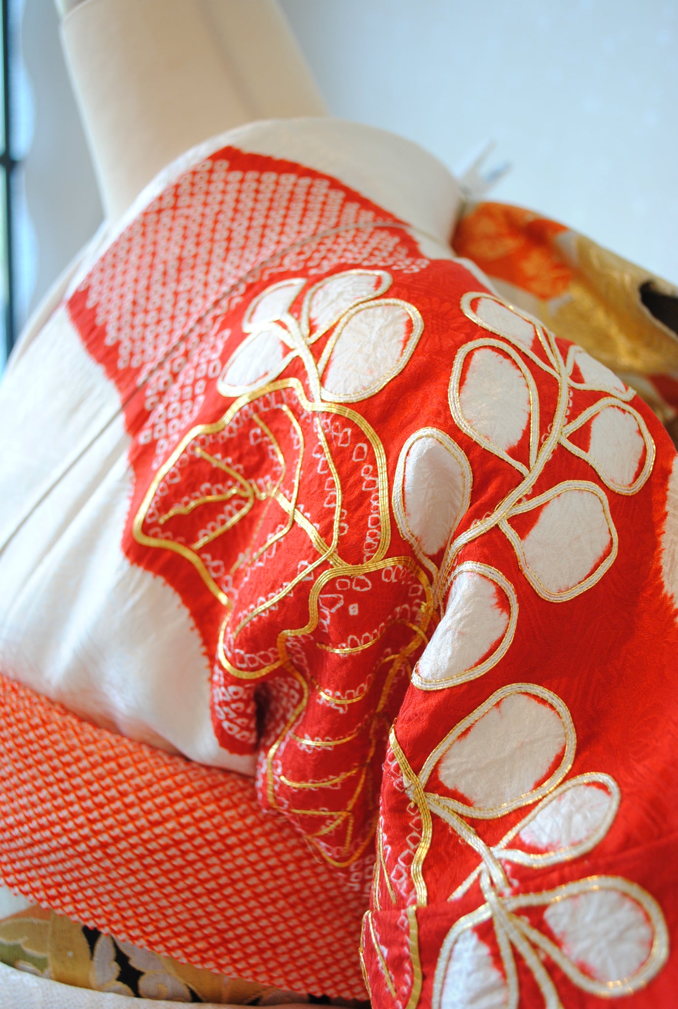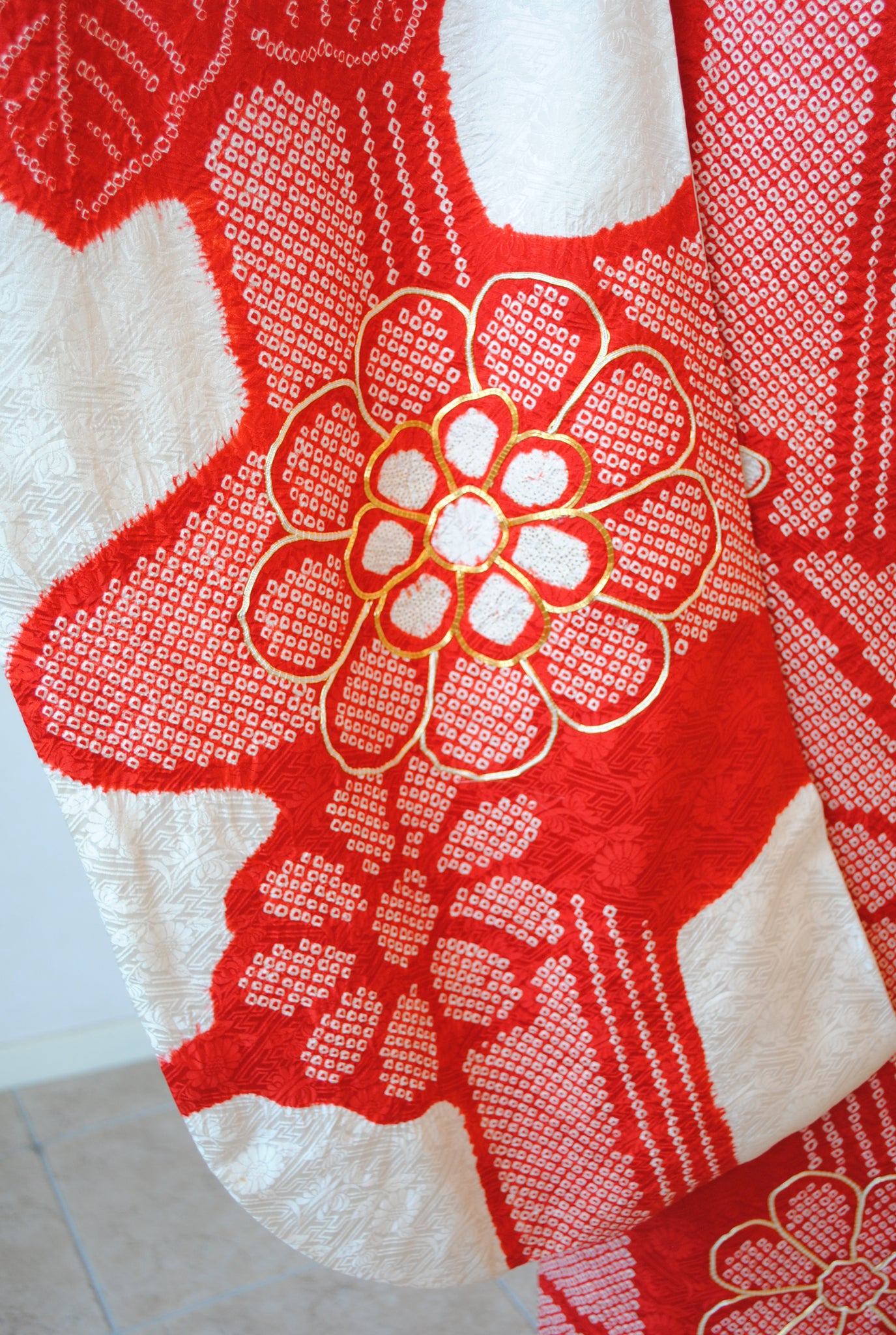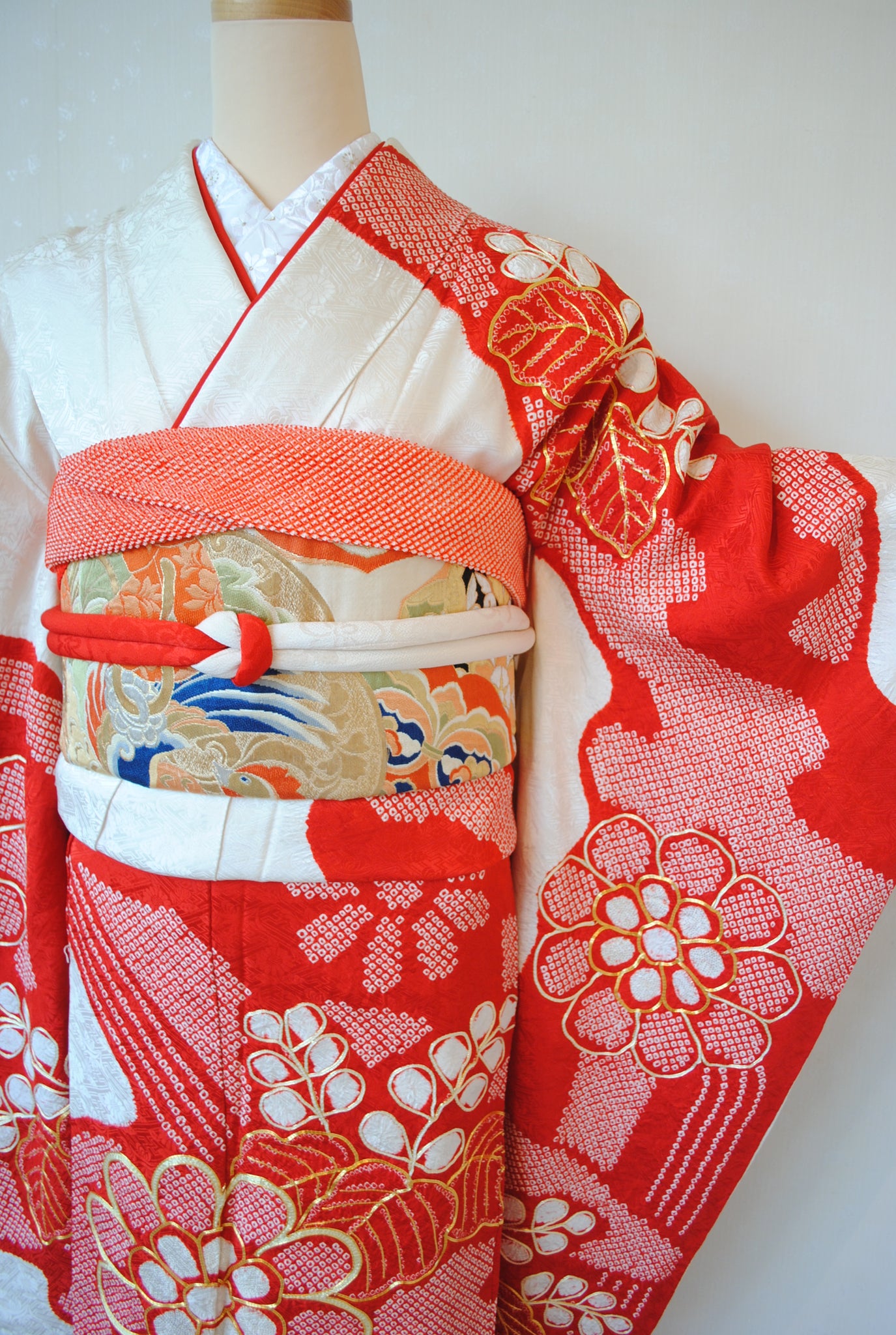 白の柔らかさを背景に、赤の絞りがくっきりと浮かび上がる一着。絞りならではの風格が、装いに上質さをもたらしています。