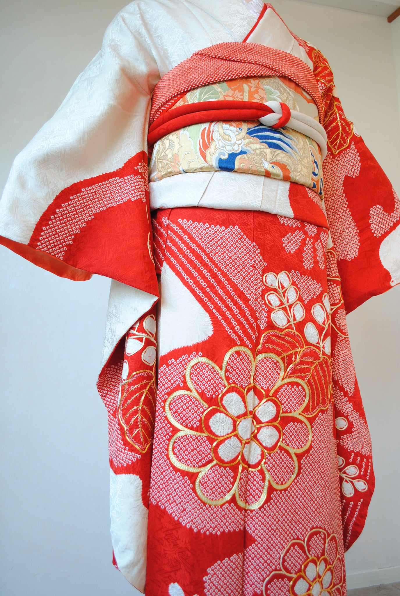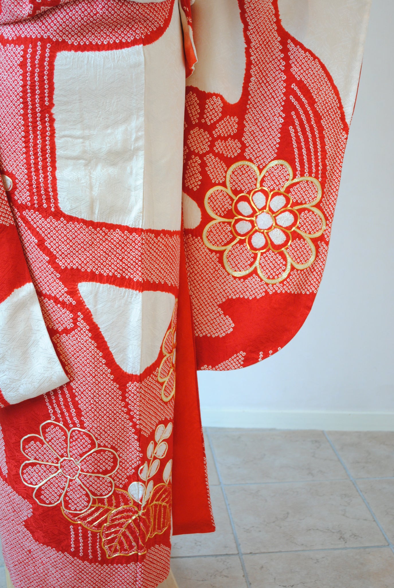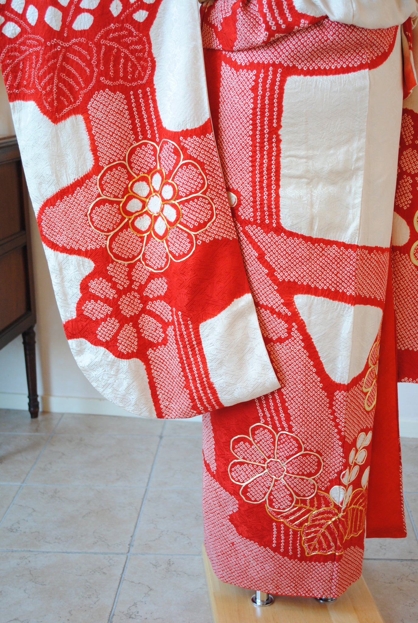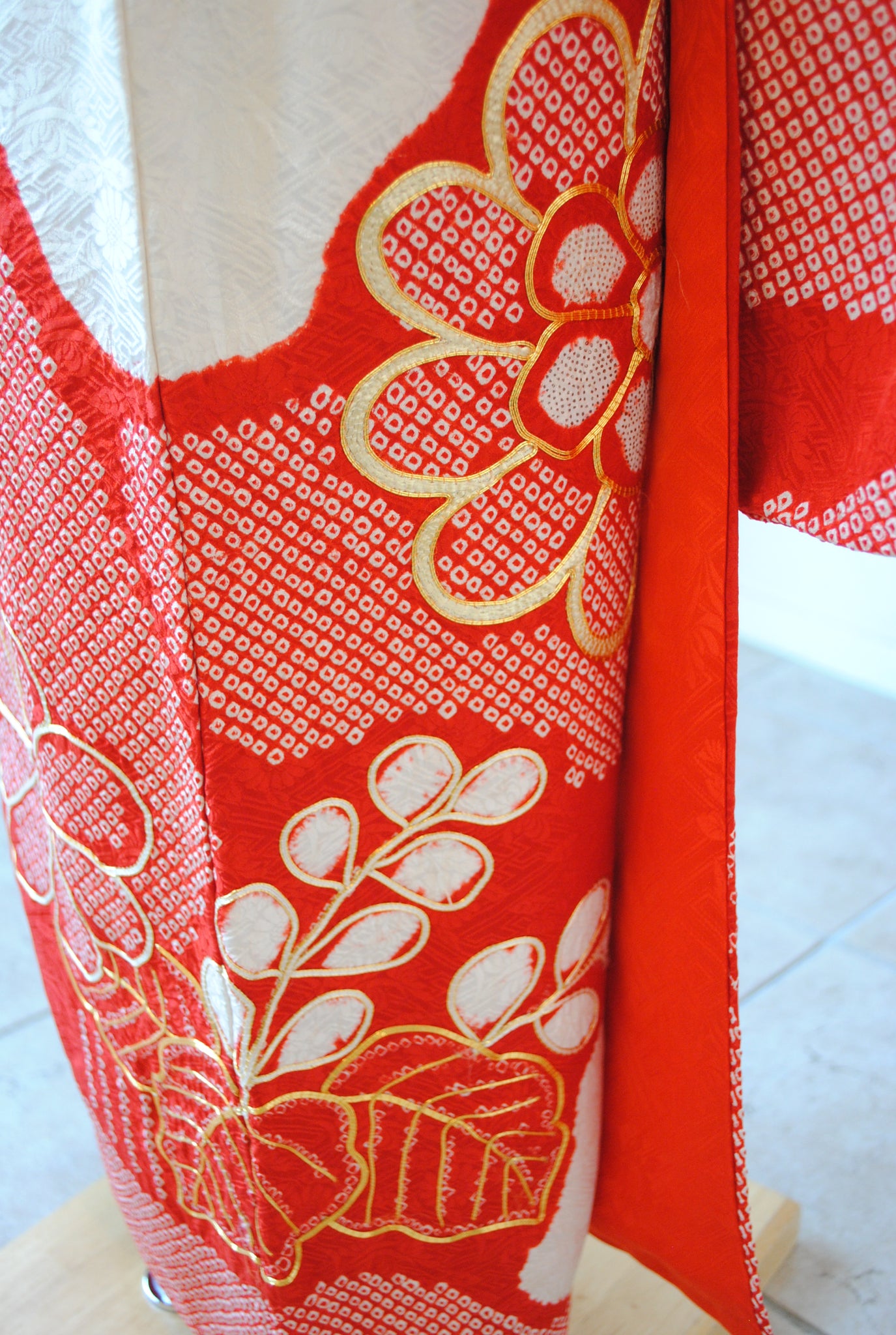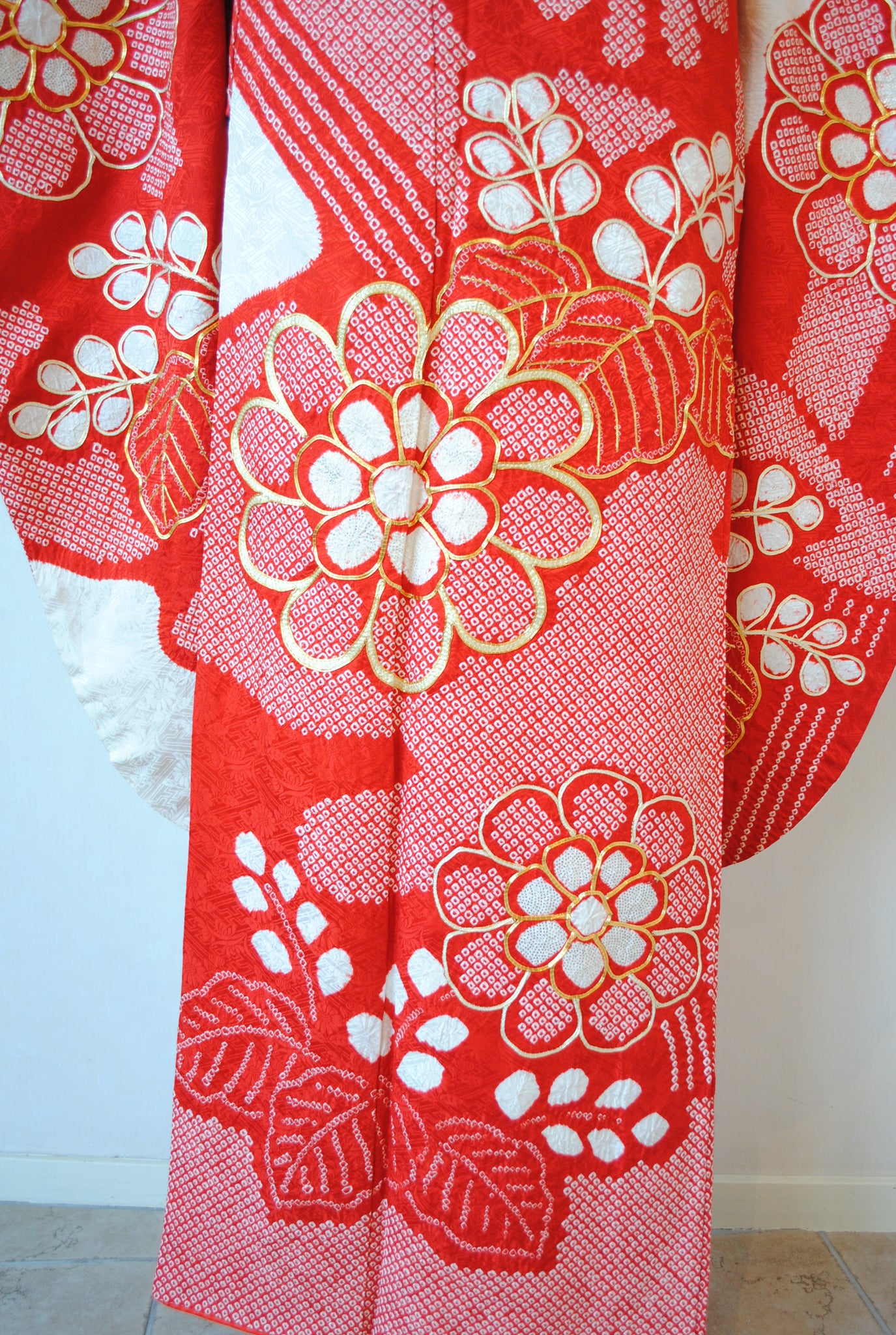 白の柔らかさを背景に、赤の絞りがくっきりと浮かび上がる一着。絞りならではの風格が、装いに上質さをもたらしています。