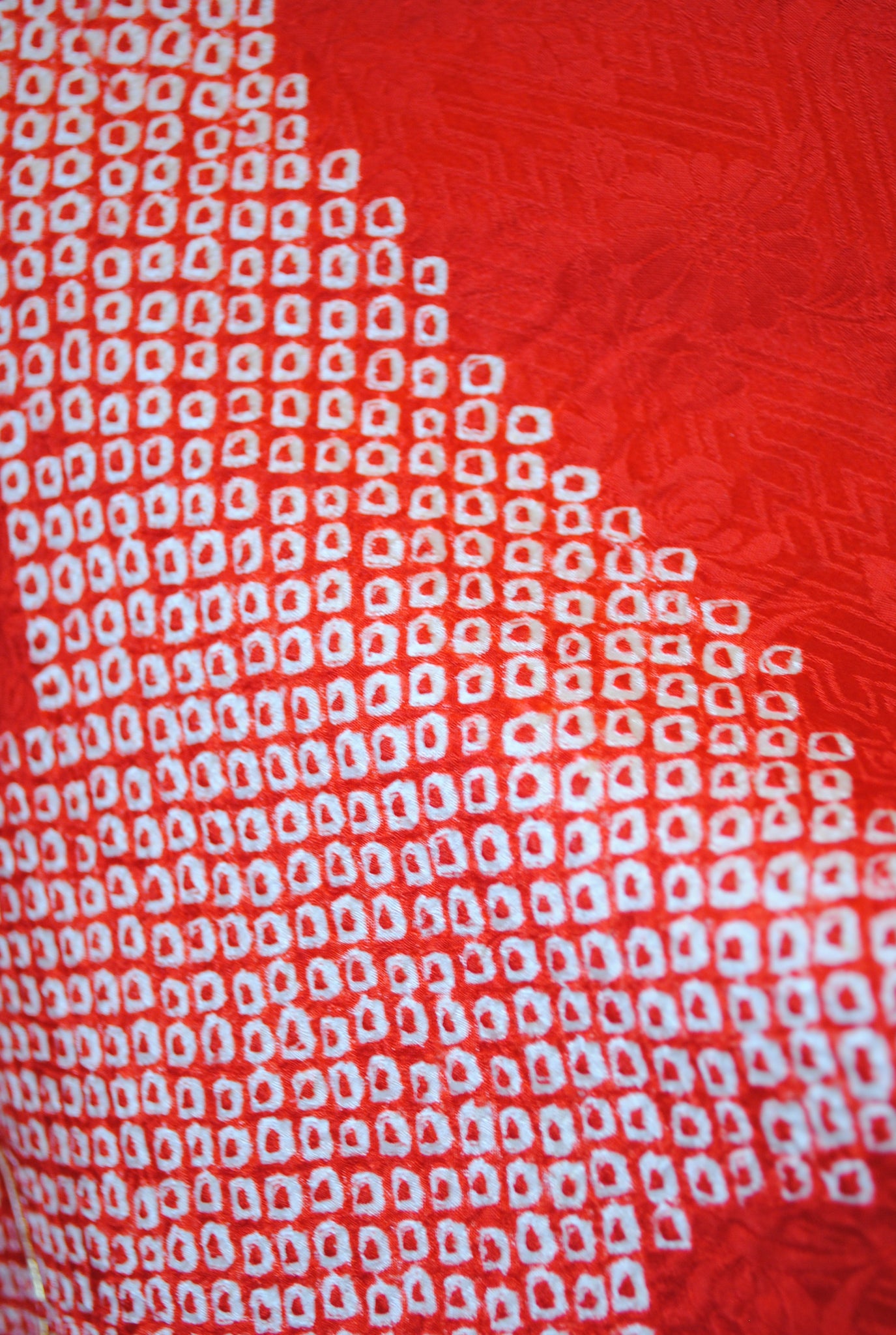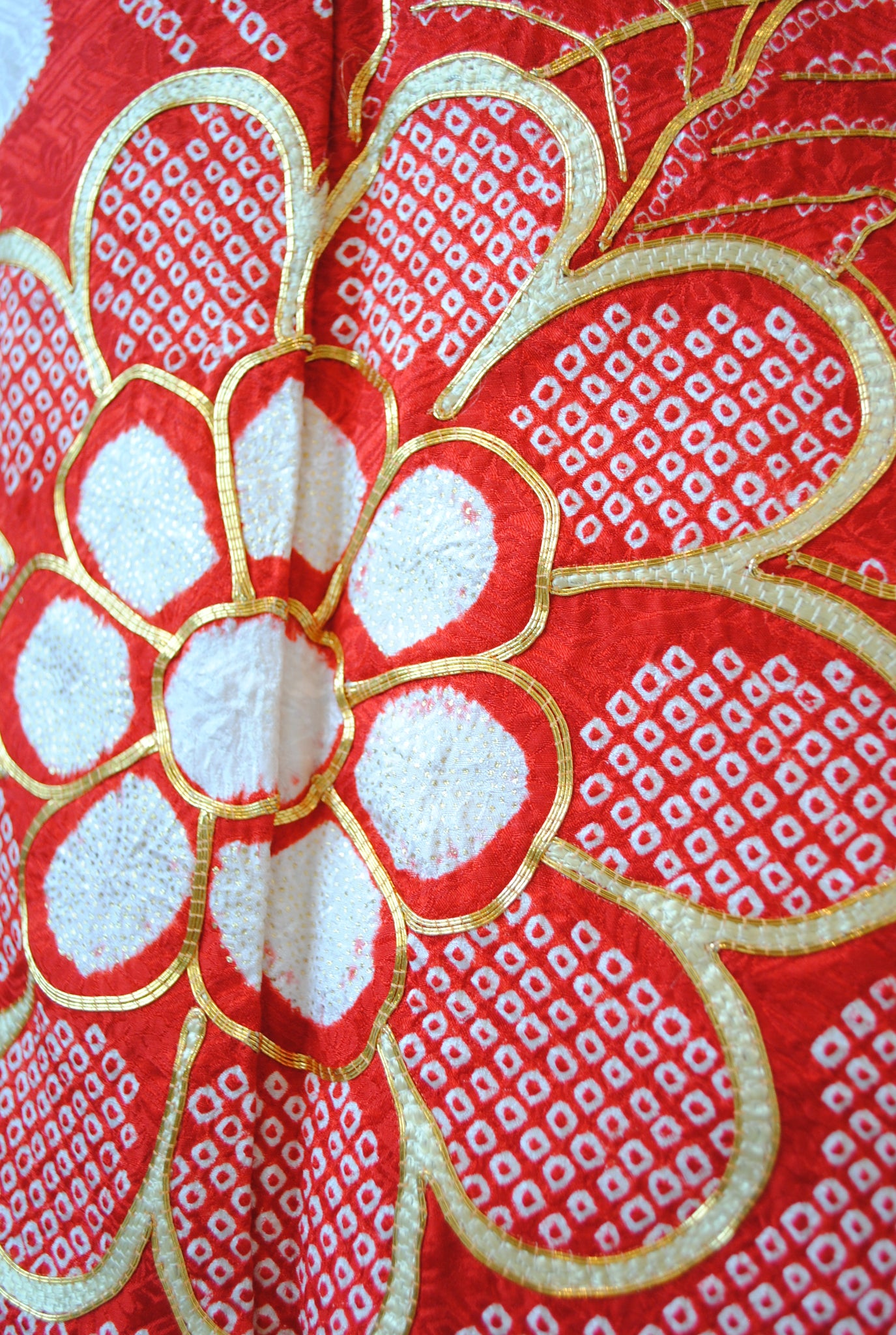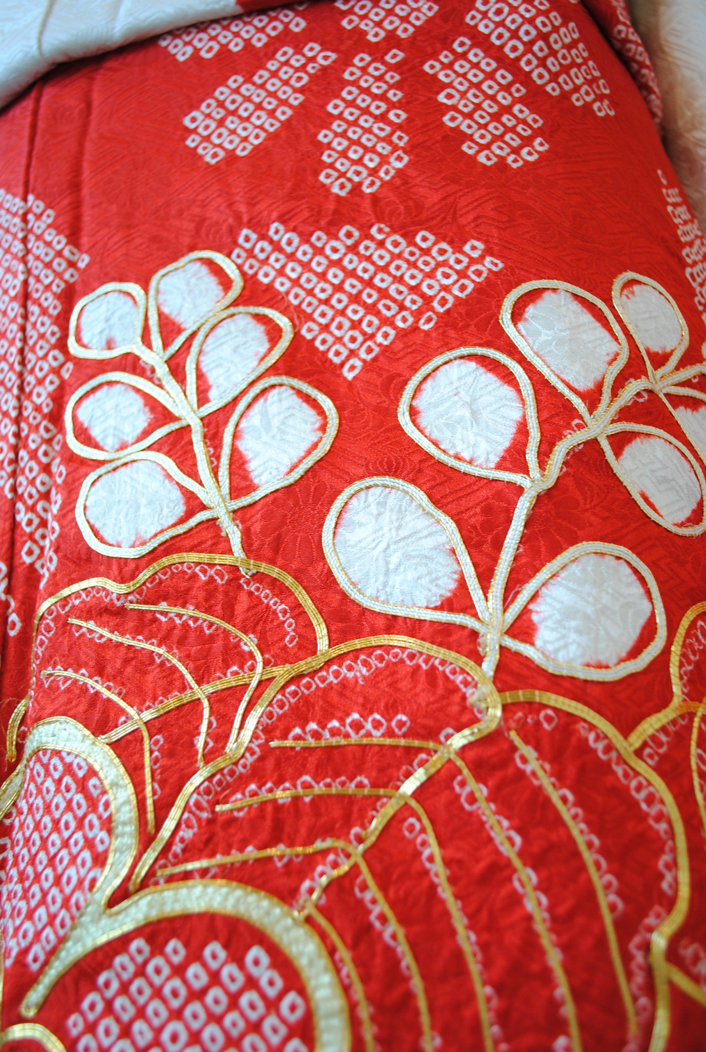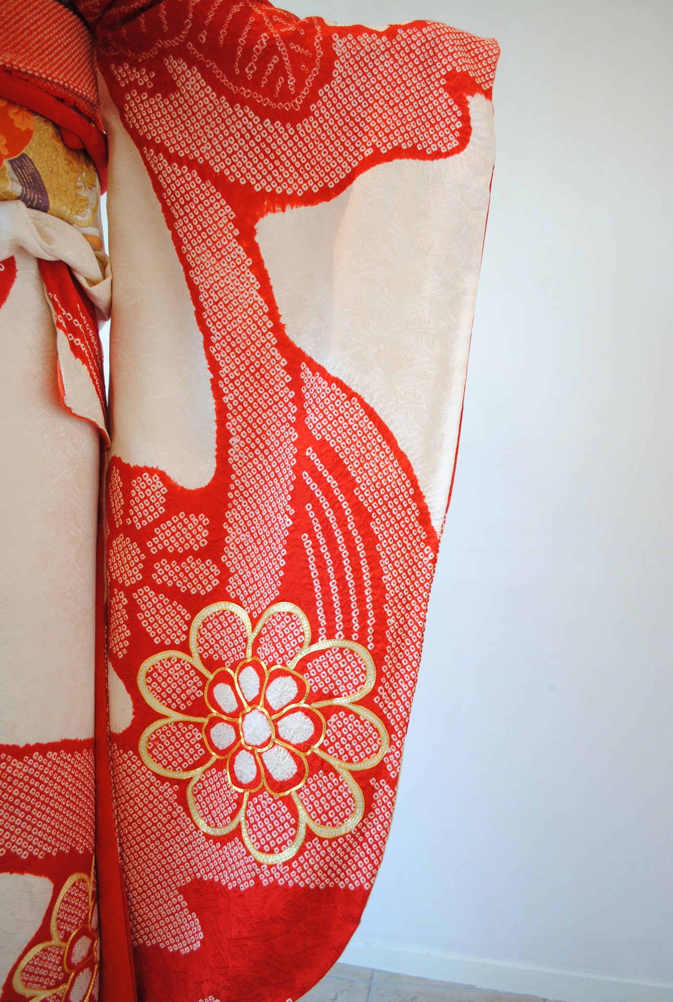 白の柔らかさを背景に、赤の絞りがくっきりと浮かび上がる一着。絞りならではの風格が、装いに上質さをもたらしています。